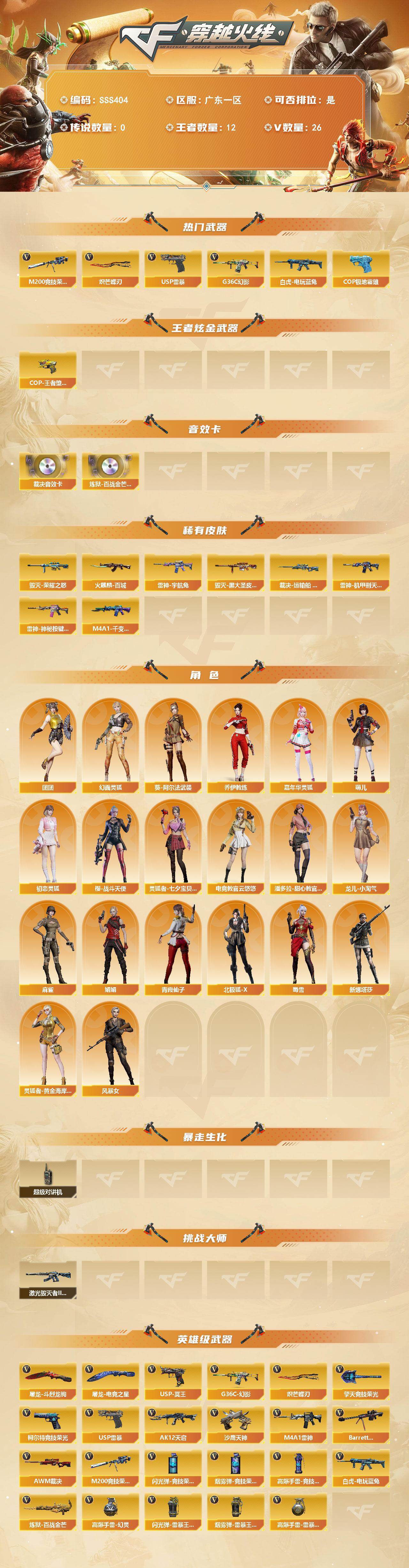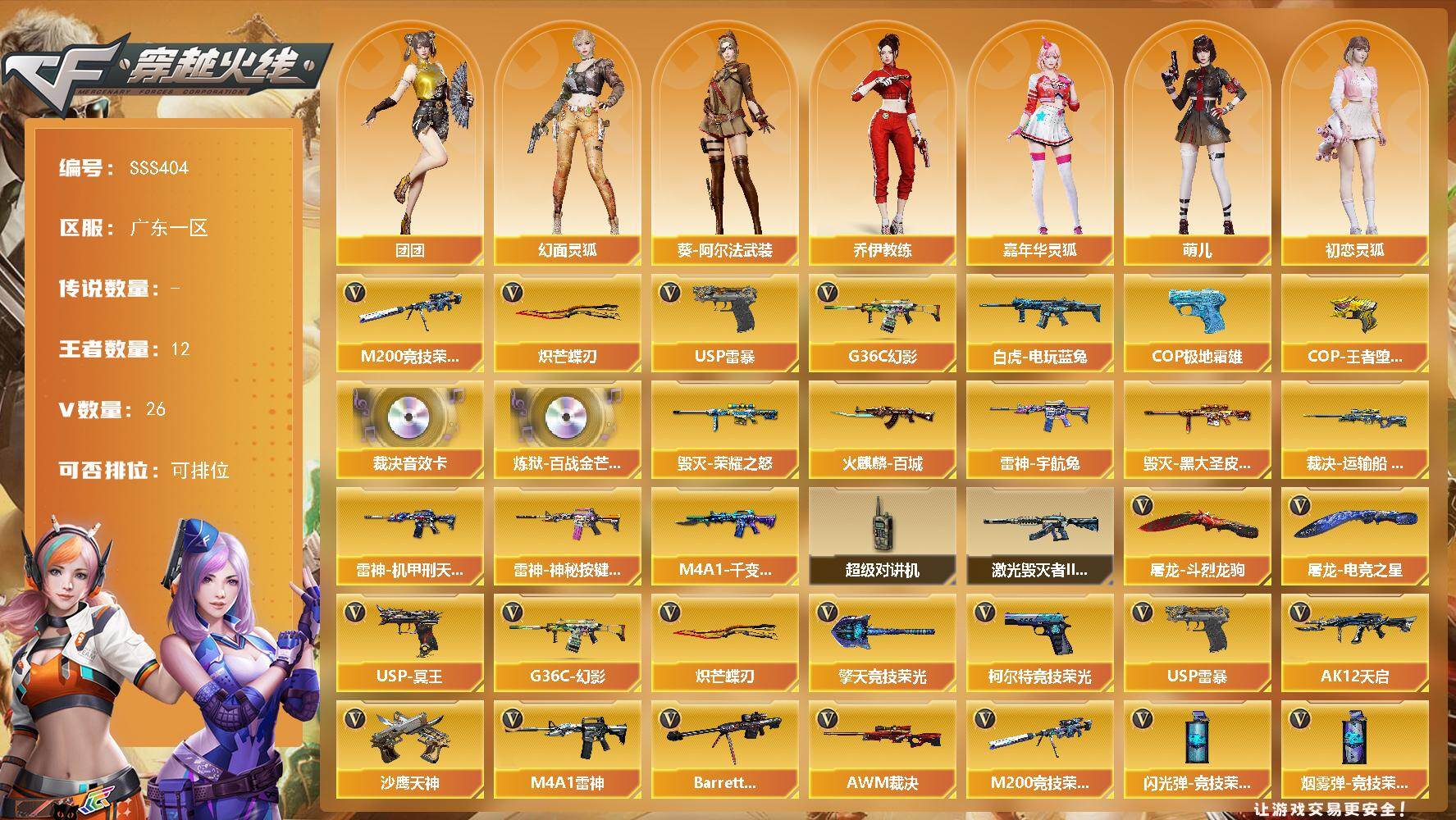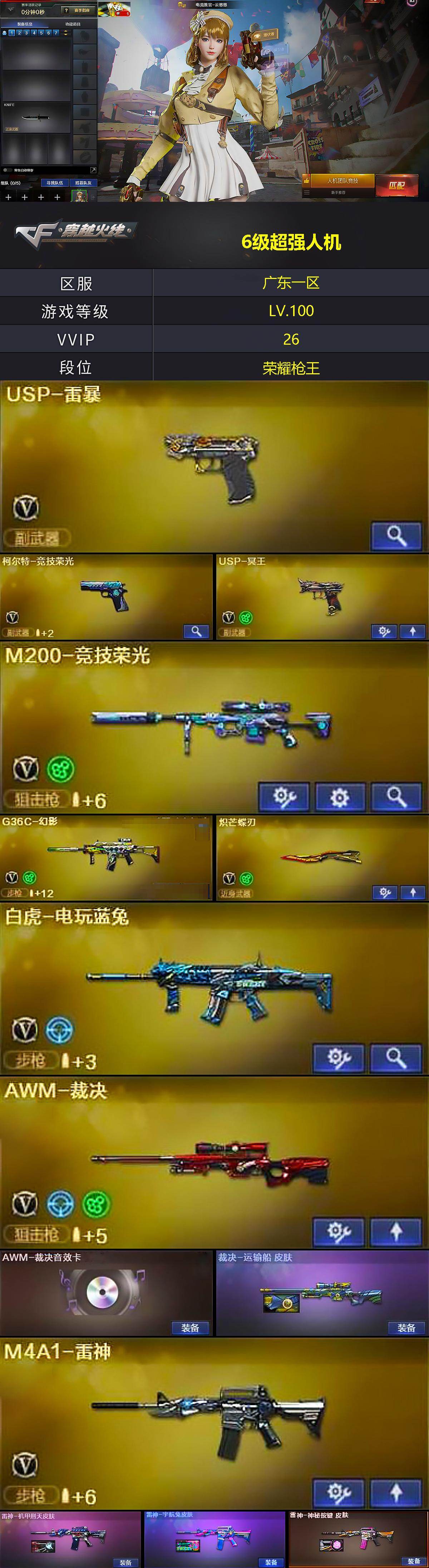 [17997169]广东一区-27V-12王者武器数-0炫金武器数 【热门武器】:G36C-幻影,M200-竞技荣光,白虎-电玩蓝兔,USP-雷暴,炽芒蝶刃,COP 357-极地霜雄 【王者炫金武器】:COP-王者堕天神 【音效卡】:AWM-裁决音效卡,炼狱-百战金芒-庆典舞曲音效卡 【皮肤】:裁决-运输船 皮肤,雷神-机甲刑天皮肤,雷神-宇航兔皮肤,雷神-神秘按键 皮肤,火麒麟-百城,毁灭-荣耀之怒,毁灭-黑大圣皮肤,M4A1-千变-孔明皮肤 【角色】:电竞教官-云悠悠,乔伊教练,葵-阿尔法武装,幻面灵狐,北极狐-X,初恋灵狐,风暴女,嘉年华灵狐,娟娟,灵狐者-黄金海岸,灵狐者-七夕宝贝,龙儿-小淘气,麻雀,萌儿,潘多拉-甜心教官,青霞仙子,蜀雪,新娜塔莎,樱-战斗天使,团团 【暴走生化】:超级对讲机 【挑战大师】:激光毁灭者III-白马银枪 【英雄级武器】:M4A1-雷神,AK12-天启,G36C-幻影,白虎-电玩蓝兔,Barrett-毁灭,AWM-裁决,M200-竞技荣光,炼狱-百战金芒,沙鹰-天神*2,USP-雷暴,柯尔特-竞技荣光,USP-冥王,擎天-竞技荣光,炽芒蝶刃,屠龙-电竞之星,屠龙-斗烈龙驹,高爆手雷-幻灵,高爆手雷-竞技荣光,高爆手雷-雷暴王者*2,闪光弹-竞技荣光*3,闪光弹-雷暴王者*2,烟雾弹-竞技荣光,烟雾弹-雷暴王者*2 【道具】:炫彩背包,百战金芒炫彩背包,超级背包,变异宝贝,妖姬,夺命之镰,防化服,金色流光-枪王排位,语音特效-盛典烟火,动感闪耀表情,防弹头盔,防弹衣,C4工具钳,手雷包 【特殊枪械】: