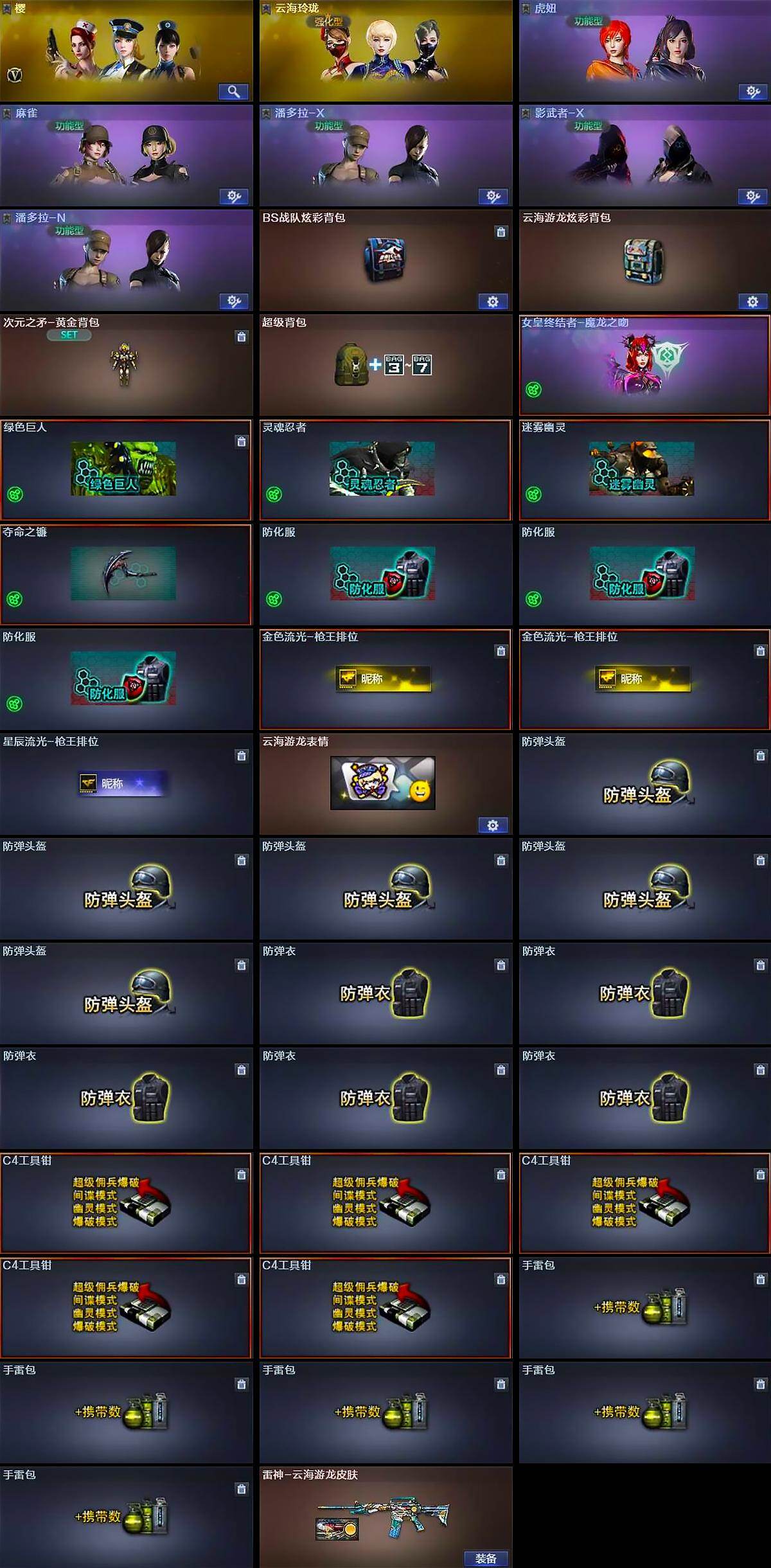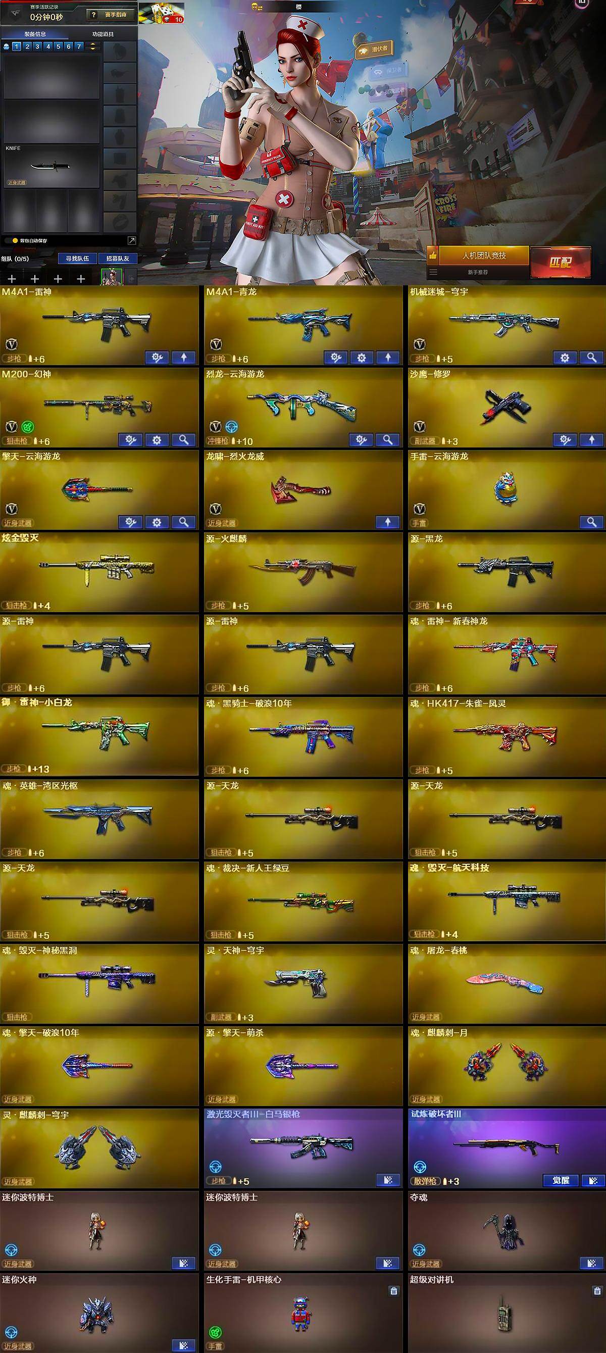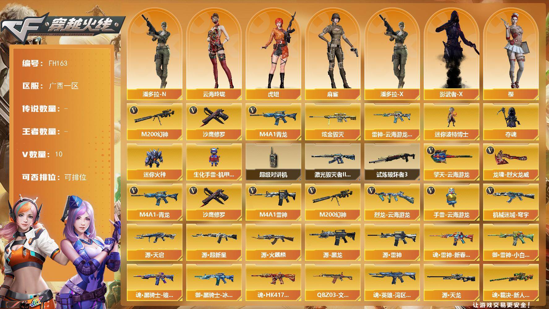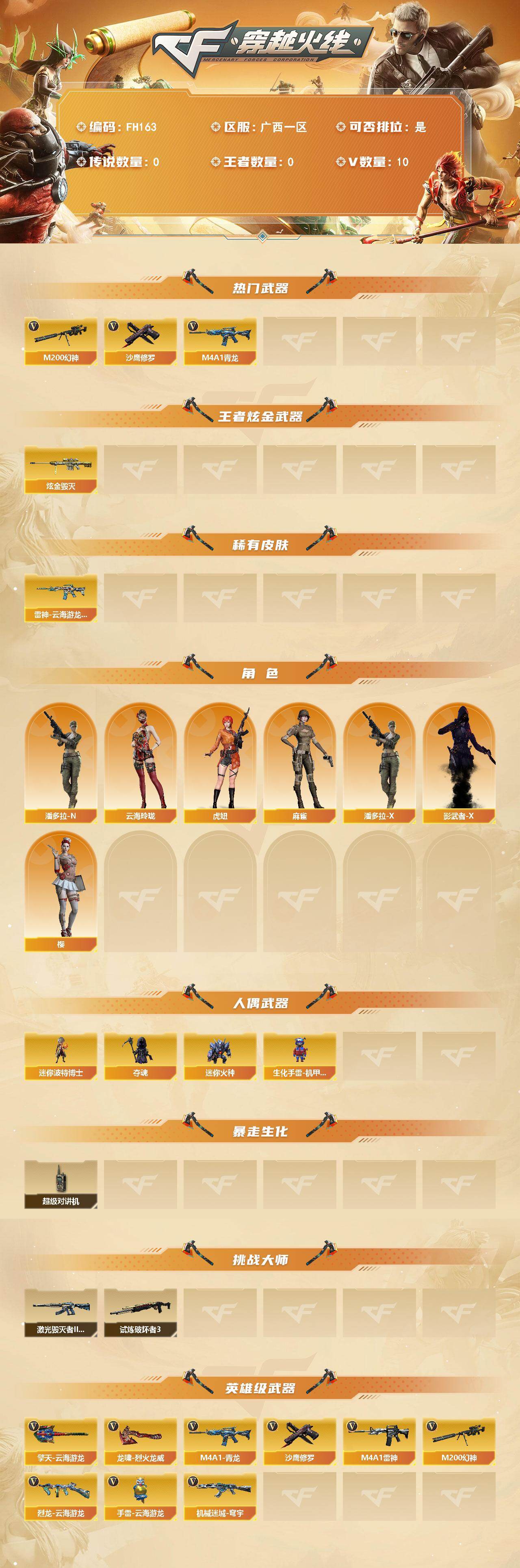 - [14644514]江苏一区-102V-50王者-0炫金 【传说武器】:传说光耀(序列号版),传说暗裔,传说圣灵,传说梦魇 【传说角色】:传说星骇 【热门武器】:传说光耀,传说暗裔,传说梦魇,传说圣灵,G36C-幻影,QBZ03-金色蔷薇,M200-幻神,柯尔特-荣耀世冠白鲨2023,M200-竞技荣光,死亡之眼,白虎-电玩蓝兔,柯尔特-冠军之特,Cat-刀锋,牛牛-AK47,M4A1-黑骑士,汤姆逊-烈龙*7,RPK-盘龙*6,加特林-炼狱,斯泰尔-蝴蝶,毁灭-孙三炮,COP-白鲨,USP-雷暴,COP 357-幻灵*2,沙鹰-修罗,Knife-冠军之刃,炽芒蝶刃,炽芒蝶刃-荣耀世冠白鲨2023 皮肤,黄金猫猫手套-白鲨 【王者炫金武器】:王者之城,天启-悦智*2,王者之武,玫瑰精灵-悦动*2,王者之怒,盘龙-悦心*2,王者之击 【音效卡】:M200-幻神音效卡,AK47-火麒麟音效卡,M4A1-雷神音效卡,M4A1-黑骑士音效卡,Barrett-毁灭音效卡 【皮肤】:M200-幻神-黄忠皮肤,幻神-冠军之幻,幻神-青鹤,幻神-宠儿-2021MVP,M200-幻神-荣耀世冠白鲨,幻神-纸灯龙皮肤,幻神-电流骇客 皮肤,幻神-荣耀世冠白鲨2023 皮肤,幻神-AG-CFPL S24冠军 皮肤,幻神-荣耀世冠EP 皮肤,QBZ03-冠军之薇,QBZ03-AG-CFPLS19冠军,QBZ03-荣耀世冠白鲨,裁决-运输船 皮肤,雷神-暗月,雷神-荣耀之魄,雷神-冠军之魄,雷神-传奇N9,雷神-宠儿-2019MVP,雷神-R.LGD-CFPLS18冠军,雷神-宇航兔皮肤,火麒麟-AG战队皮肤,传奇石头-横秒之巅,火麒麟-平天大圣,火麒麟-盘古,火麒麟-百城,火麒麟-心动糖果,毁灭-荣耀之怒,毁灭-冠军之怒,毁灭-SV-CFPLS16冠军,毁灭-BEAN-2020MVP,毁灭-风暴,黑骑士-冠军之势,黑骑士-战神马超,黑骑士-AG-S4冠军典藏,M4A1-黑骑士-娜塔莉娅 皮肤,玫瑰精灵-蓝调梦幻 皮肤,战神-粉色甜心皮肤*2,战神-紫绶金章皮肤*3,战神-流金岁月皮肤,AK47-B-常胜将军-曹操*2,AK47-B-常胜将军-刘备,AK47-B-常胜将军-孙权,天龙-能量核心,极光-能量核心,炼狱-月 皮肤,修罗-能量核心,屠龙-荣耀之锋,屠龙-春桃 皮肤,屠龙-惊鸿 皮肤,龙啸-冠军之啸,