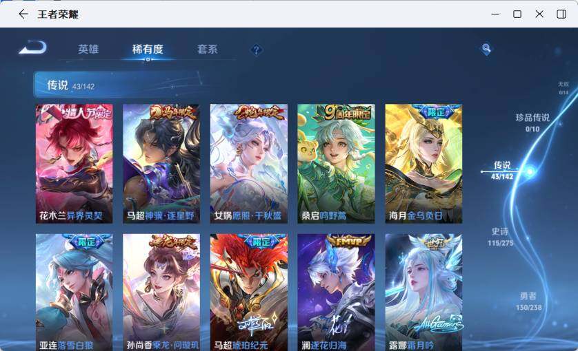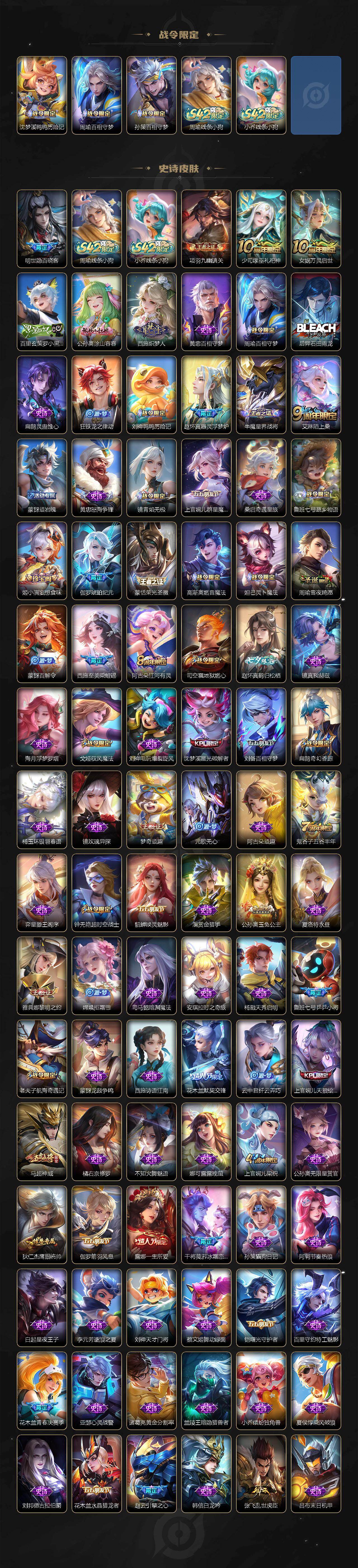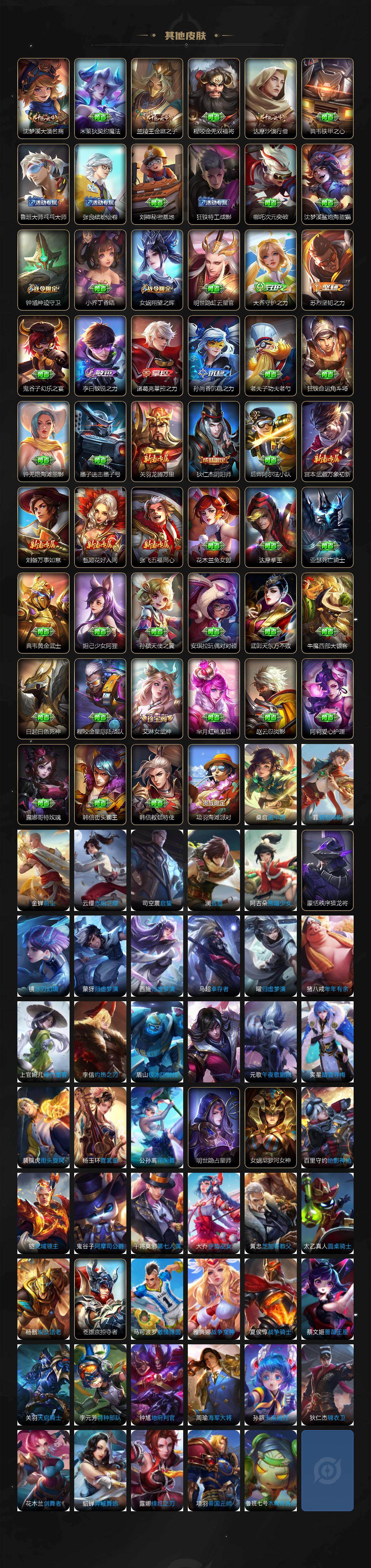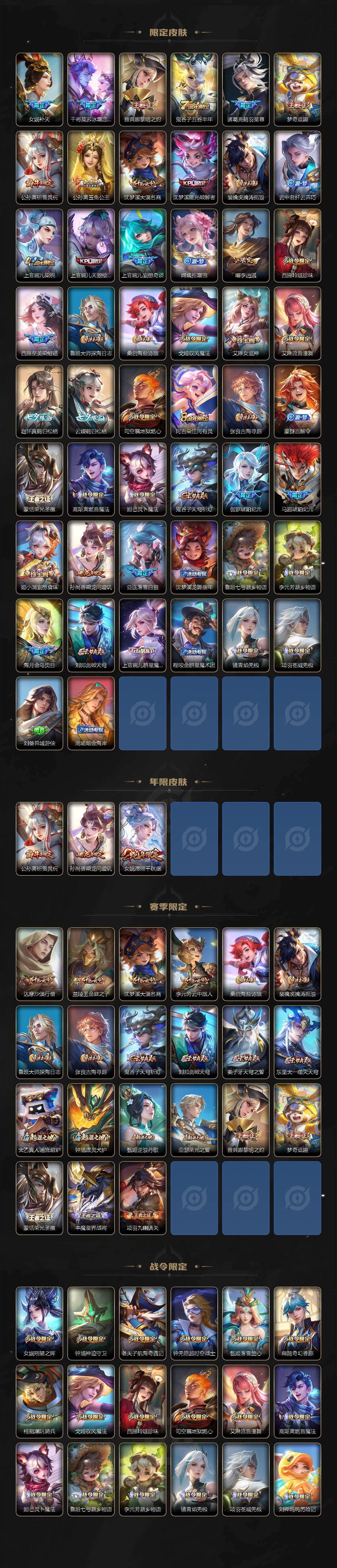 【限定皮肤】:蒙犽顽岩魄,大乔绒语心约,姜子牙天穹之誓,狄仁杰阴阳师,赵云皇家上将,赵云引擎之心,鲁班七号乒乒小将,钟无艳超时空战士,扁鹊奇幻香踪,吕布遇见神鼓,元歌无心,甄姬落雪兰心,马可波罗深海之息,马可波罗妄想实况,狄仁杰魔术师,达摩沙漠行僧,项羽海滩派对,老夫子航海奇遇记,关羽武圣,露娜一生所爱,兰陵王金庭之子,花木兰青春决赛季,花木兰默契交锋,娜可露露前尘镜,刘备百相守梦,李元芳云中旅人,虞姬启明星使,钟馗神迹守卫,杨戬潮玩骑兵,女娲朔望之晖,女娲补天,干将莫邪冰霜恋舞曲,雅典娜黎明之约,鬼谷子五谷丰年,诸葛亮鹤羽星尊,梦奇顽趣,公孙离祈雪灵祝,公孙离玉兔公主,沈梦溪大漠名商,沈梦溪匿光破解者,裴擒虎擒涛扼浪,云中君纤云弄巧,上官婉儿梁祝,上官婉儿天狼绘梦者,上官婉儿妄想奇谈,嫦娥拒霜思,曜李逍遥 ,西施玲珑珍味,西施至美乘鲤谣,鲁班大师探海日志,桑启海盐诗旅,戈娅驭风魔法,艾琳女武神,艾琳流音漫舞,赵怀真鹤归松栖,云缨鹤归松栖,司空震地狱燃心,阿古朵江河有灵,张良古海寻踪,蒙犽百解令,蒙恬荣光圣徽,高渐离燃音魔法,妲己灵卜魔法,鬼谷子天穹祈灯,伽罗琥珀纪元,马超琥珀纪元,姬小满妄想食味,孙尚香乘龙问璇玑,亚连落雪白狼,沈梦溪龙舞盛年,鲁班七号蔬