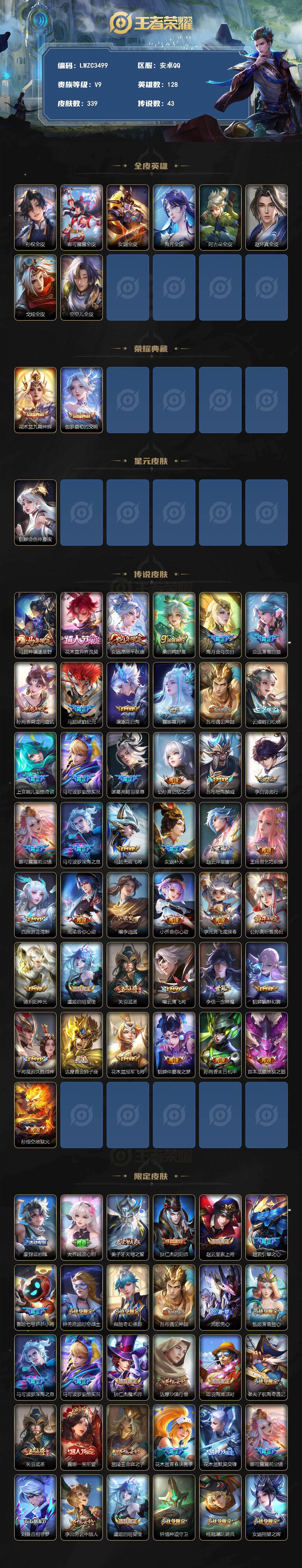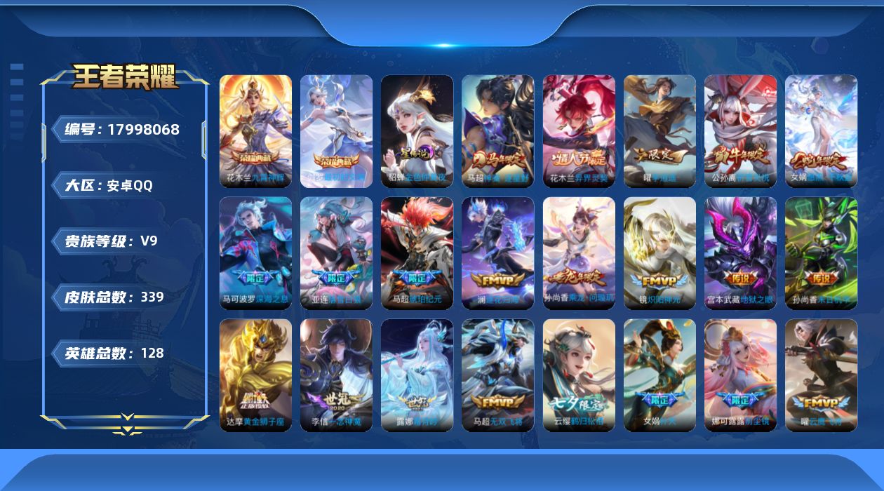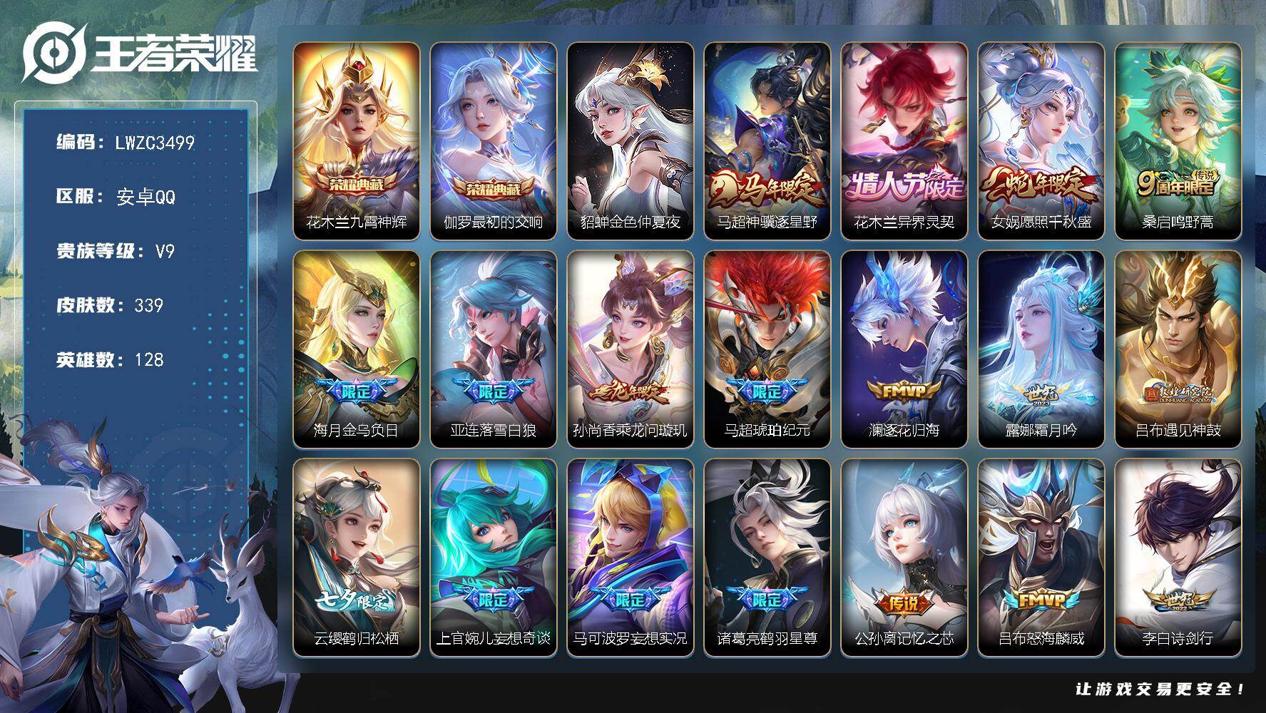 [17998068]可二次【特价出售/店主推荐/1省标】:安卓Q-V9-最强王者段位-128英雄-339皮肤-2典藏皮肤-1星元-43传说-114史诗