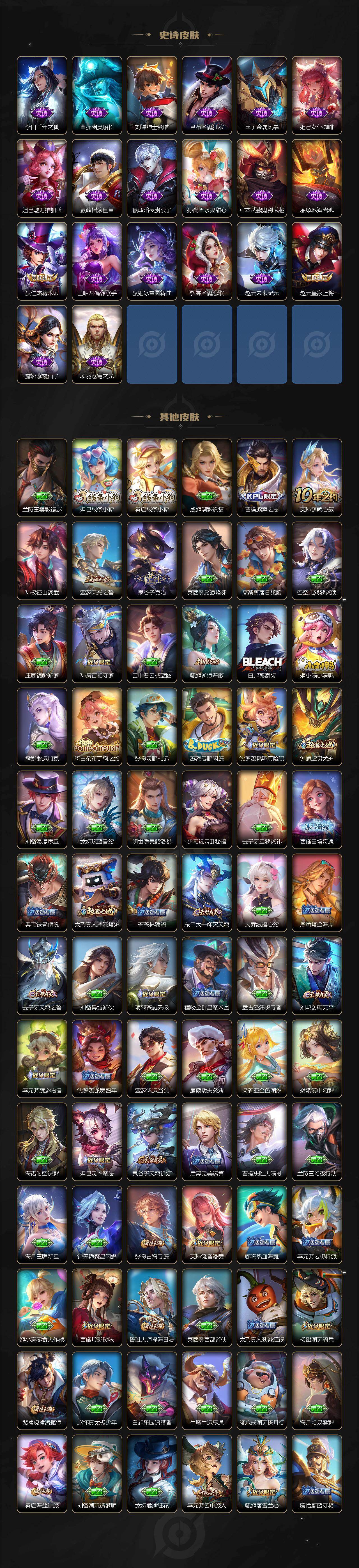 娜可露露晚萤,伽罗箭羽风息,李元芳逐浪之夏,不知火舞魅语,公孙离无限星赏官,孙策猫狗日记,阿轲节奏热浪,露娜紫霞仙子,诸葛亮黄金分割率,王昭君偶像歌手,韩信白龙吟,项羽苍穹之光,吕布末日机甲,蒙犽龙鼓争鸣,橘右京修罗,嬴政摇滚巨星,刘禅绅士熊喵,刘禅天才门将,白起星夜王子,安琪拉时之奇旅,刘邦德古拉伯爵,兰陵王暗隐猎兽者,曹操幽灵船长,宫本武藏鬼剑武藏,司马懿暗渊魔法,亚瑟心灵战警,杨戬天秀·启明,蔡文姬舞动绿茵,廉颇地狱岩魂,西施诗语江南,小乔缤纷独角兽,夏侯惇乘风破浪,花木兰水晶猎龙者,铠曙光守护者,墨子金属风暴,吕布圣诞狂欢,貂蝉圣诞恋歌,百里守约特工魅影,嬴政暗夜贵公子,嫦娥拒霜思,雅典娜黎明之约,李白千年之狐,夏洛特永昼,澜赏金猎手,貂蝉唤灵魅影,弈星滕王阁序,阿古朵顽趣,镜玫瑰异探,杨玉环银翎春语,刘备百相守梦,沈梦溪匿光破解者,刘禅电玩·爆裂旋风,海月浮梦罗烟,镜真我赫兹,赵怀真鹤归松栖,蒙犽百解令,周瑜雪夜绮愿,高渐离燃音魔法,伽罗琥珀纪元,桑启奇遇星旅,上官婉儿群星魔术团,赵怀真器灵·浮梦炉