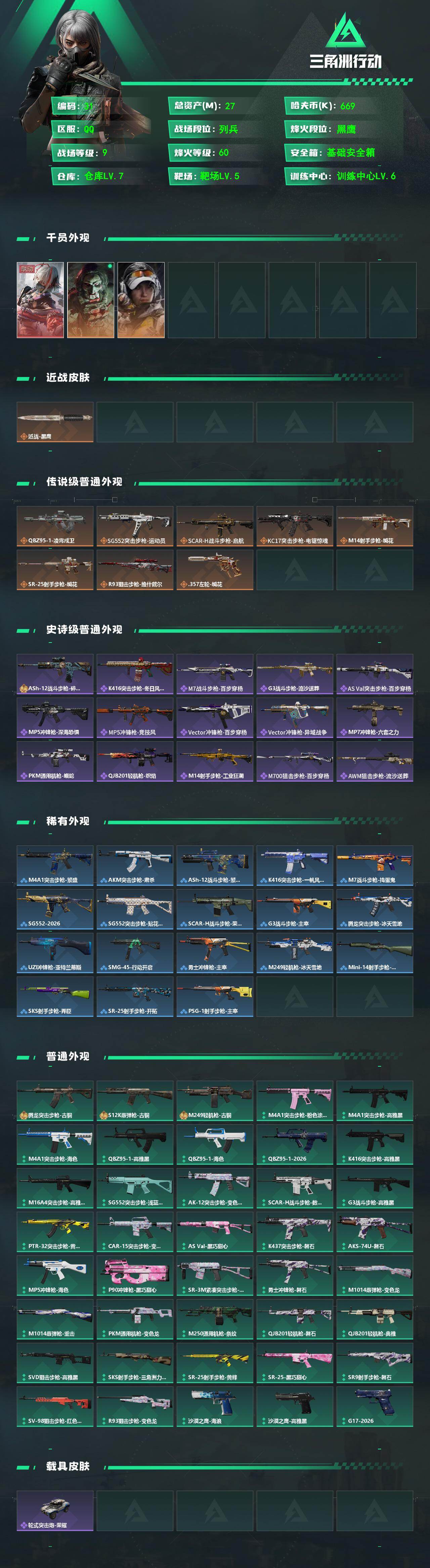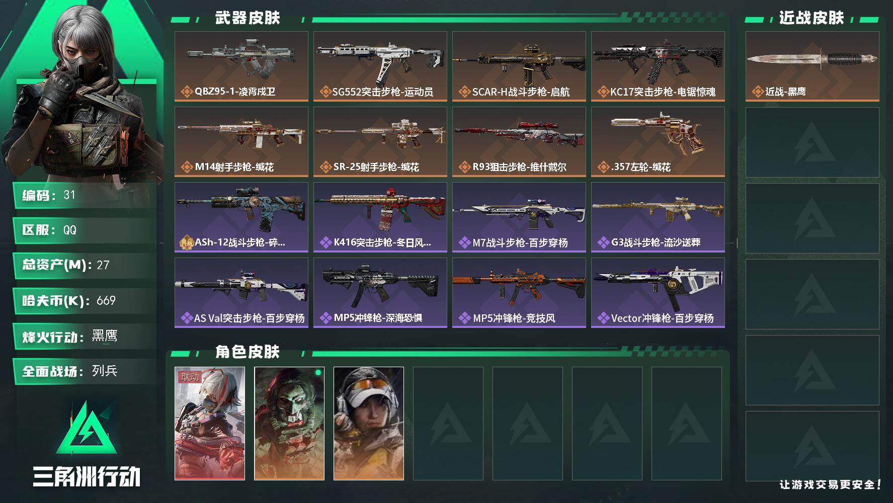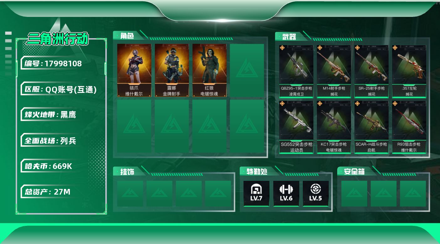 [17998108]27m总资产-669k哈夫币-60烽火等级-黑鹰-9战场等级-列兵 【干员外观】:骇爪-维什戴尔,红狼-电锯惊魂,露娜-金牌射手 【近战皮肤】:近战-黑鹰 【传说外观】:QBZ95-1突击步枪-凌霄戍卫,SG552突击步枪-运动员,SCAR-H战斗步枪-启航,KC17突击步枪-电锯惊魂,M14射手步枪-缄花,SR-25射手步枪-缄花,R93狙击步枪-维什戴尔,.357左轮-缄花 【史诗外观】:ASh-12战斗步枪-碎冰行动,K416突击步枪-冬日风情,M7战斗步枪-百步穿杨,G3战斗步枪-流沙送葬,AS Val突击步枪-百步穿杨,MP5冲锋枪-深海恐惧,MP5冲锋枪-竞技风,Vector冲锋枪-百步穿杨,Vector冲锋枪-异域战争,MP7冲锋枪-六套之力,PKM通用机枪-蝮蛇,QJB201轻机枪-炽焰,M14射手步枪-工业狂潮,M700狙击步枪-百步穿杨,AWM狙击步枪-流沙送葬 【稀有外观】:M4A1突击步枪-繁盛,AKM突击步枪-肃杀,ASh-12战斗步枪-繁盛,K416突击步枪-一帆风顺,M7战斗步枪-捣蛋鬼,SG552突击步枪-2026,SG552突击步枪-贴花艺术,SCAR-H战斗步枪-荣耀列队,G3战斗步枪-主宰,腾龙突击步枪-冰天雪地,UZI冲锋枪-亚特兰蒂斯,SMG-45冲锋枪-行动开启,勇士冲锋枪-主宰,M249轻机枪-冰天雪地,Mini-14射手步枪-荣耀列队,SKS射手步枪-弄臣,SR-25射手步枪-开拓,PSG-1射手步枪-主宰 【普通外观】:腾龙突击步枪-古铜,S12K霰弹枪-古铜,M249轻机枪-古铜,M4A1突击步枪-粉色涂装,M4A1突击步枪-高雅黑,M4A1突击步枪-海色,QBZ95-1突击步枪-高雅黑,QBZ95-1突击步枪-海色,QBZ95-1突击步枪-2026,K416突击步枪-高雅黑,M16A4突击步枪-高雅黑,SG552突击步枪-浅蓝涂装,AK-12突击步枪-变色龙,SCAR-H战斗步枪-数码迷彩,G3战斗步枪-高雅黑,PTR-32突击步枪-黄蜂,CAR-15突击步枪-变色龙,AS Val突击步枪-黑巧甜心,K437突击步枪-磐石,AKS-74U突击步枪-磐石,MP5冲锋枪-海色,P90冲锋枪-黑巧甜心,SR-3M紧凑突击步枪-变色龙,勇士冲锋枪-磐石,M1014霰弹枪-变色龙,M1014霰弹枪-重击,PKM通用机枪-