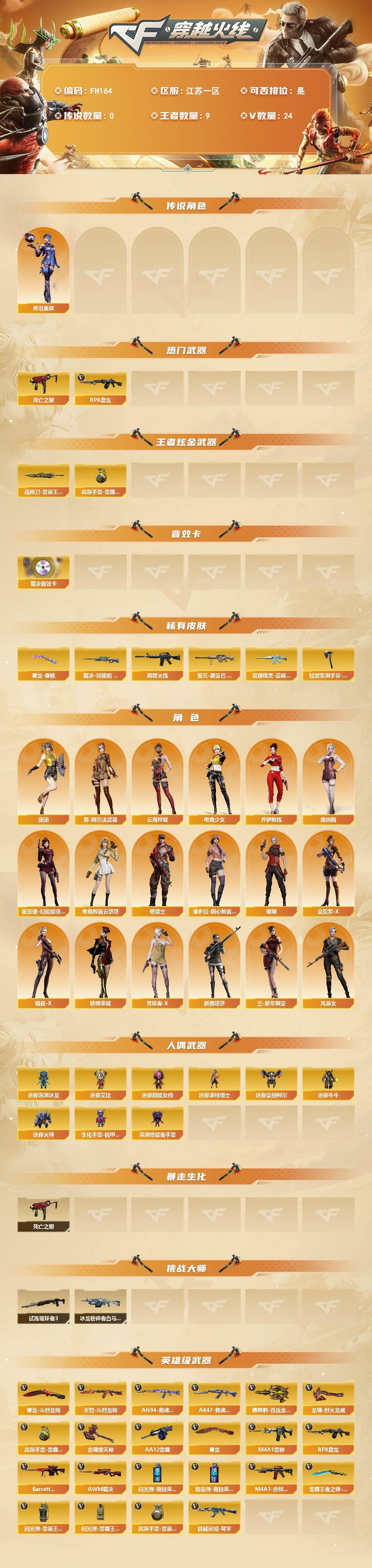 - [16938930]河南一区-24V-2王者武器数-1炫金武器数 【热门武器】:白虎-电玩蓝兔,M4A1-黑骑士,加特林-炼狱,沙鹰-修罗*4 【王者炫金武器】:王者之武,王者蔷薇,炫金雷神 【音效卡】:M4A1-黑骑士音效卡,白鲨语音包 【皮肤】:雷神-星空,火麒麟-心动糖果,毁灭耀金皮肤*2,战神-紫绶金章皮肤,AK47-B-常胜将军-孙权*2,修罗耀金皮肤,修罗-冠军之魂 【角色】:瞳,魅影,风暴女,嘉年华灵狐,零-水下丽影,斯沃特-X,职业选手 【人偶武器】:AWM-灵狐-15周年嘉年华,迷你裂空之翼*2,迷你超能女侍 【挑战大师】:冰龙粉碎者-白马银枪,VEPR-12-金魔,机甲撕裂者III,阐释者III 【英雄级武器】:AK47-火麒麟*2,M4A1-雷神,M4A1-黑骑士,AK47-黑鲨,无影-神兵利器,AK-47-猩红传说*2,AK47-B-常胜将军,白虎-电玩蓝兔,Barrett-毁灭,AWM-裁决,加特林-炼狱,沙鹰-修罗*4,沙鹰-天神*2,屠龙 【道具】:冰冰企鹅背包-猛男专用,夺命之镰,防化服,金色流光-枪王排位,电玩兔兔表情,防弹头盔,防弹衣,C4工具钳,手雷包 【特殊枪械】:1黑骑士,1炼狱