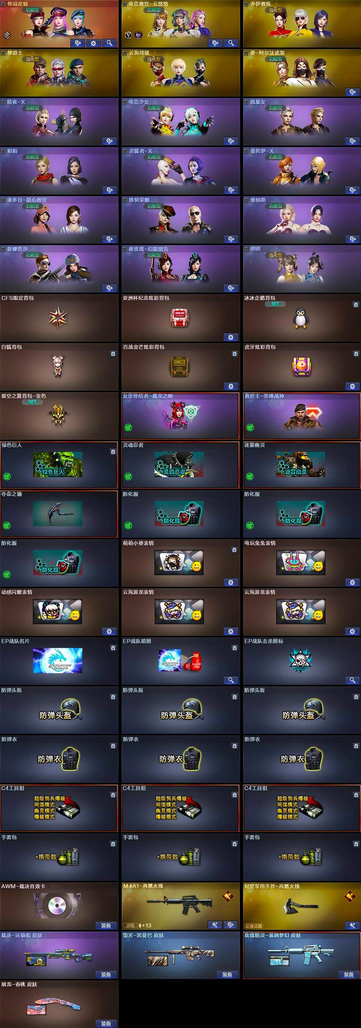 【道具】:CFS限定背包,亚洲杯纪念炫彩背包,冰冰企鹅背包,白狐背包,百战金芒炫彩背包,虎牙炫彩背包,裂空之翼背包-金色,女皇终结者-魔龙之吻,救世主-黑桃战神,绿色巨人,灵魂忍者,迷雾幽灵,夺命之镰,防化服*3,萌萌小葵表情,电玩兔兔表情,动感闪耀表情,云海游龙表情*2,EP战队名片,EP战队喷图,EP战队击杀图标,防弹头盔*3,防弹衣*3,C4工具钳*3,手雷包*3