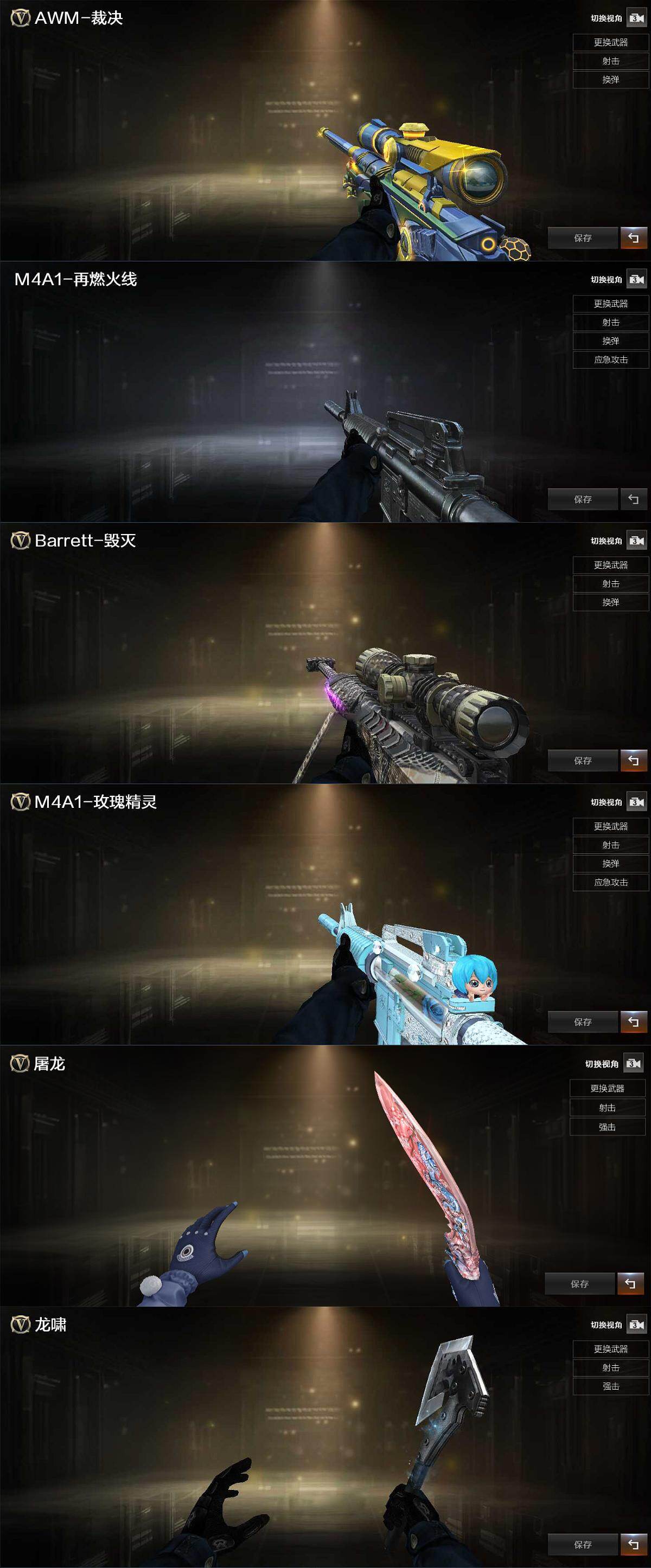 【源级武器】:源·雷神,御·黑骑士·哪吒闹海,御·超新星-圣诞,M4A1-青龙-掌上穿越火线,QBZ03-文殊坊,魂·Barrett-朱雀-锦鲤,魂·炼狱-电子连击,加特林-炼狱-掌火,魂·修罗-现代金属,魂·擎天-破浪10年,魂·龙啸-秦师