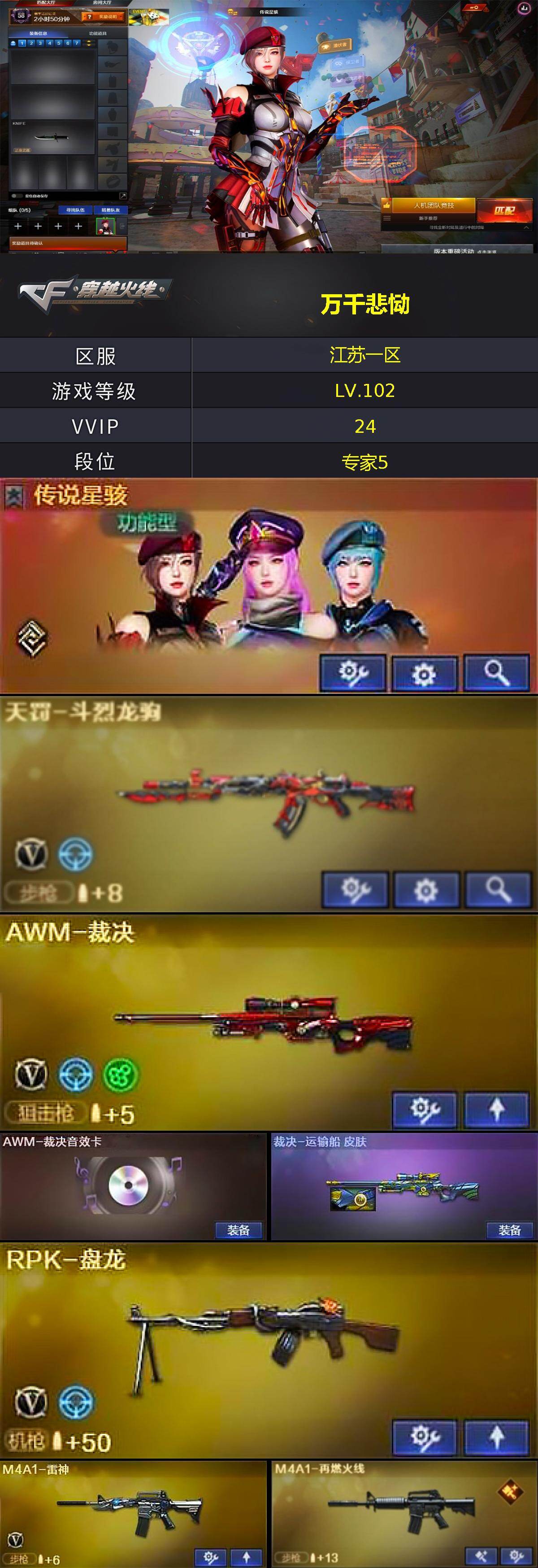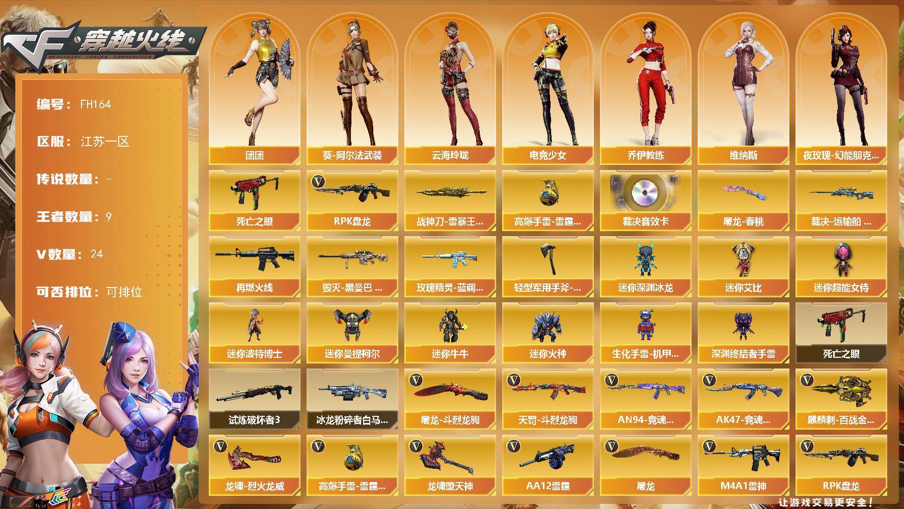 [17998228]江苏一区-28V-9王者武器数-0炫金武器数 【传说角色】:传说星骇 【热门武器】:死亡之眼,RPK-盘龙 【王者炫金武器】:斩神刀-雷暴王者,高爆手雷-雷霆王者 【音效卡】:AWM-裁决音效卡 【皮肤】:裁决-运输船 皮肤,M4A1-再燃火线,毁灭-黑曼巴 皮肤,玫瑰精灵-蓝调梦幻 皮肤,屠龙-春桃 皮肤,轻型军用手斧-再燃火线 【角色】:电竞教官-云悠悠,乔伊教练,修道士,云海玲珑,葵-阿尔法武装,暗夜-X,电竞少女,风暴女,娟娟,兰-新年限定,灵狐者-X,曼陀罗-X,潘多拉-甜心教官,铁骑荣耀,维纳斯,新娜塔莎,夜玫瑰-幻能朋克,团团 【人偶武器】:迷你深渊冰龙,迷你波特博士,迷你曼提柯尔,迷你牛牛,迷你火种,生化手雷-机甲核心,深渊终结者手雷,迷你艾比,迷你超能女侍 【暴走生化】:死亡之眼 【挑战大师】:冰龙粉碎者-白马银枪,试炼破坏者III 【英雄级武器】:M4A1-雷神,机械迷城-穹宇,天罚-斗烈龙驹,Barrett-极光,AWM-裁决,RPK-盘龙,AA-12-雷霆,屠龙*5,龙啸-堕天神,麒麟刺-百战金芒,雷霆王者之锋-觉醒版,屠龙-斗烈龙驹,龙啸-烈火龙威,高爆手雷-雷霆王者-觉醒版,高爆手雷-雷暴王者*2,闪光弹-竞技荣光,闪光弹-雷暴王者*2,闪光弹-雷霆王者-觉醒版*2,烟雾弹-竞技荣光,M4A1-赤狱骑士,AK47-竞魂无影,AN94-竞魂超新星*2 【源级武器】:源·雷神,御·黑骑士·哪吒闹海,御·超新星-圣诞,M4A1-青龙-掌上穿越火线,QBZ03-文殊坊,魂·Barrett-朱雀-锦鲤,魂·炼狱-电子连击,加特林-炼狱-掌火,魂·修罗-现代金属,魂·擎天-破浪10年,魂·龙啸-秦师 【道具】:CFS限定背包,亚洲杯纪念炫彩背包,冰冰企鹅背包,白狐背包,百战金芒炫彩背包,虎牙炫彩背包,裂空之翼背包-金色,女皇终结者-魔龙之吻,救世主-黑桃战神,绿色巨人,灵魂忍者,迷雾幽灵,夺命之镰,防化服*3,萌萌小葵表情,电玩兔兔表情,动感闪耀表情,云海游龙表情*2,EP战队名片,EP战队喷图,EP战队击杀图标,防弹头盔*3,防弹衣*3,C4工具钳*3,手雷包*3 【特殊枪械】:1盘龙