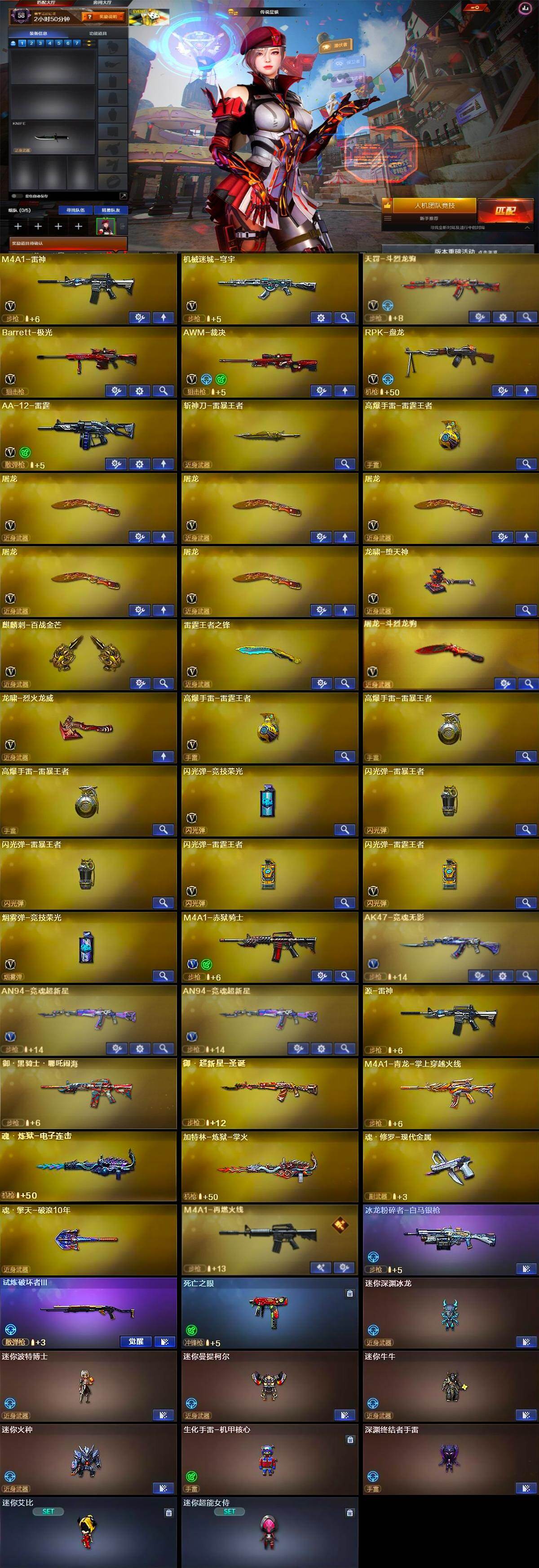 【英雄级武器】:M4A1-雷神,机械迷城-穹宇,天罚-斗烈龙驹,Barrett-极光,AWM-裁决,RPK-盘龙,AA-12-雷霆,屠龙*5,龙啸-堕天神,麒麟刺-百战金芒,雷霆王者之锋-觉醒版,屠龙-斗烈龙驹,龙啸-烈火龙威,高爆手雷-雷霆王者-觉醒版,高爆手雷-雷暴王者*2,闪光弹-竞技荣光,闪光弹-雷暴王者*2,闪光弹-雷霆王者-觉醒版*2,烟雾弹-竞技荣光,M4A1-赤狱骑士,AK47-竞魂无影,AN94-竞魂超新星*2