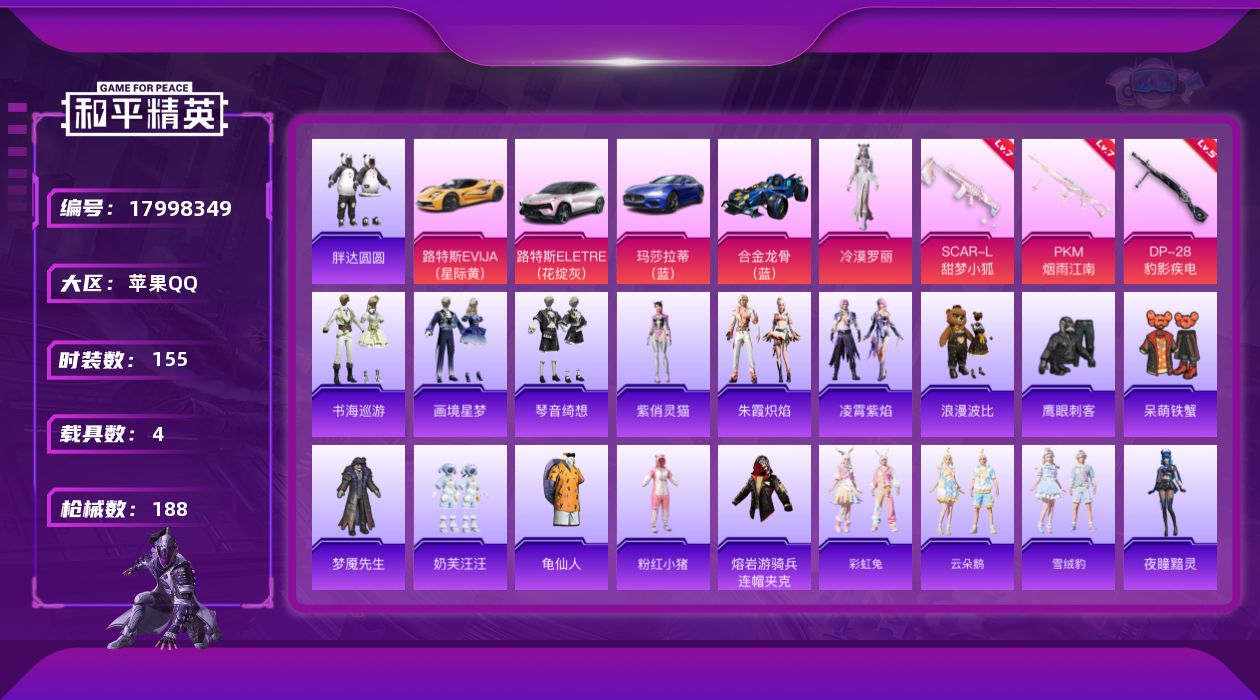 [17998349]苹果 手Q-1粉装-6特效枪-4载具-1粉色飞行器-60096热力值-13王牌印记-155套装-188枪皮 【热门品类】:套装-胖达圆圆,套装-龟仙人,套装-浪漫波比,套装-粉红小猪,熔岩游骑兵连帽夹克 【粉色套装】:角色-冷漠罗丽 【粉色枪皮等级】:SCAR-L-甜梦小狐(七级),UMP45-萌骑冒险(五级),AKS-74U-森灵之息(五级),Mk14-福马献瑞(三级),DP-28-豹影疾电(五级),PKM-江南烟雨(七级) 【粉色载具】:路特斯EVIJA(星际黄),路特斯ELETRE(花绽灰),玛莎拉蒂Ghibli(蓝),合金龙骨(蓝) 【粉色枪皮】:SCAR-L-甜梦小狐,UMP45-萌骑冒险,AKS-74U-森灵之息,Mk14-福马献瑞,DP-28-豹影疾电,PKM-江南烟雨 【粉色飞行器】:炫彩糖果飞行器 【粉色降落伞】:王牌四分卫降落伞,青春物语降落伞,恐龙拽拽降落伞,甜梦小狐降落伞,彩虹甜喵降落伞,炫光之旅降落伞,极意拳锋降落伞,炫彩糖果降落伞 【稀有套装】:套装-龟仙人,套装-雪国风尚,套装-炫彩糖果,套装-马上有钱,套装-迅捷龙虾,套装-彩虹兔,套装-云朵鹅,套装-雪绒豹,角色-夜瞳黯灵,套装-朱霞炽焰,套装-凌霄紫焰,角色-紫俏灵猫,套装-书海巡游,套装-画境星梦,套装-琴音绮想,套装-雨过天青,套装-红釉青花 【稀有枪皮】:AUG-冰晶雪宝,AKM-影袭,AKM-破晓战魂,AKM-缤纷海域,AKM-萌趣颜团子,AKM-霓虹街区,AKM-龙的传人,M16A4-幻世战舞者,M16A4-甜心亚梦,M16A4-红色方程式,M16A4-蓝色火焰,SCAR-L-炫彩节奏,SCAR-L-玉兔迎春,M416-糯团青竹,M416-蓝色火焰,GROZA-影袭,GROZA-治愈之星,GROZA-田园牧歌,GROZA-青春物语,AUG-天降萌叽,AUG-甜蜜菠萝,AUG-青春冒险家,QBZ-原初圣火,QBZ-彩虹符号,QBZ-诡娃娃,QBZ-飞驰魅影,M762-天降萌叽,M762-彩虹符号,M762-拳皇97,M762-牛气冲天,M762-诡娃娃,M762-云朵鹅,Mk47-妙红点点,AC-VAL-天降萌叽,AC-VAL-甜心亚梦,蜜獾-娇憨猪猪,ACE32-画境星梦,ARX-凌霄紫焰,UZI-啾咪啾咪,UZI-娇憨猪猪,UZI-影袭,UZI-炫彩节奏,UMP45-