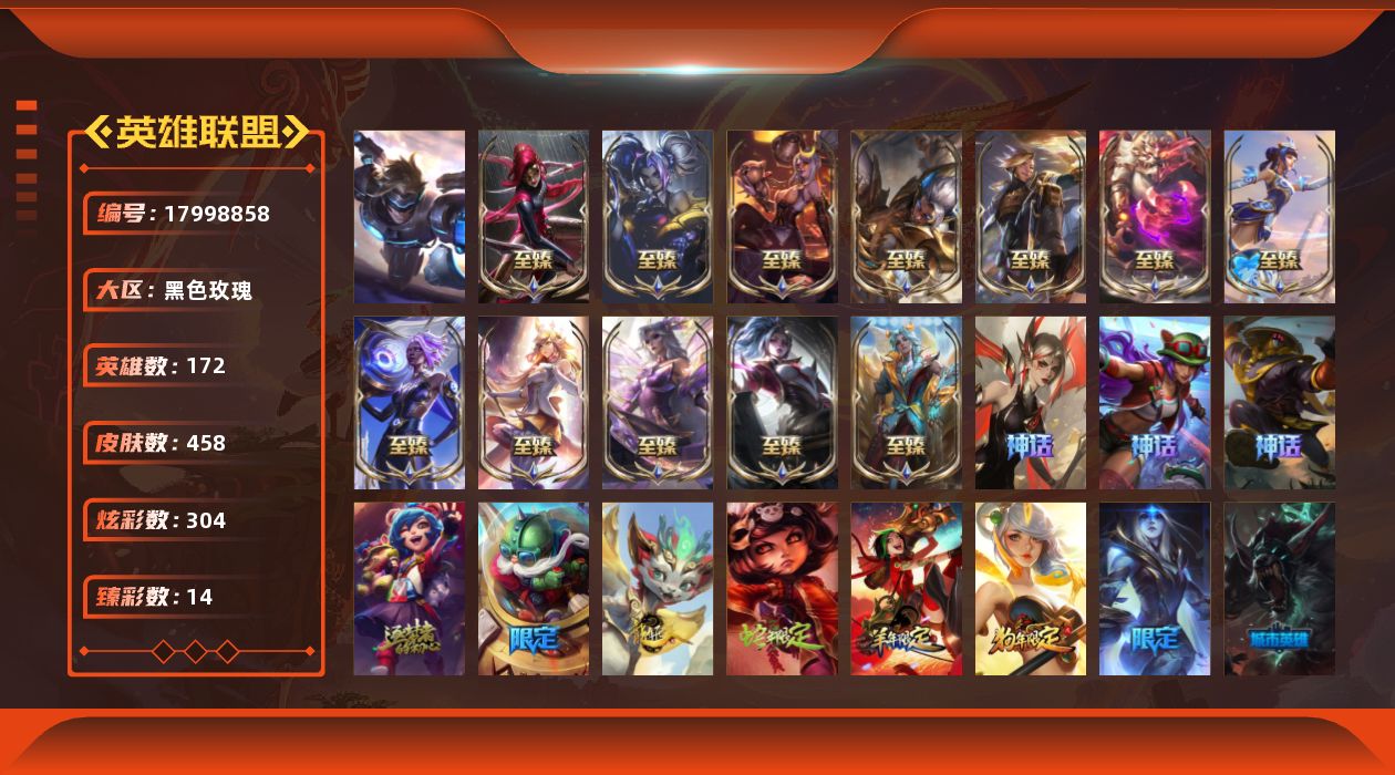 [17998858]黄金段位-172英雄-458皮肤-304炫彩-1终极-17神话-57限定-46传说-102史诗