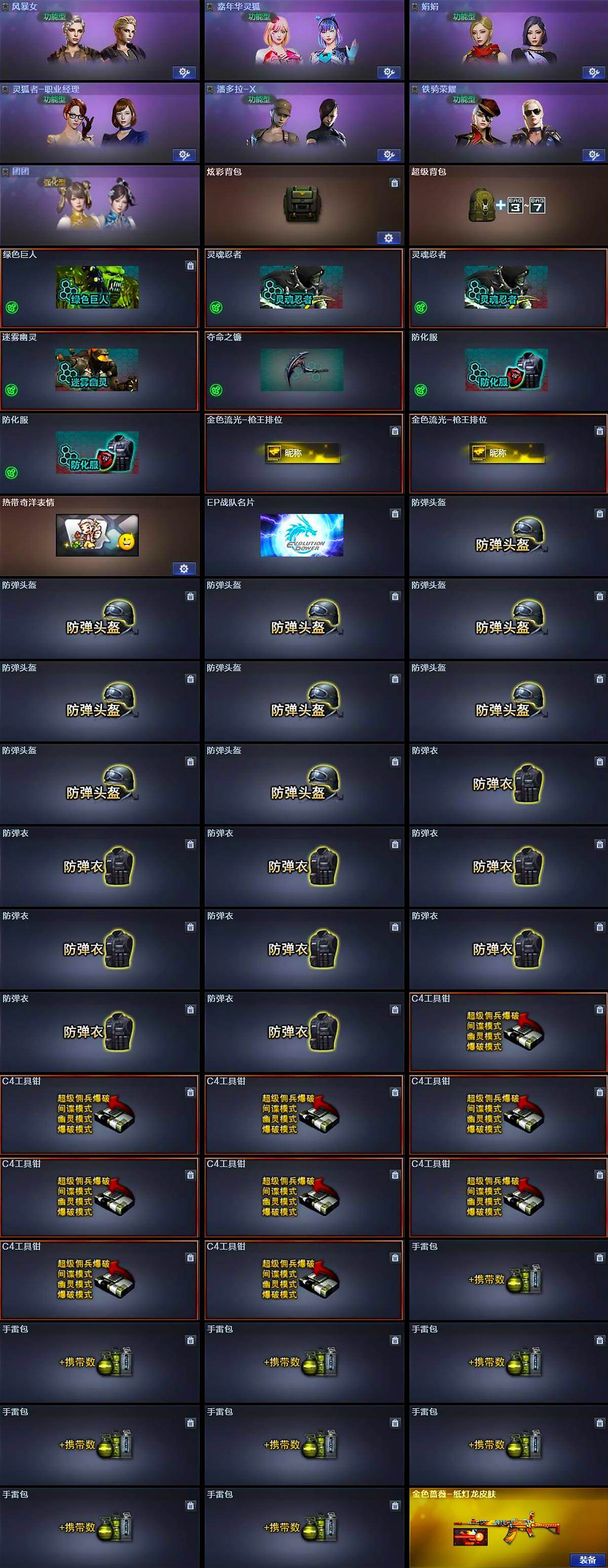 【道具】:炫彩背包,超级背包,绿色巨人,灵魂忍者*2,迷雾幽灵,夺命之镰,防化服*2,金色流光-枪王排位*2,热带奇洋表情,EP战队名片,防弹头盔*9,防弹衣*9,C4工具钳*9,手雷包*9