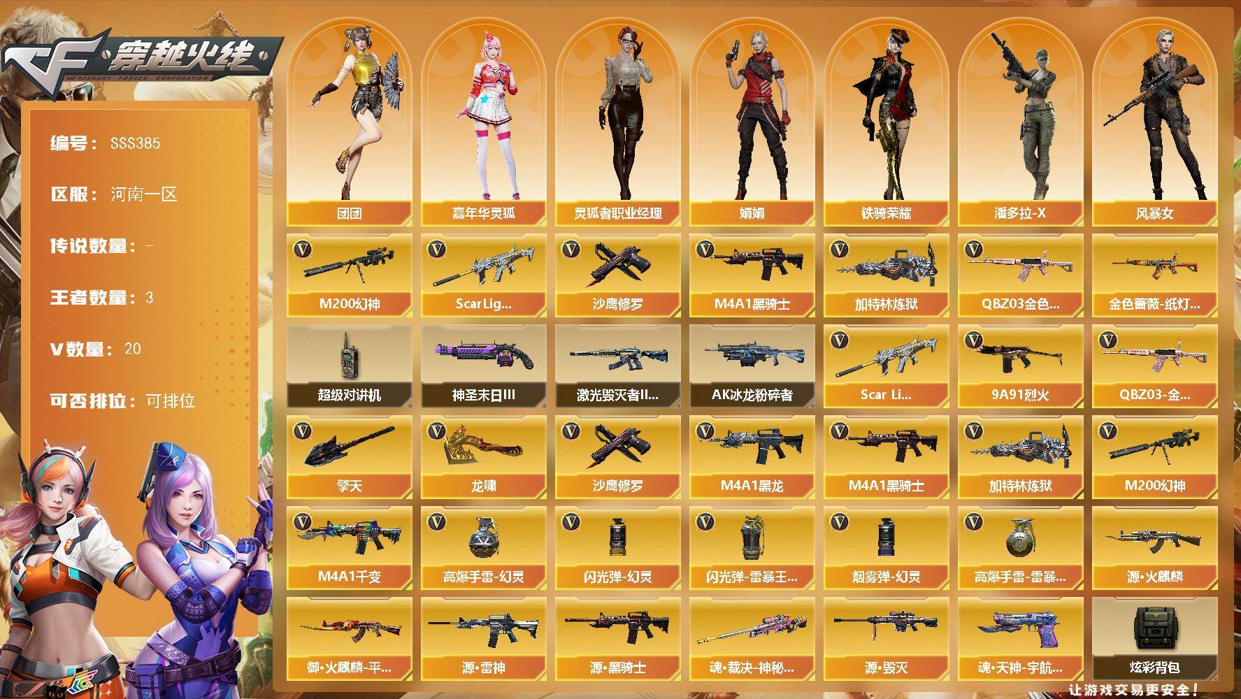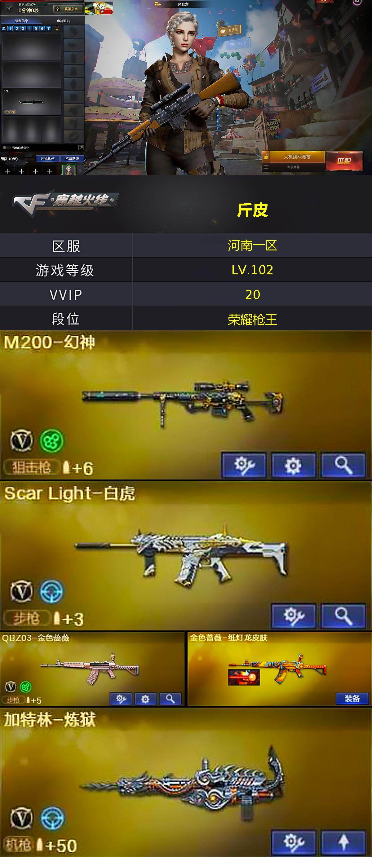 [18000177]河南一区-20V-3王者武器数-0炫金武器数 【热门武器】:QBZ03-金色蔷薇,Scar Light-白虎,M200-幻神,M4A1-黑骑士,加特林-炼狱,沙鹰-修罗 【皮肤】:金色蔷薇-纸灯龙皮肤 【角色】:风暴女,嘉年华灵狐,娟娟,灵狐者-职业经理,潘多拉-X,铁骑荣耀,团团 【暴走生化】:超级对讲机 【挑战大师】:AK47-冰龙粉碎者,激光毁灭者III-白马银枪,神圣爆裂者-末日III 【英雄级武器】:M4A1-千变,M4A1-黑龙,M4A1-黑骑士,Scar Light-白虎,QBZ03-金色蔷薇,9A91-烈火,M200-幻神,加特林-炼狱,沙鹰-修罗,龙啸,擎天,高爆手雷-幻灵*2,高爆手雷-雷暴王者,闪光弹-幻灵,闪光弹-雷暴王者*2,烟雾弹-幻灵*2 【源级武器】:源·火麒麟,御·火麒麟-平天大圣,源·雷神,源·黑骑士,魂·裁决-神秘按键,源·毁灭,魂·天神-宇航兔兔 【道具】:炫彩背包,超级背包,绿色巨人,灵魂忍者*2,迷雾幽灵,夺命之镰,防化服*2,金色流光-枪王排位*2,热带奇洋表情,EP战队名片,防弹头盔*9,防弹衣*9,C4工具钳*9,手雷包*9 【特殊枪械】:1白虎,1黑骑士,1炼狱
