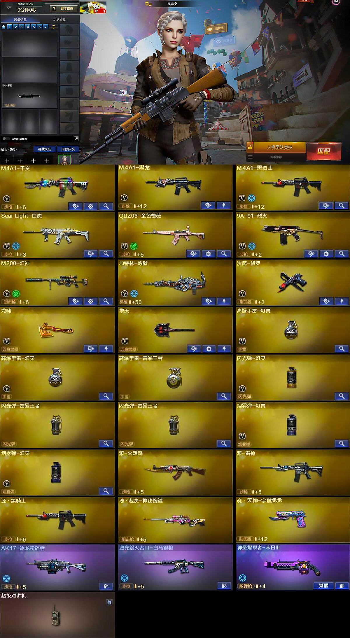 【英雄级武器】:M4A1-千变,M4A1-黑龙,M4A1-黑骑士,Scar Light-白虎,QBZ03-金色蔷薇,9A91-烈火,M200-幻神,加特林-炼狱,沙鹰-修罗,龙啸,擎天,高爆手雷-幻灵*2,高爆手雷-雷暴王者,闪光弹-幻灵,闪光弹-雷暴王者*2,烟雾弹-幻灵*2