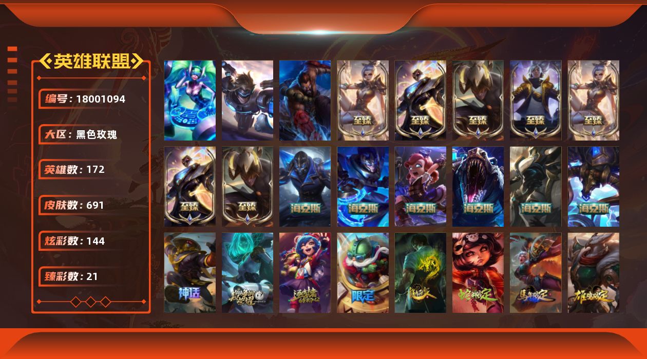 [18001094]未定级段位-172英雄-691皮肤-144炫彩-3终极-17神话-107限定-56传说-186史诗 【至臻皮肤】:至臻黑夜使者李青,至臻黑夜使者李青(2022),至臻玉剑传说武剑仙锐雯,至臻玉剑传说武剑仙(2022),至臻真实伤害亚索,至臻未来战士锤石,至臻未来战士锤石(2022) 【臻彩皮肤】:天龙之子卡莎飞龙乘云,吕布奉先炫金战神,替父从军花木兰炫金龙刃,冰霜之刃艾瑞莉娅炫金,冰雪节格雷福斯炫金,墨之影武者亚索金墨耀影,冠军掠夺者卡兹克凯旋圣装,冠军之刃锐雯2016凯旋圣装,冠军典狱长锤石凯旋圣装,冠军之血希瓦娜凯旋圣装,冰雪风暴希维尔炫金,冠军之隐劫凯旋圣装,雾雨之刃锐雯,偶像歌手阿狸极地雪莲,霸天巨兽雪崩墨菲特,魔女阿卡丽虚荣,净雪之月莫甘娜冬虹,幻灵战斗兔阿萝拉梦幻强袭,红莲之刃锐雯,心之钢伊泽瑞尔天纵才华 【年限皮肤】:龙的传人李青,定海神珍孙悟空,你看见过我的熊猫吗安妮,碧玉之牙卡西奥佩娅,替父从军花木兰,司马懿仲达,南天之怒沃里克,春晖神女拉克丝,烈焰美人薇恩,王国机神朱雀蕾欧娜 【海克斯皮肤】:海克斯科技安妮,海克斯科技阿利斯塔,海克斯科技卡萨丁,海克斯科技雷克顿,海克斯科技嘉文四世,零之枪骑赫卡里姆 【情人节限定】:甜心宝贝娑娜,甜心之翎洛,觅心猎手薇恩,觅心之翼奎因,觅心女王艾希 【冰雪限定】:幸福女神乐芙兰,圣诞开心鬼提莫,圣诞精灵崔丝塔娜,圣诞狂欢努努和威朗普,圣诞糖果棒厄运小姐,圣诞狂欢基兰,阿木木“主人不要我了”,胡桃夹子萨科,平安夜女神娑娜,邪恶圣诞老人维迦,夺命美人卡特琳娜,喜庆之树茂凯,雪默丁格,圣诞玩偶波比,圣诞老人古拉加斯,魄罗骑士瑟庄妮,圣诞老人布隆,冰雪节格雷福斯,冰雪兽纳尔 【终极皮肤】:DJ娑娜,灵魂守卫乌迪尔,未来战士伊泽瑞尔 【神话皮肤】:十周年纪念安妮,源代码乐芙兰,新卧虎藏龙贾克斯,神凰行者瑞羽圣凰艾尼维亚,海克斯科技阿利斯塔,海克斯科技安妮,海克斯科技嘉文四世,海克斯科技卡萨丁,海克斯科技雷克顿,零之枪骑赫卡里姆,至臻真实伤害亚索,至臻黑夜使者李青,至臻黑夜使者李青2022,至臻未来战士锤石,至臻未来战士锤石2022,至臻玉剑传说武剑仙,至臻玉剑传说武剑仙2022 【限定皮肤】:哥特萝莉安妮,生化领主泰达米尔,卧虎藏龙贾克斯,创星之灵璐璐,送披萨的小姐姐希维尔,地底世界崔斯特,冠军之血希瓦娜,冠军之刃锐雯2