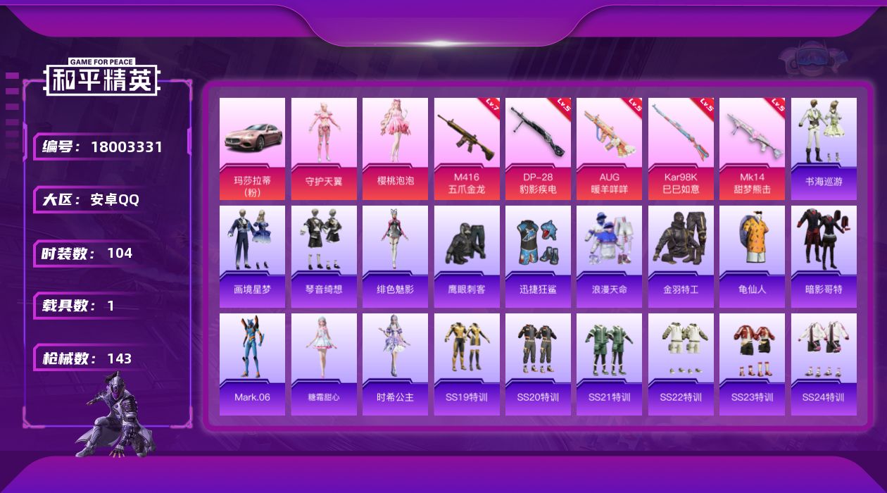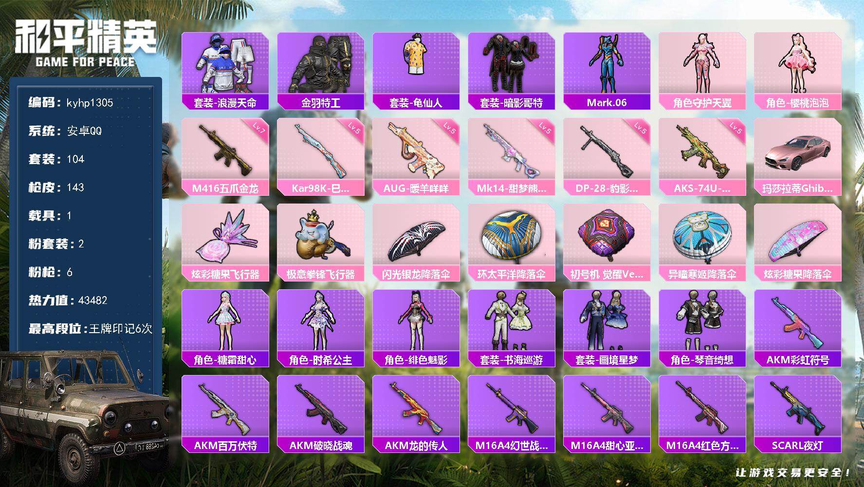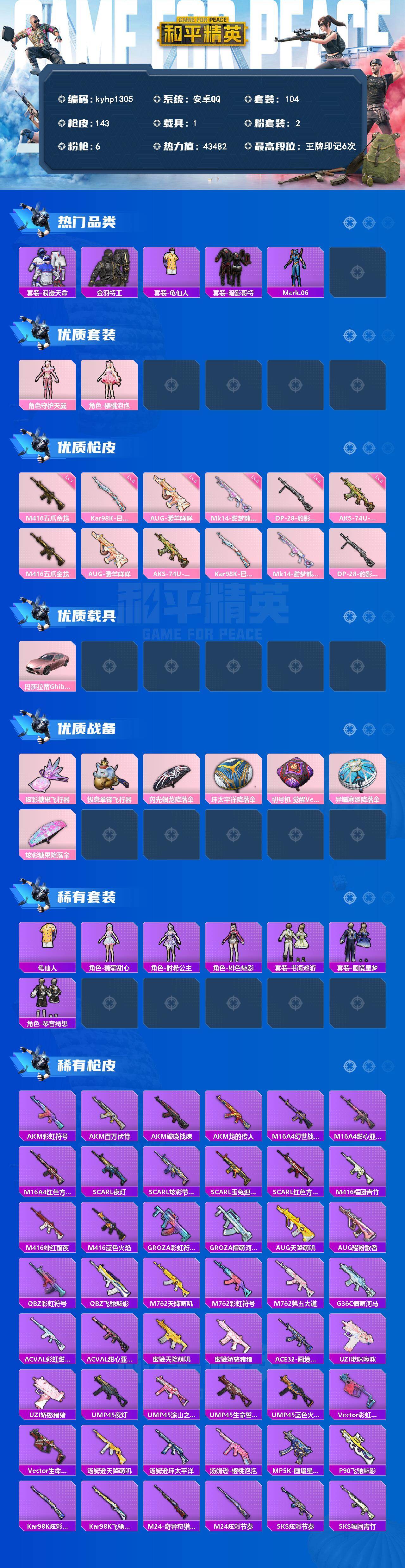 [18003331]安卓 手Q-2粉装-6特效枪-1载具-2粉色飞行器-43482热力值-6王牌印记-104套装-143枪皮 【热门品类】:套装-浪漫天命,套装-金羽特工,套装-龟仙人,套装-暗影哥特,角色-Mark.06 【粉色套装】:角色-守护天翼,角色-樱桃泡泡 【粉色枪皮等级】:M416-五爪金龙(七级),AUG-暖羊咩咩(五级),AKS-74U-森灵之息(五级),Kar98K-巳巳如意(五级),Mk14-甜梦熊击(五级),DP-28-豹影疾电(五级) 【粉色载具】:玛莎拉蒂Ghibli(粉) 【粉色枪皮】:M416-五爪金龙,AUG-暖羊咩咩,AKS-74U-森灵之息,Kar98K-巳巳如意,Mk14-甜梦熊击,DP-28-豹影疾电 【粉色飞行器】:炫彩糖果飞行器,极意拳锋飞行器 【粉色降落伞】:闪光银龙降落伞,环太平洋降落伞,初号机 觉醒Ver.降落伞,异瞳寒姬降落伞,炫彩糖果降落伞 【稀有套装】:套装-龟仙人,套装-雪国风尚,套装-炫彩糖果,角色-糖霜甜心,角色-时希公主,角色-绯色魅影,套装-书海巡游,套装-画境星梦,套装-琴音绮想 【稀有枪皮】:AUG-冰晶雪宝,AKM-彩虹符号,AKM-百万伏特,AKM-破晓战魂,AKM-龙的传人,M16A4-幻世战舞者,M16A4-甜心亚梦,M16A4-红色方程式,SCAR-L-夜灯,SCAR-L-炫彩节奏,SCAR-L-玉兔迎春,SCAR-L-红色方程式,M416-糯团青竹,M416-绯红前夜,M416-蓝色火焰,GROZA-彩虹符号,GROZA-懵萌河马,AUG-天降萌叽,AUG-耀粉歌者,QBZ-彩虹符号,QBZ-飞驰魅影,M762-天降萌叽,M762-彩虹符号,M762-第五大道,G36C-懵萌河马,AC-VAL-彩虹甜喵,AC-VAL-甜心亚梦,蜜獾-天降萌叽,蜜獾-娇憨猪猪,ACE32-画境星梦,UZI-啾咪啾咪,UZI-娇憨猪猪,UMP45-夜灯,UMP45-涂山之恋,UMP45-生命誓言,UMP45-蓝色火焰,Vector-彩虹符号,Vector-生命誓言,汤姆逊-天降萌叽,汤姆逊-环太平洋,汤姆逊-樱桃泡泡,MP5K-画境星梦,P90-飞驰魅影,Kar98K-炫彩节奏,Kar98K-飞驰魅影,M24-炫彩节奏,M24-奇异狩猎者,SKS-炫彩节奏,SKS-糯团青竹,SKS-青丘仙客,Mini14-炫彩节奏,Mi