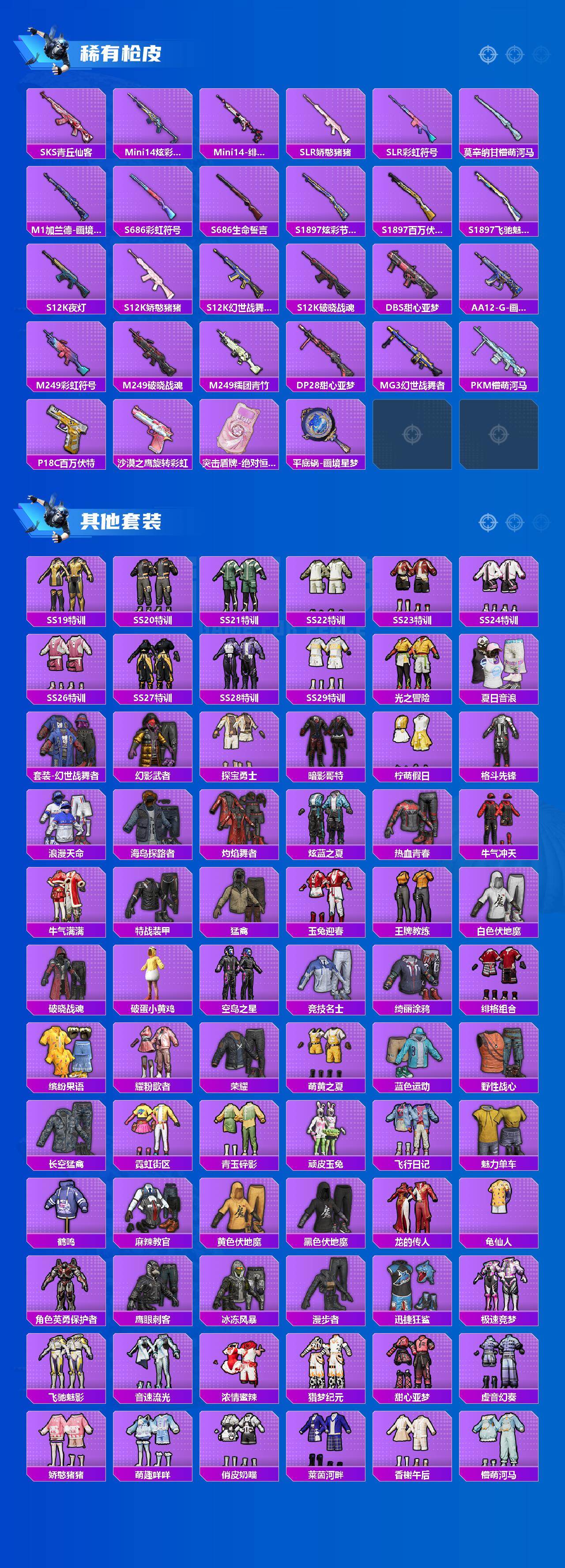 【稀有枪皮】:AUG-冰晶雪宝,AKM-彩虹符号,AKM-百万伏特,AKM-破晓战魂,AKM-龙的传人,M16A4-幻世战舞者,M16A4-甜心亚梦,M16A4-红色方程式,SCAR-L-夜灯,SCAR-L-炫彩节奏,SCAR-L-玉兔迎春,SCAR-L-红色方程式,M416-糯团青竹,M416-绯红前夜,M416-蓝色火焰,GROZA-彩虹符号,GROZA-懵萌河马,AUG-天降萌叽,AUG-耀粉歌者,QBZ-彩虹符号,QBZ-飞驰魅影,M762-天降萌叽,M762-彩虹符号,M762-第五大道,G36C-懵萌河马,AC-VAL-彩虹甜喵,AC-VAL-甜心亚梦,蜜獾-天降萌叽,蜜獾-娇憨猪猪,ACE32-画境星梦,UZI-啾咪啾咪,UZI-娇憨猪猪,UMP45-夜灯,UMP45-涂山之恋,UMP45-生命誓言,UMP45-蓝色火焰,Vector-彩虹符号,Vector-生命誓言,汤姆逊-天降萌叽,汤姆逊-环太平洋,汤姆逊-樱桃泡泡,MP5K-画境星梦,P90-飞驰魅影,Kar98K-炫彩节奏,Kar98K-飞驰魅影,M24-炫彩节奏,M24-奇异狩猎者,SKS-炫彩节奏,SKS-糯团青竹,SKS-青丘仙客,Mini14-炫彩节奏,Mi