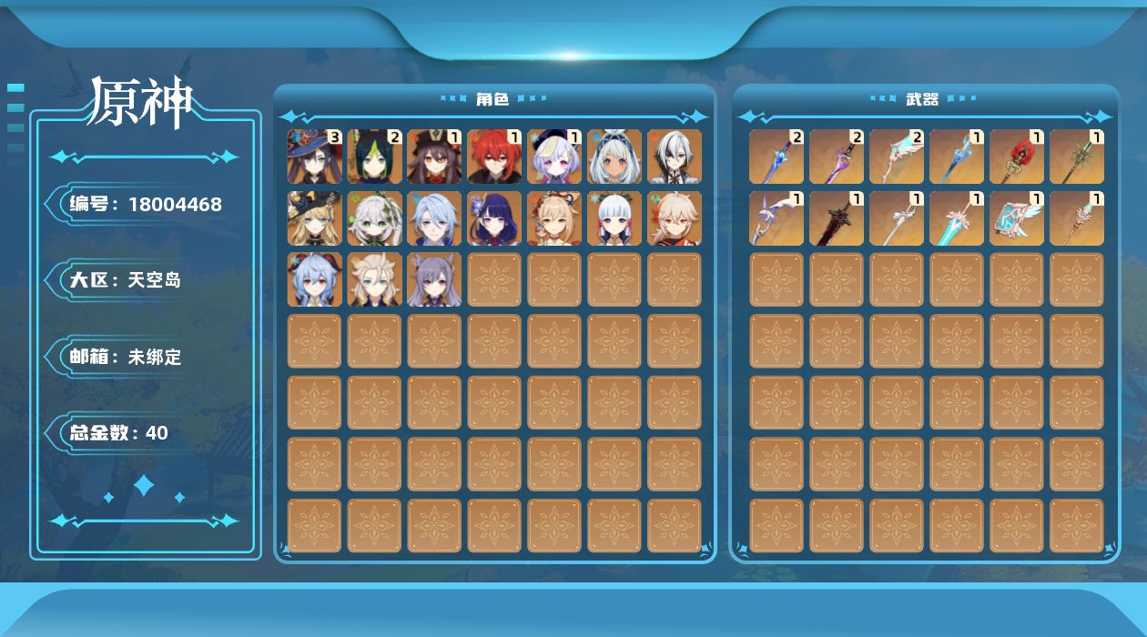 0命阿蕾奇诺,0命娜维娅,0命纳西妲,2命提纳里,0命神里绫人,0命雷电将军,0命枫原万叶,0命神里绫华,1命胡桃,0命甘雨,0命宵宫,0命阿贝多,0命刻晴,1命七七,3命莫娜,1命迪卢克,0命玛拉妮,精1静水流涌之辉,精2波乱月白经津,精2雾切之回光,精1护摩之杖,精1和璞鸢,精1天空之脊,精2天空之翼,精1阿莫斯之弓,精1天空之卷,精1风鹰剑,精1狼的末路,精1天空之傲