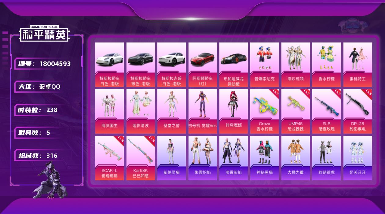 [18004593]【店主推荐捡漏号!可直接换绑】安卓 手Q-9粉装-7特效枪-5载具-0粉色飞行器-104498热力值-3王牌印记-238套装-316枪皮【热门品类】:粉装-音爆索尼克,套装-龟仙人,套装-粉红小猪,角色-8号机,角色-Mark.06【粉色套装】:粉装-潮汐统领,粉装-香水柠檬,粉装-蜜桃特工,粉装-海渊国主,粉装-音爆索尼克,粉装-莲影清波,角色-圣堂之誓,角色-初号机 觉醒Ver.,角色-绯穹魔姬【粉色枪皮等级】:SCAR-L-锦绣绵绵(五级),GROZA-香水柠檬(七级),UMP45-恐龙拽拽(七级),Kar98K-巳巳如意(五级),Mk14-福马献瑞(五级),SLR-暗夜玫瑰(七级),DP-28-豹影疾电(五级)【粉色载具】:特斯拉Model 3(珍珠白),特斯拉Model 3(冷光银),特斯拉Model X(珍珠白),阿斯顿马丁DBS(红),布加迪威龙(律动橙)【粉色枪皮】:SCAR-L-锦绣绵绵,GROZA-香水柠檬,UMP45-恐龙拽拽,Kar98K-巳巳如意,Mk14-福马献瑞,SLR-暗夜玫瑰,DP-28-豹影疾电
