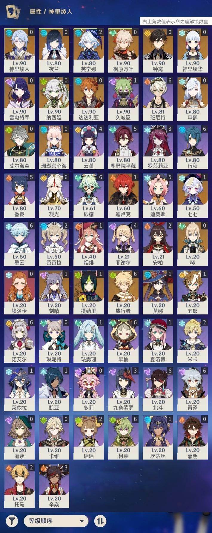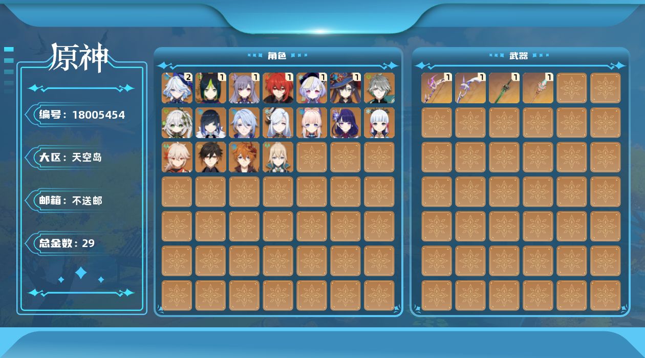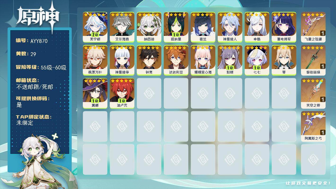 [18005454]59级/29黄/男主/18个五星角色/4个五星武器 2命芙宁娜,0命艾尔海森,0命纳西妲,1命提纳里,0命夜兰,0命神里绫人,0命申鹤,0命雷电将军,0命枫原万叶,0命神里绫华,0命钟离,0命达达利亚,0命珊瑚宫心海,1命刻晴,1命七七,0命琴,1命莫娜,1命迪卢克,精1飞雷之弦振,精1磐岩结绿,精1天空之脊,精1阿莫斯之弓