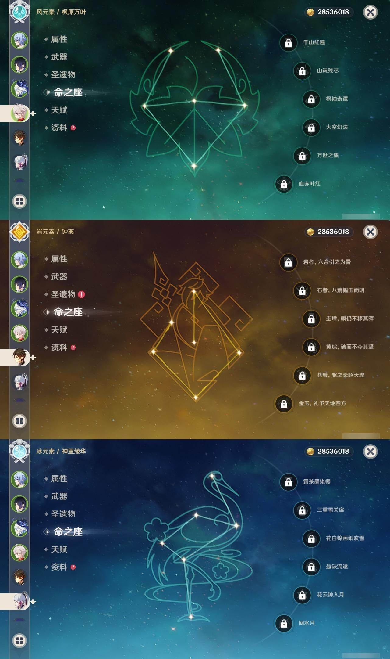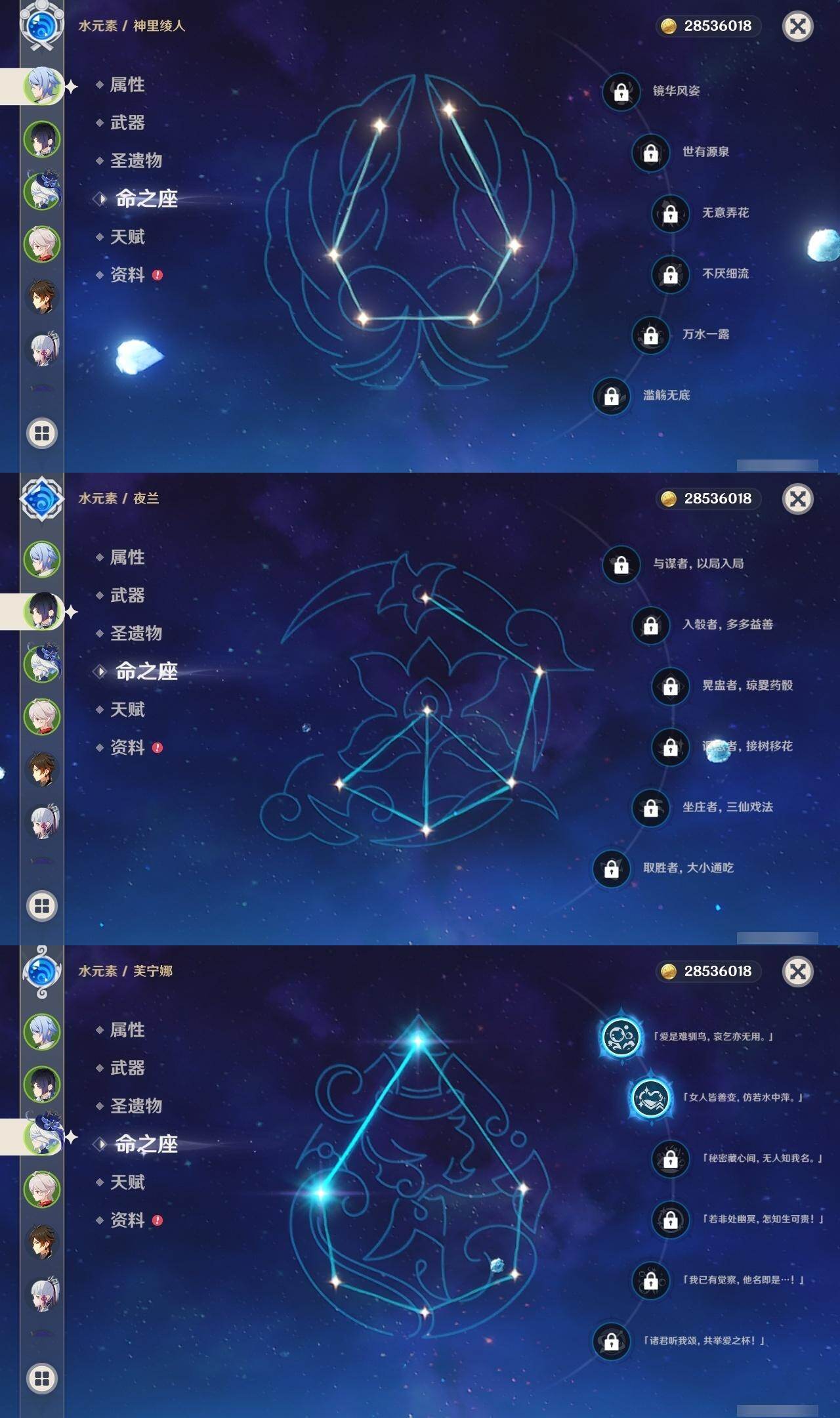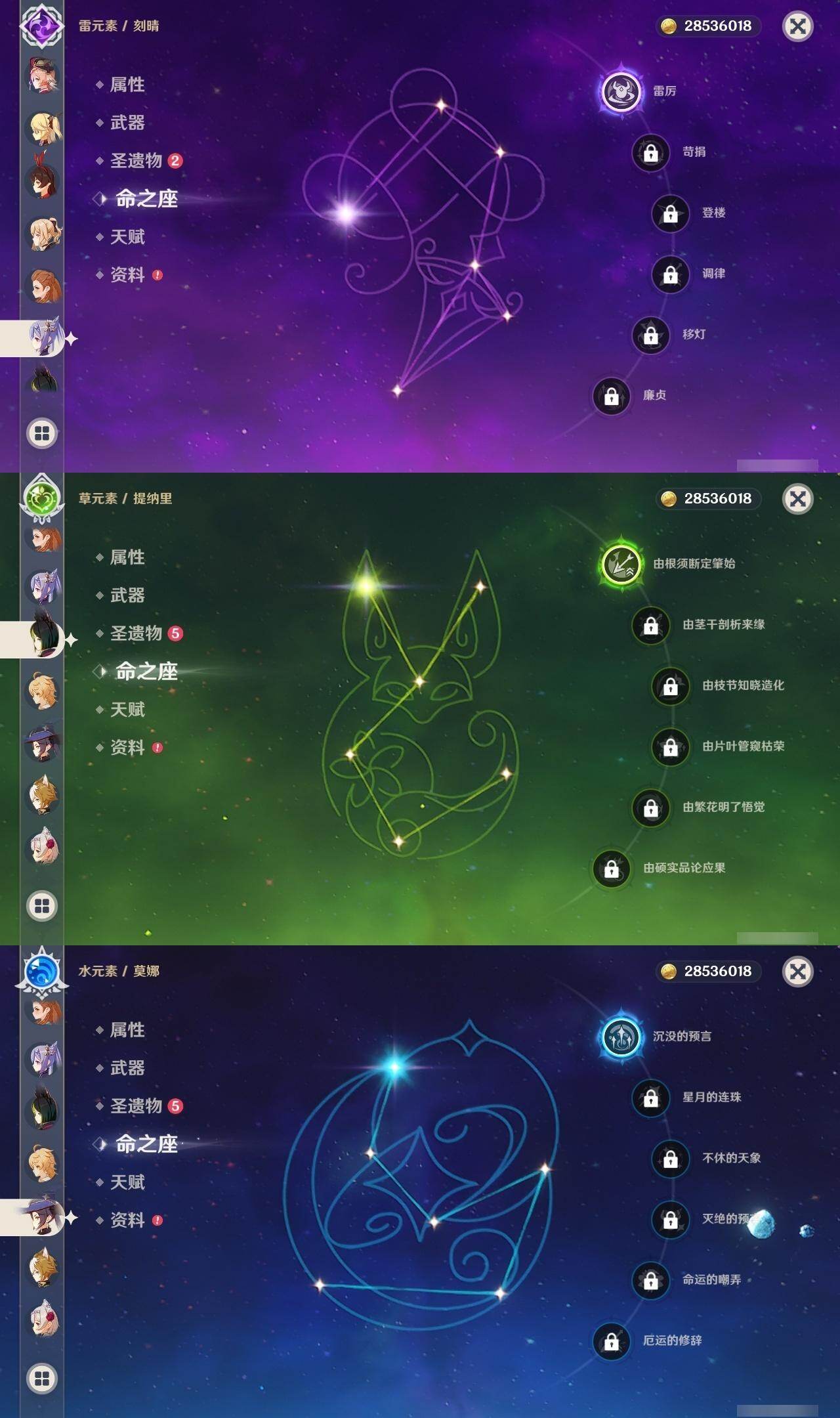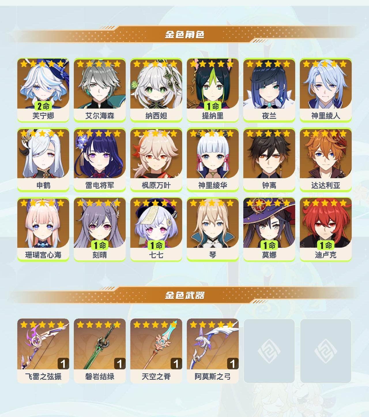 2命芙宁娜,0命艾尔海森,0命纳西妲,1命提纳里,0命夜兰,0命神里绫人,0命申鹤,0命雷电将军,0命枫原万叶,0命神里绫华,0命钟离,0命达达利亚,0命珊瑚宫心海,1命刻晴,1命七七,0命琴,1命莫娜,1命迪卢克,精1飞雷之弦振,精1磐岩结绿,精1天空之脊,精1阿莫斯之弓