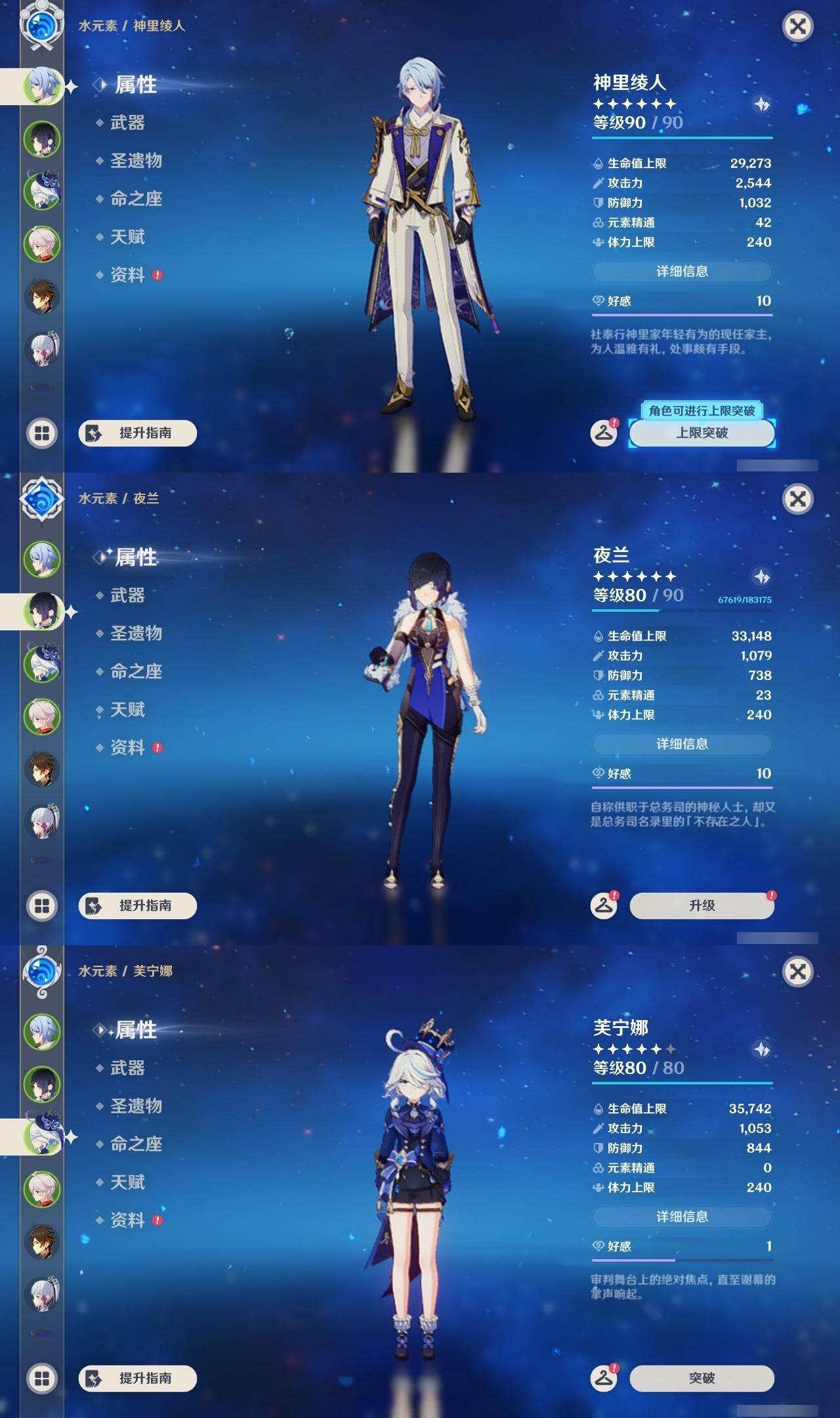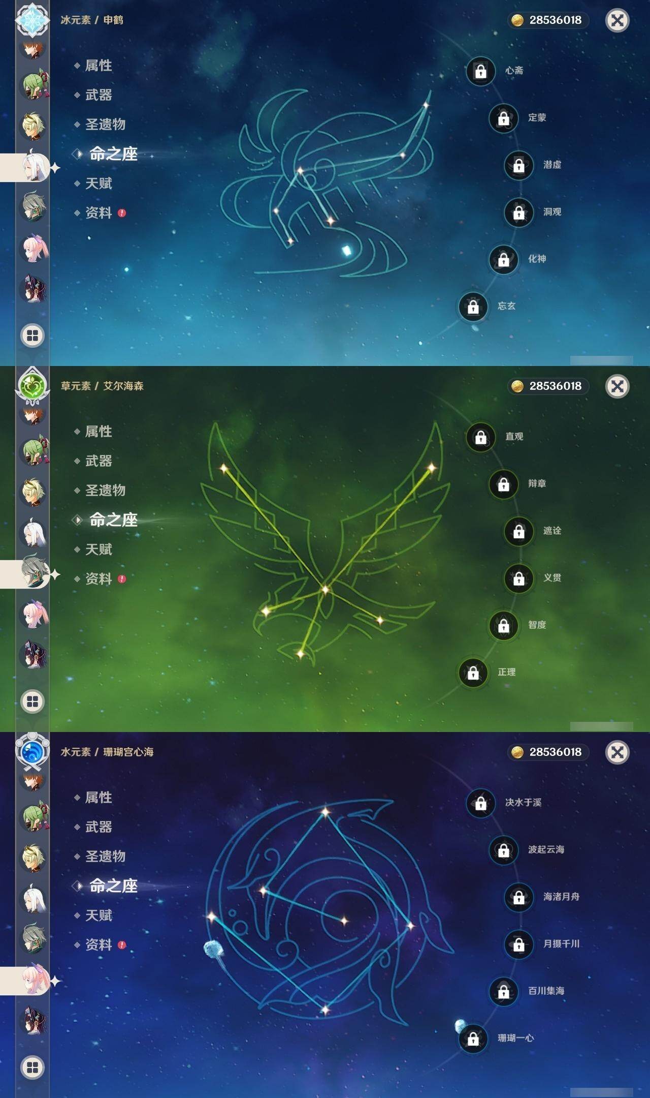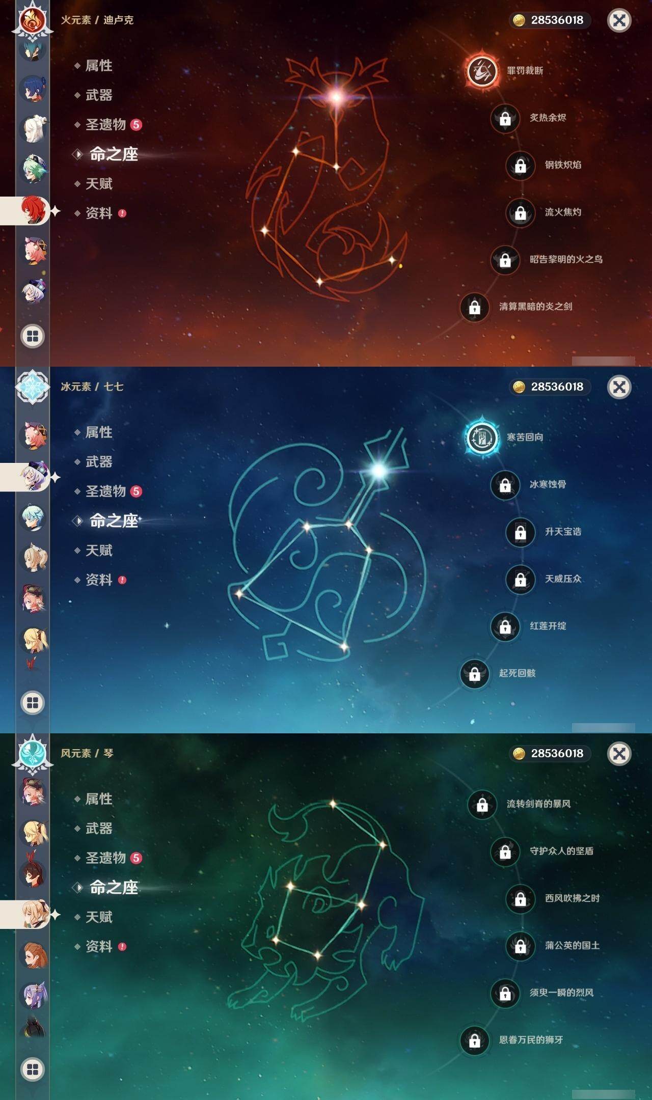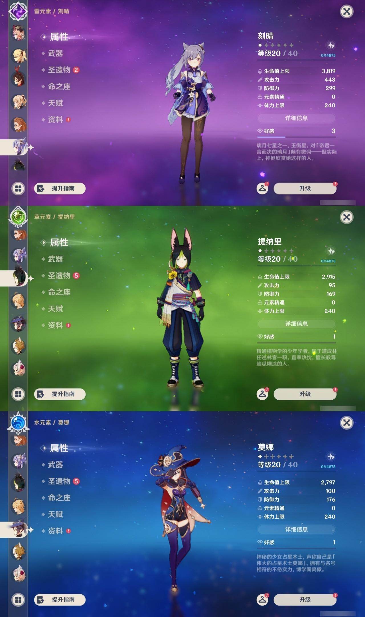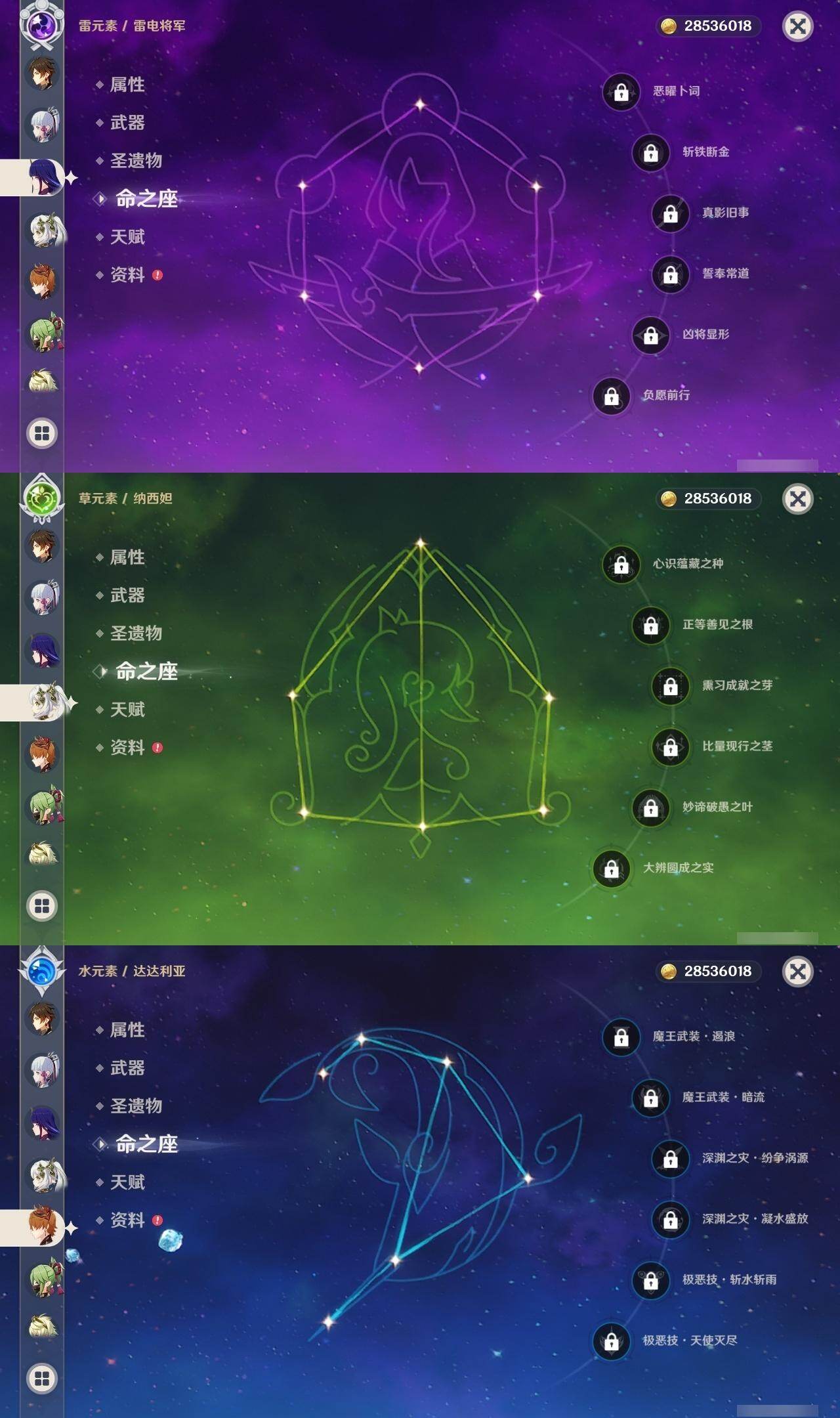 2命芙宁娜,0命艾尔海森,0命纳西妲,1命提纳里,0命夜兰,0命神里绫人,0命申鹤,0命雷电将军,0命枫原万叶,0命神里绫华,0命钟离,0命达达利亚,0命珊瑚宫心海,1命刻晴,1命七七,0命琴,1命莫娜,1命迪卢克,精1飞雷之弦振,精1磐岩结绿,精1天空之脊,精1阿莫斯之弓