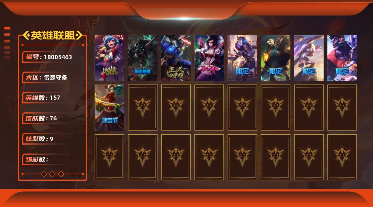 [18005463]铂金段位-157英雄-76皮肤-9炫彩-0终极-1神话-10限定-5传说-20史诗