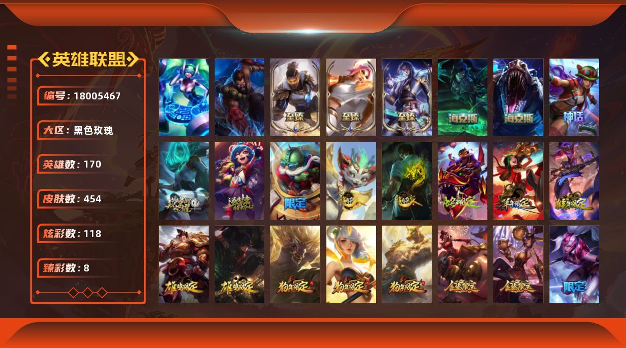 [18005467]未定级段位-170英雄-454皮肤-118炫彩-2终极-9神话-87限定-51传说-103史诗