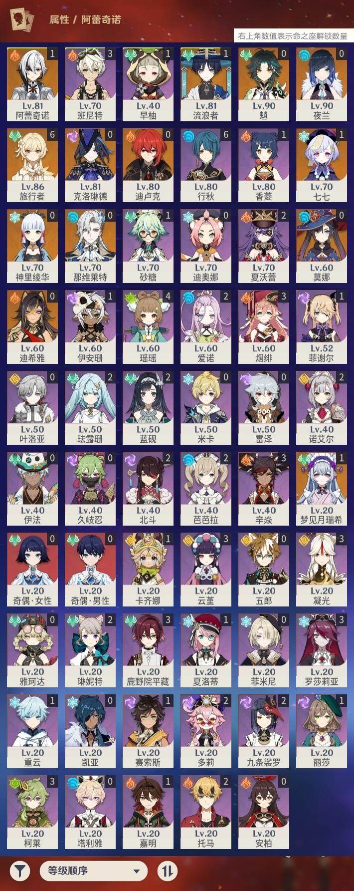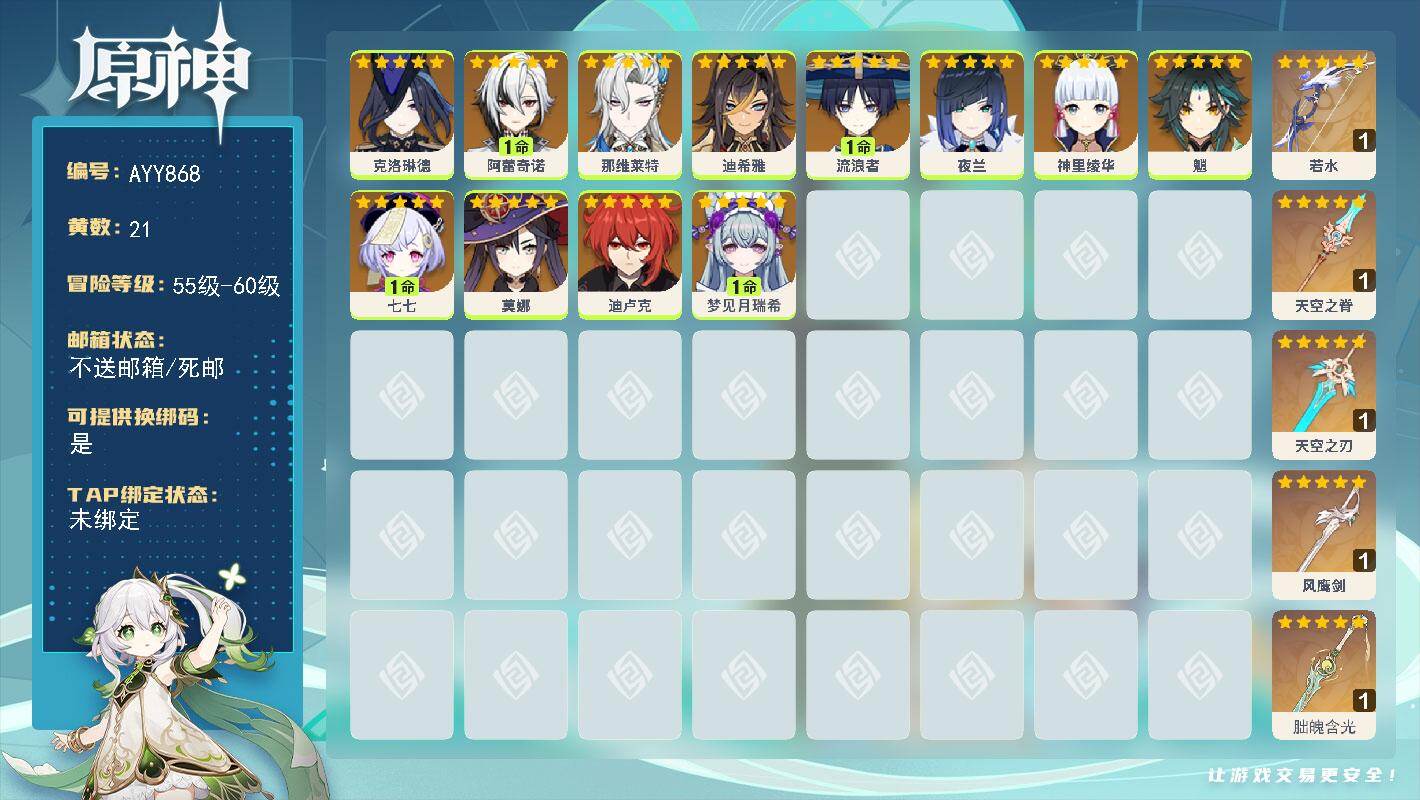 - [17407836]58级/30黄/女主/20个五星角色/6个五星武器 0命阿蕾奇诺,0命娜维娅,0命迪希雅,0命纳西妲,0命妮露,0命提纳里,0命神里绫人,0命荒泷一斗,0命枫原万叶,0命神里绫华,0命钟离,0命胡桃,0命魈,0命可莉,0命刻晴,0命七七,3命琴,0命莫娜,1命迪卢克,0命梦见月瑞希,精1飞雷之弦振,精1雾切之回光,精1和璞鸢,精1天空之脊,精1阿莫斯之弓,精1狼的末路