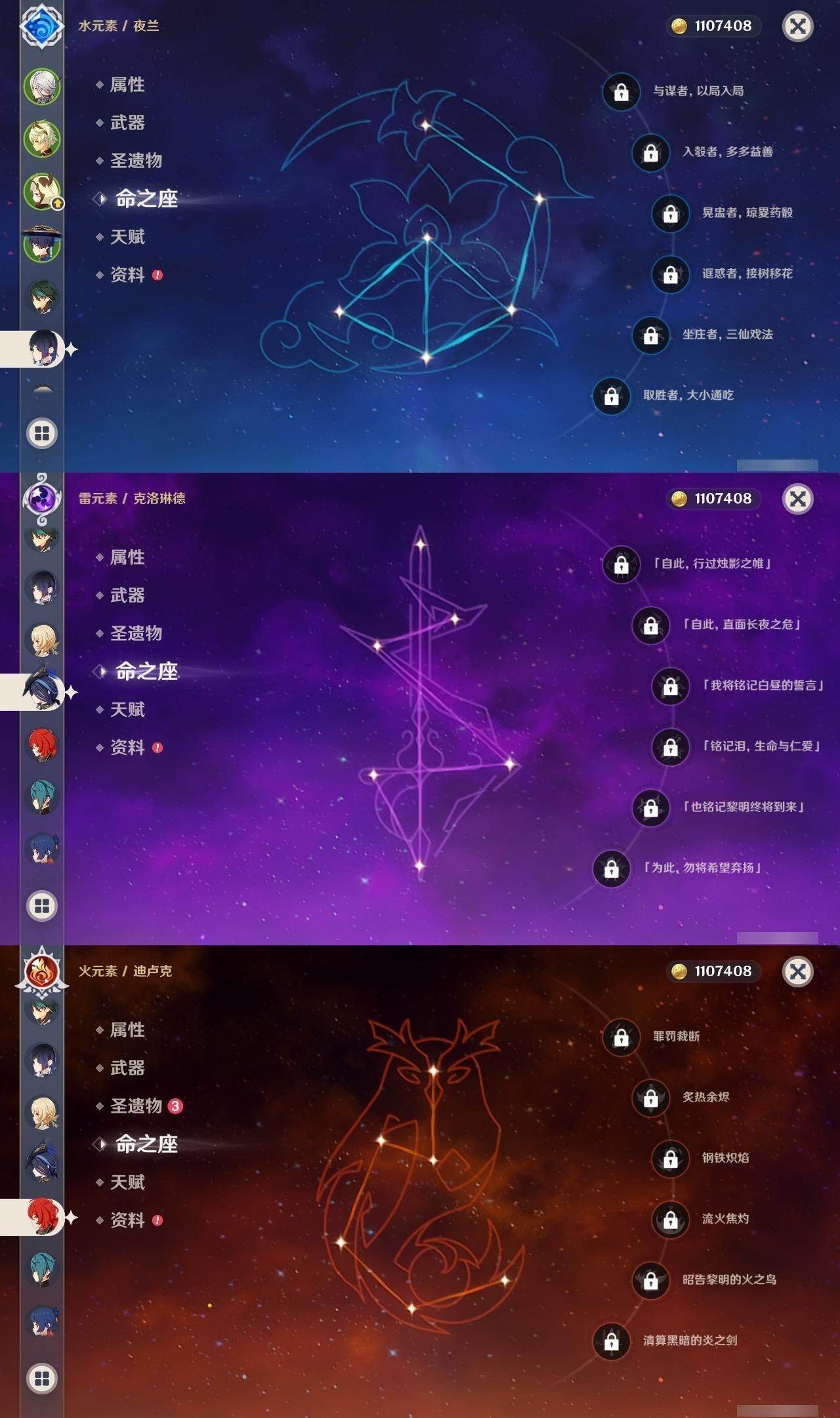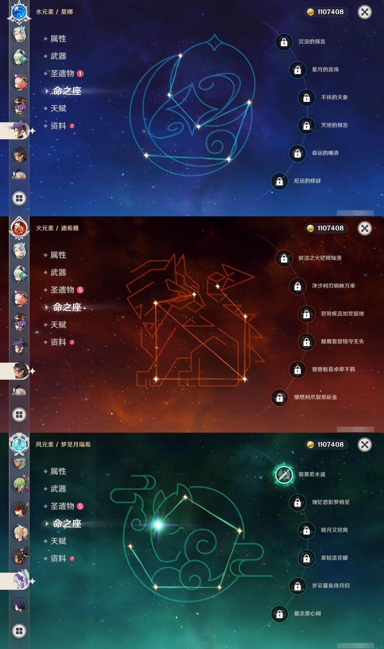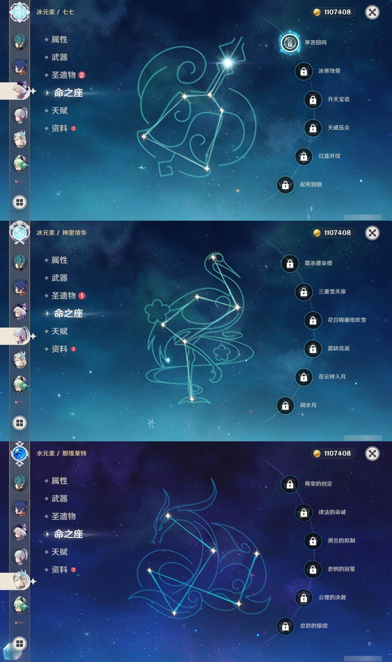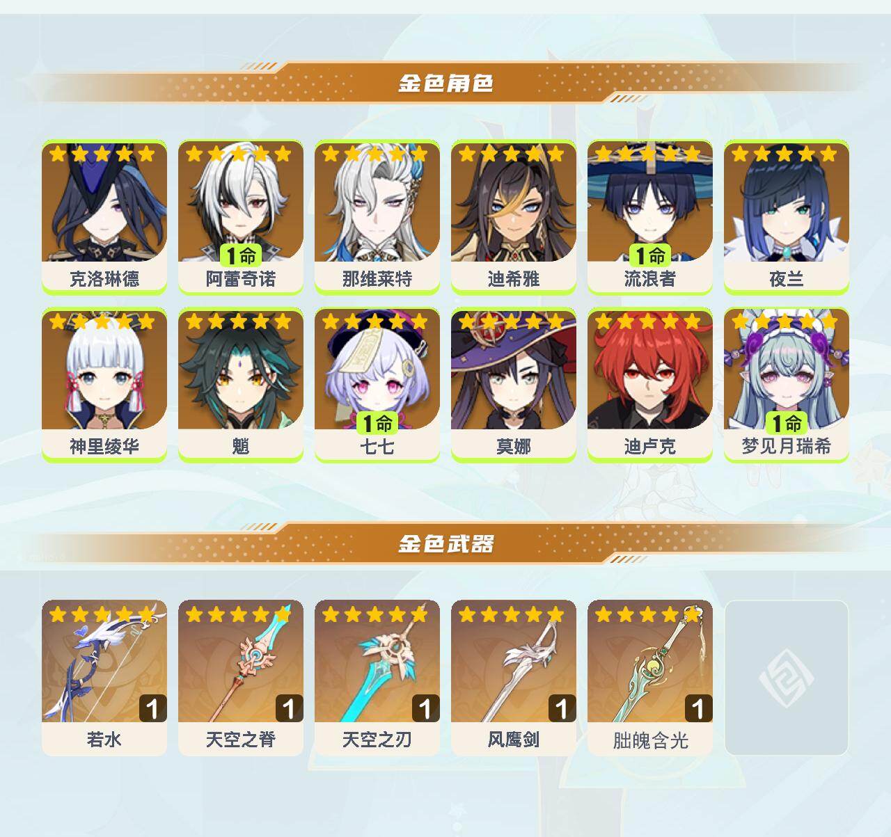 0命克洛琳德,1命阿蕾奇诺,0命那维莱特,0命迪希雅,1命流浪者,0命夜兰,0命神里绫华,0命魈,1命七七,0命莫娜,0命迪卢克,1命梦见月瑞希,精1若水,精1天空之脊,精1天空之刃,精1风鹰剑,精1朏魄含光