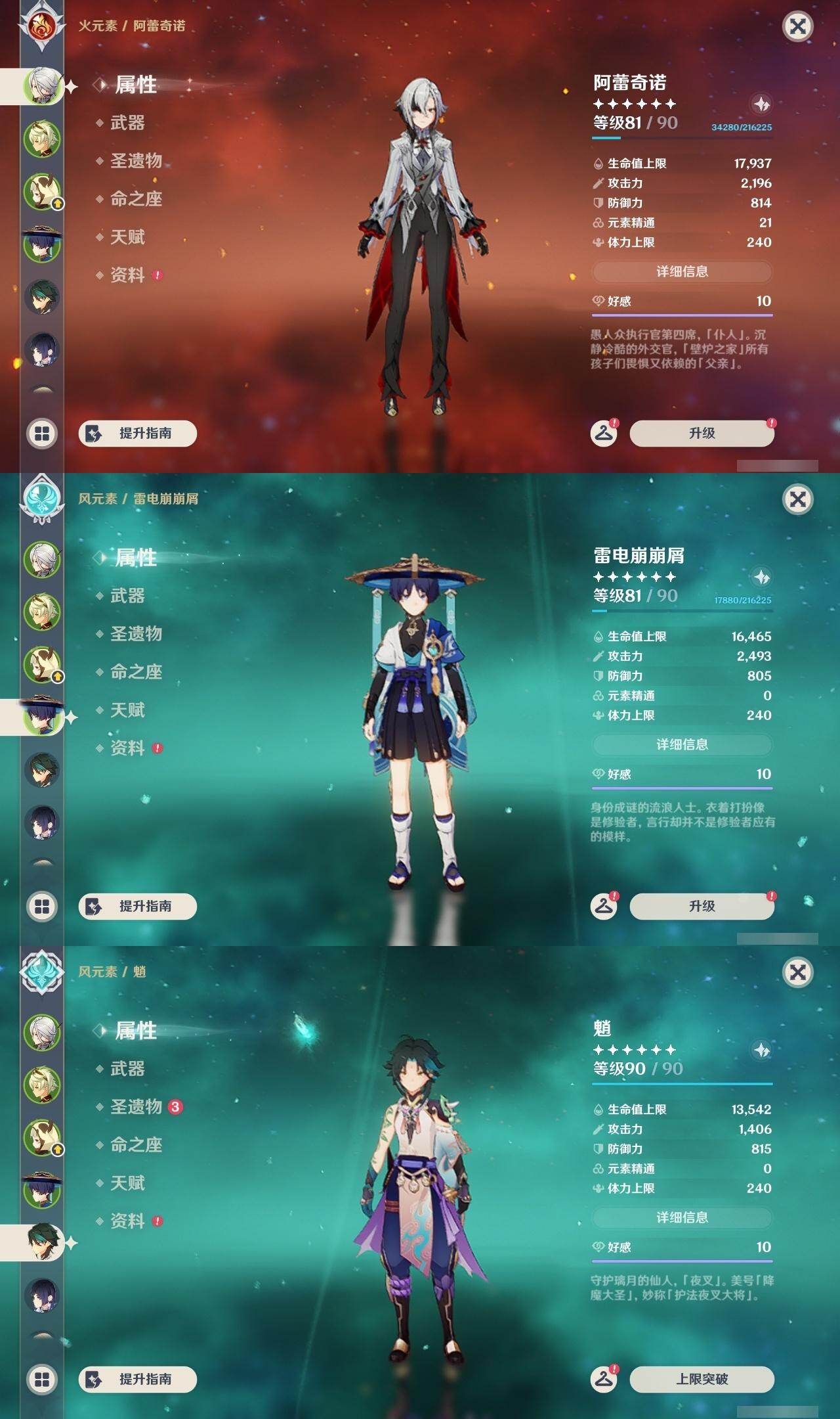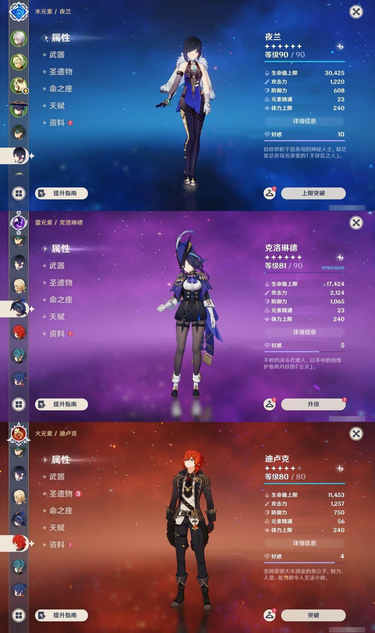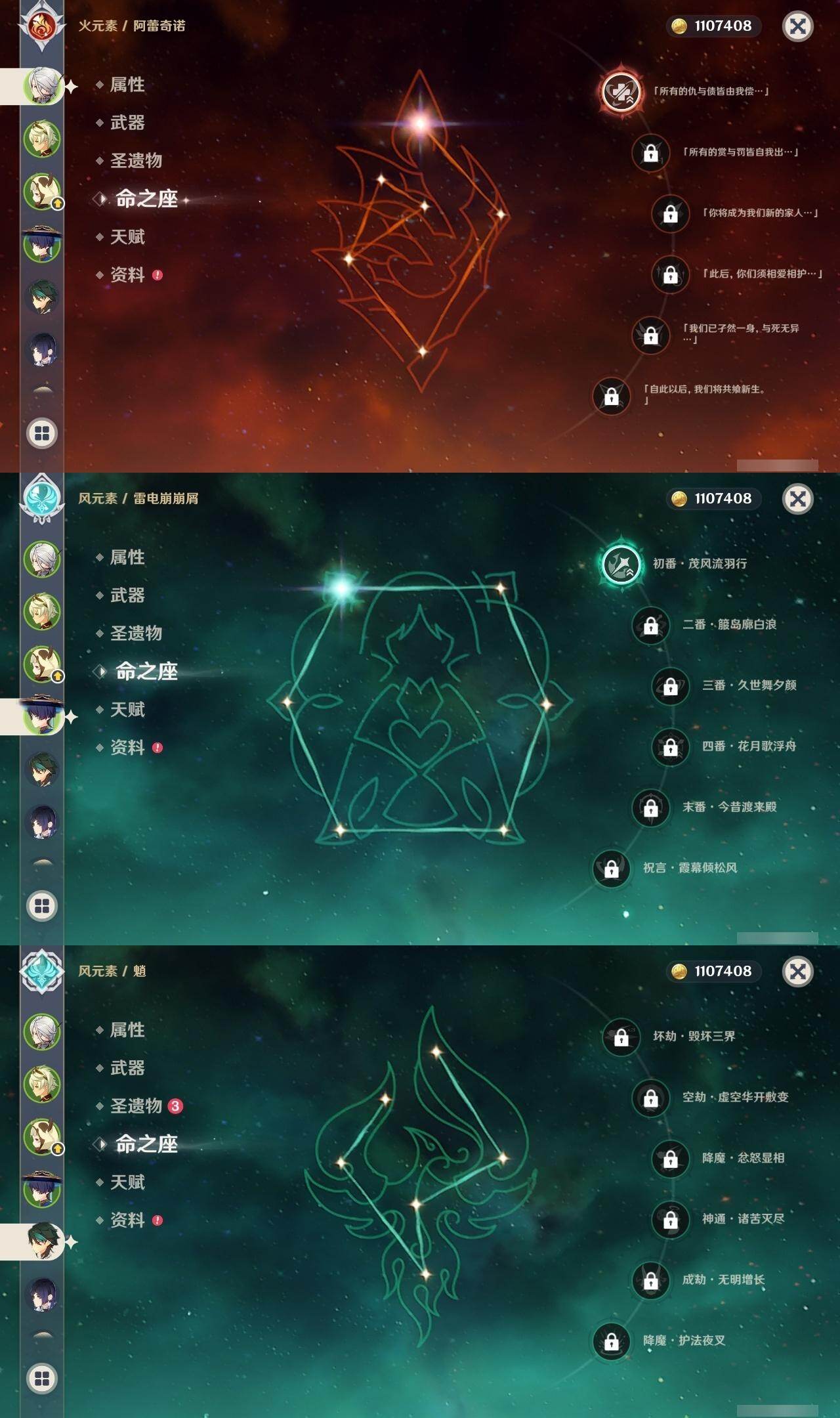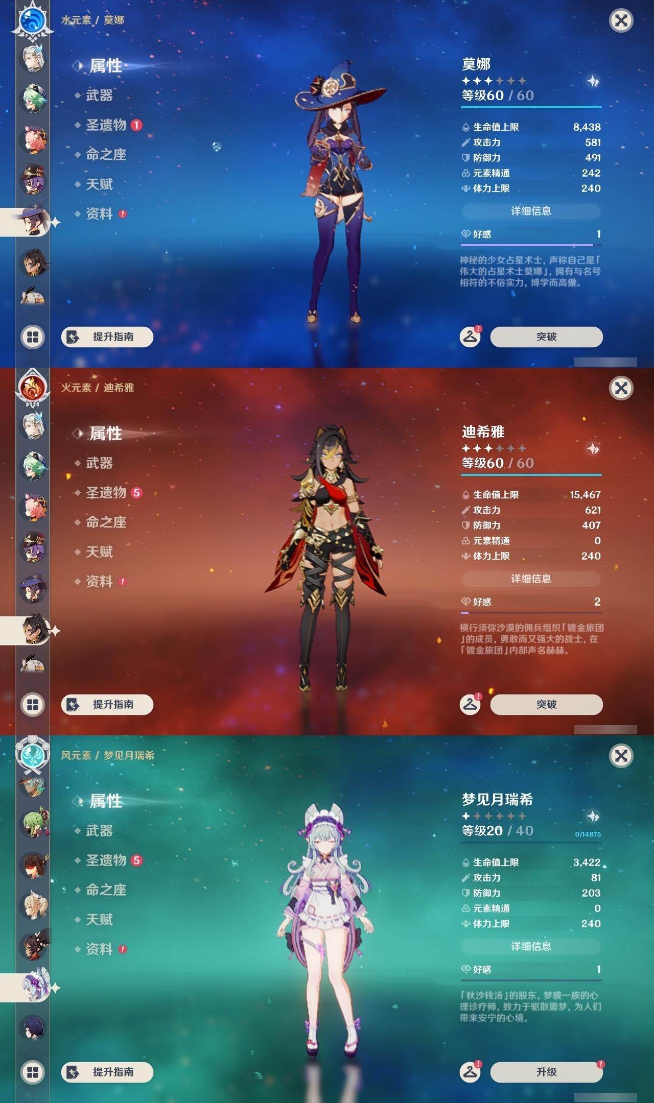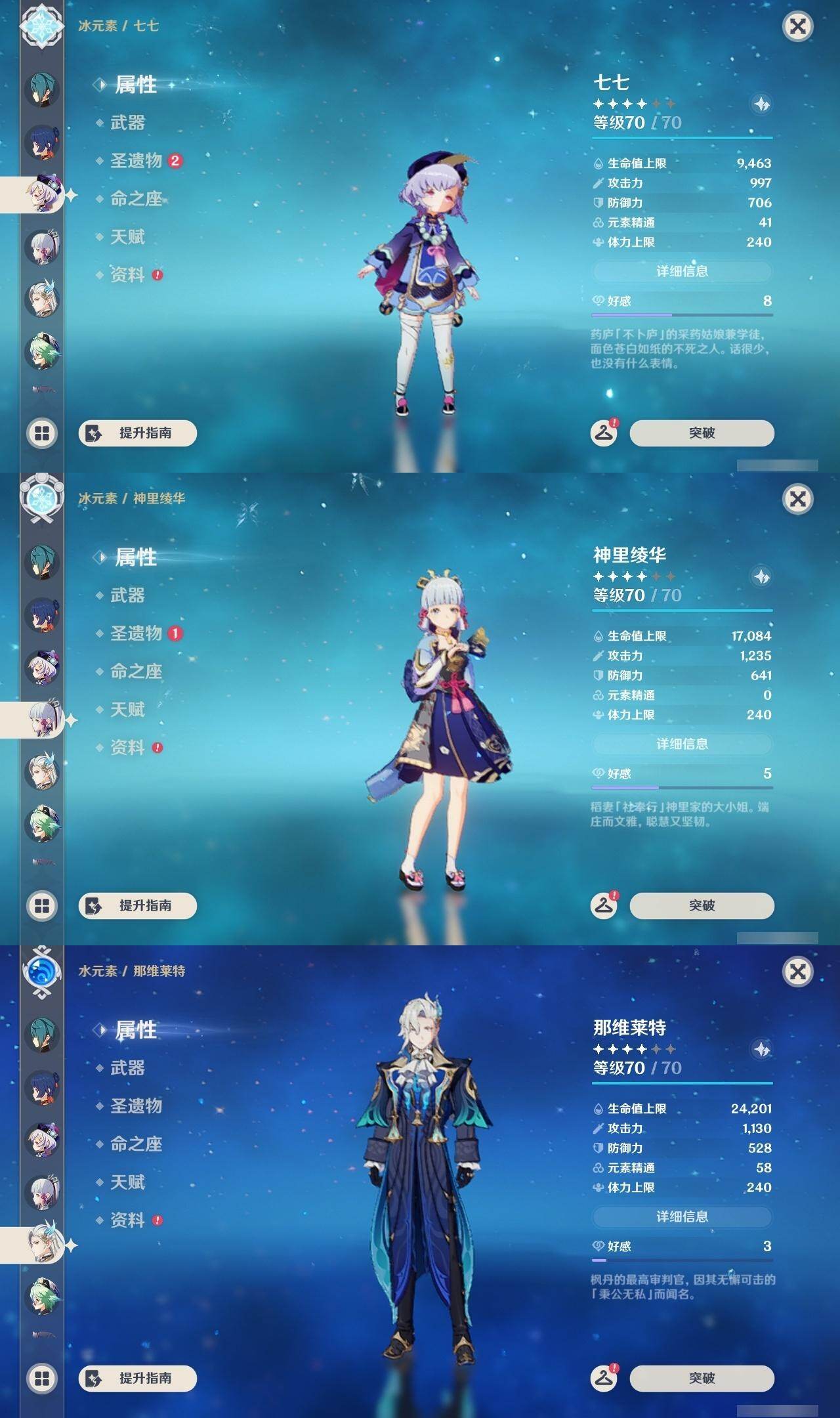 0命克洛琳德,1命阿蕾奇诺,0命那维莱特,0命迪希雅,1命流浪者,0命夜兰,0命神里绫华,0命魈,1命七七,0命莫娜,0命迪卢克,1命梦见月瑞希,精1若水,精1天空之脊,精1天空之刃,精1风鹰剑,精1朏魄含光