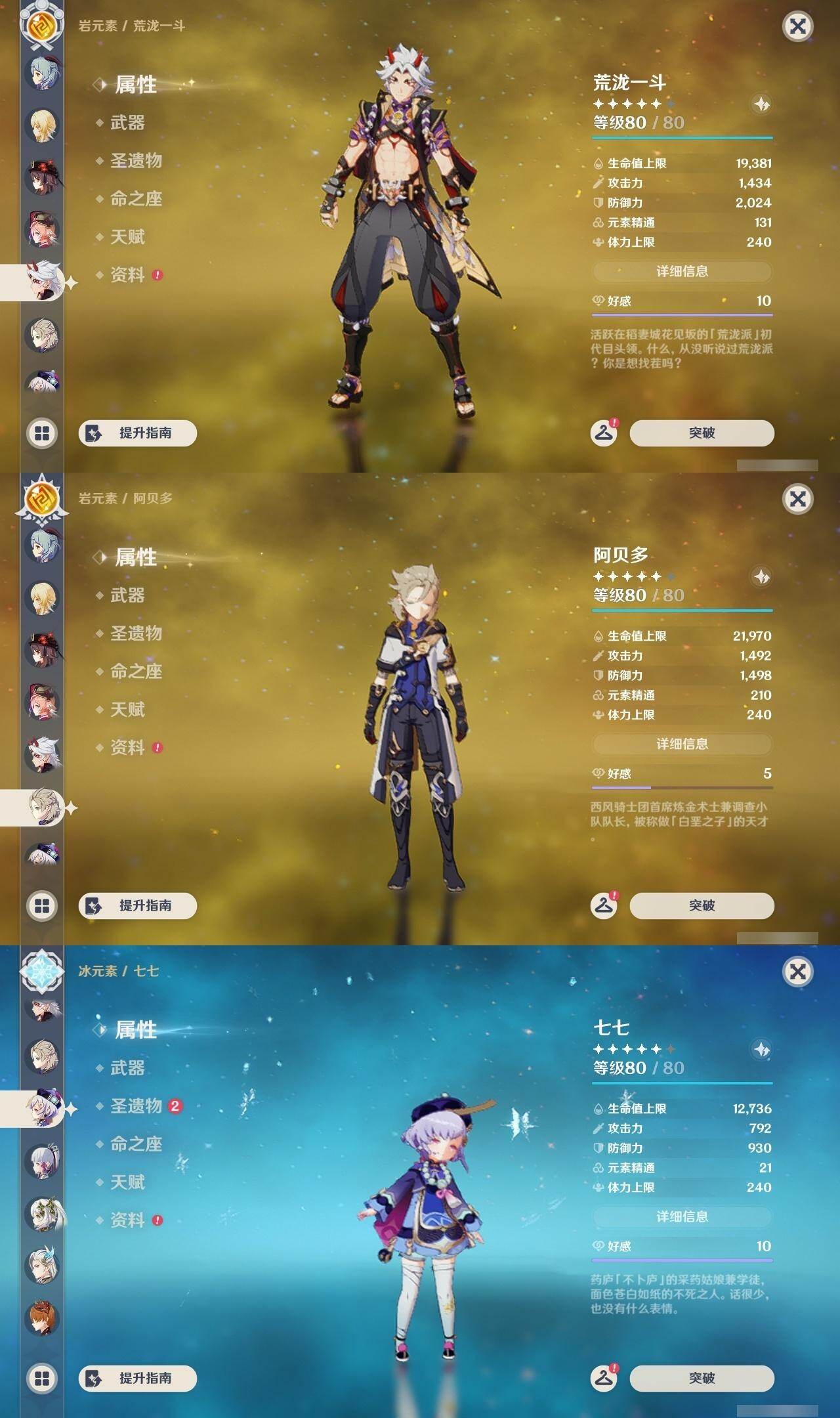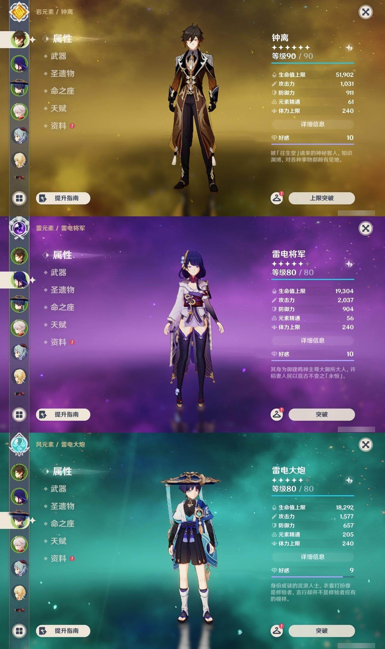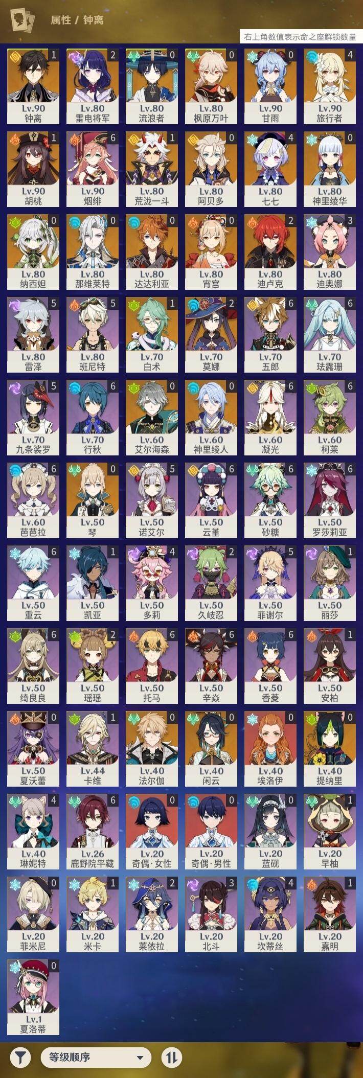 钟离,雷电将军,枫原万叶,甘雨,胡桃,荒泷一斗,阿贝多,七七,神里凌华,达达利亚,宵宫,迪卢克,莫娜,琴