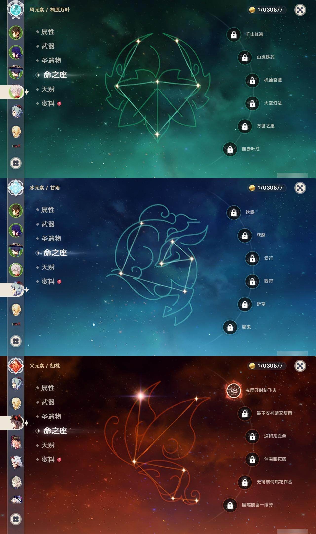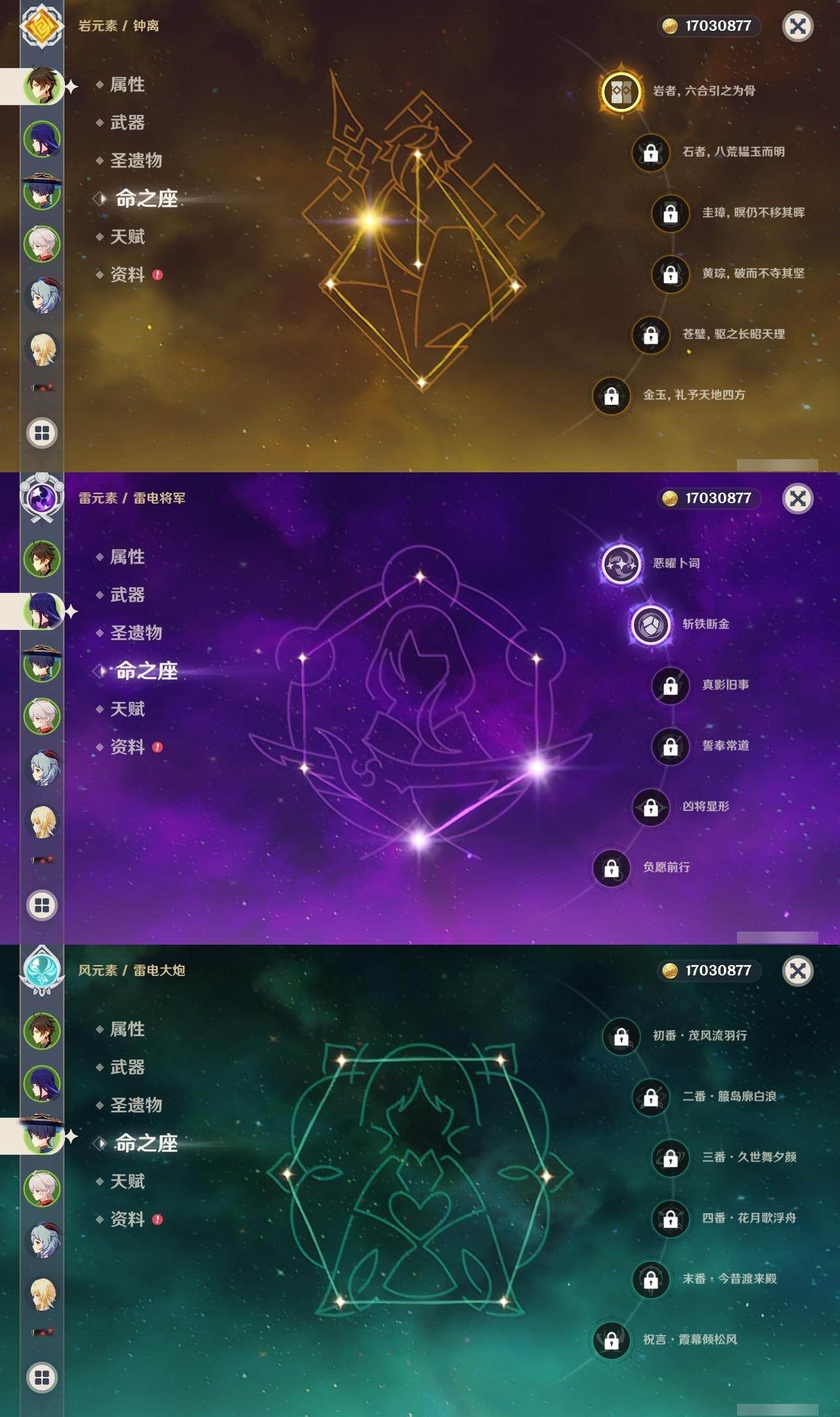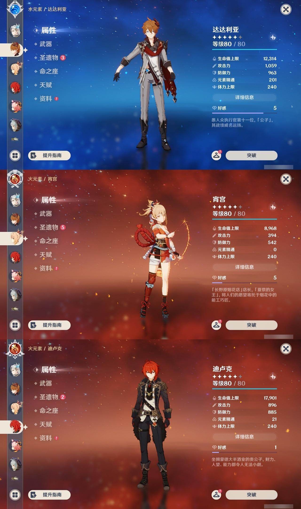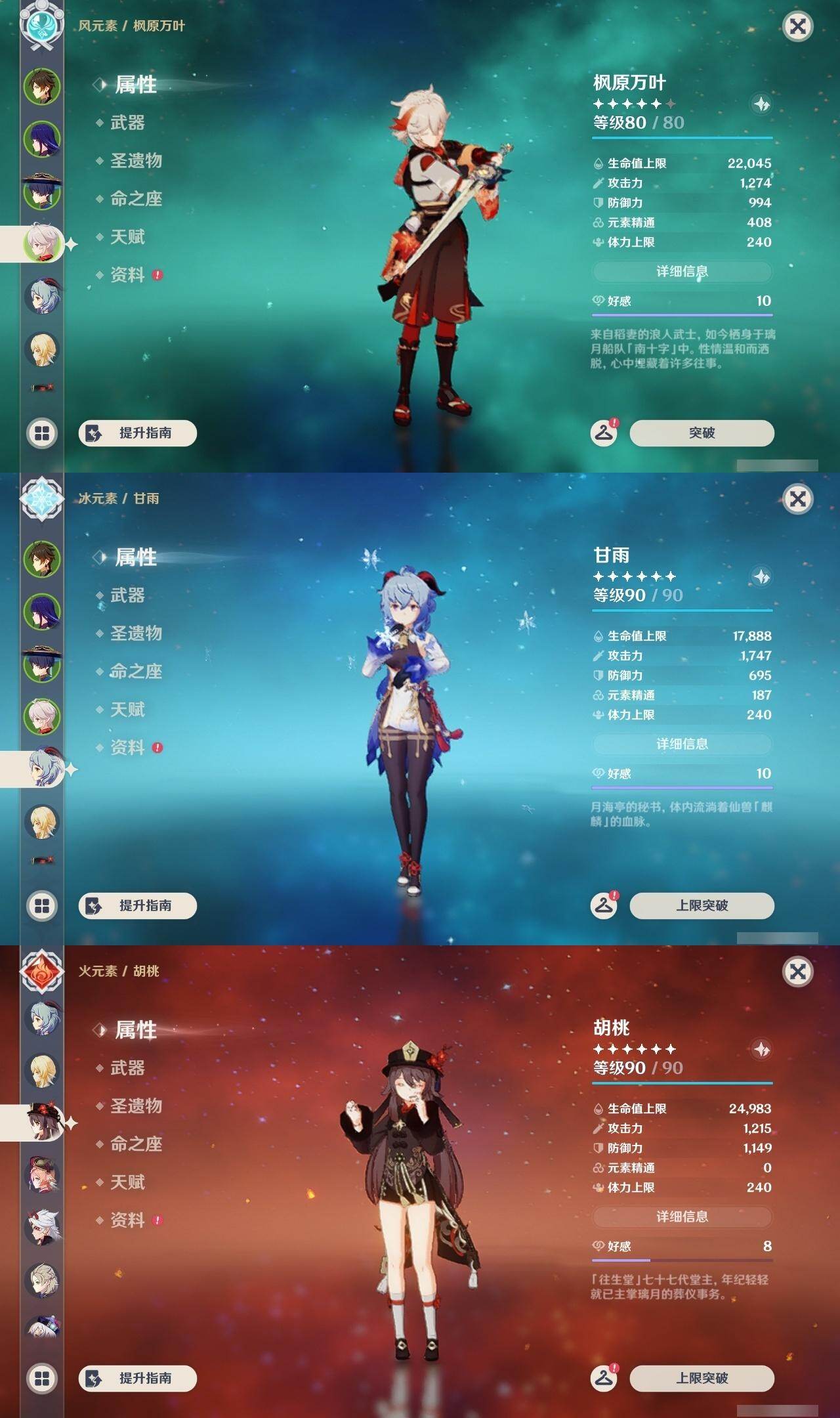 钟离,雷电将军,枫原万叶,甘雨,胡桃,荒泷一斗,阿贝多,七七,神里凌华,达达利亚,宵宫,迪卢克,莫娜,琴