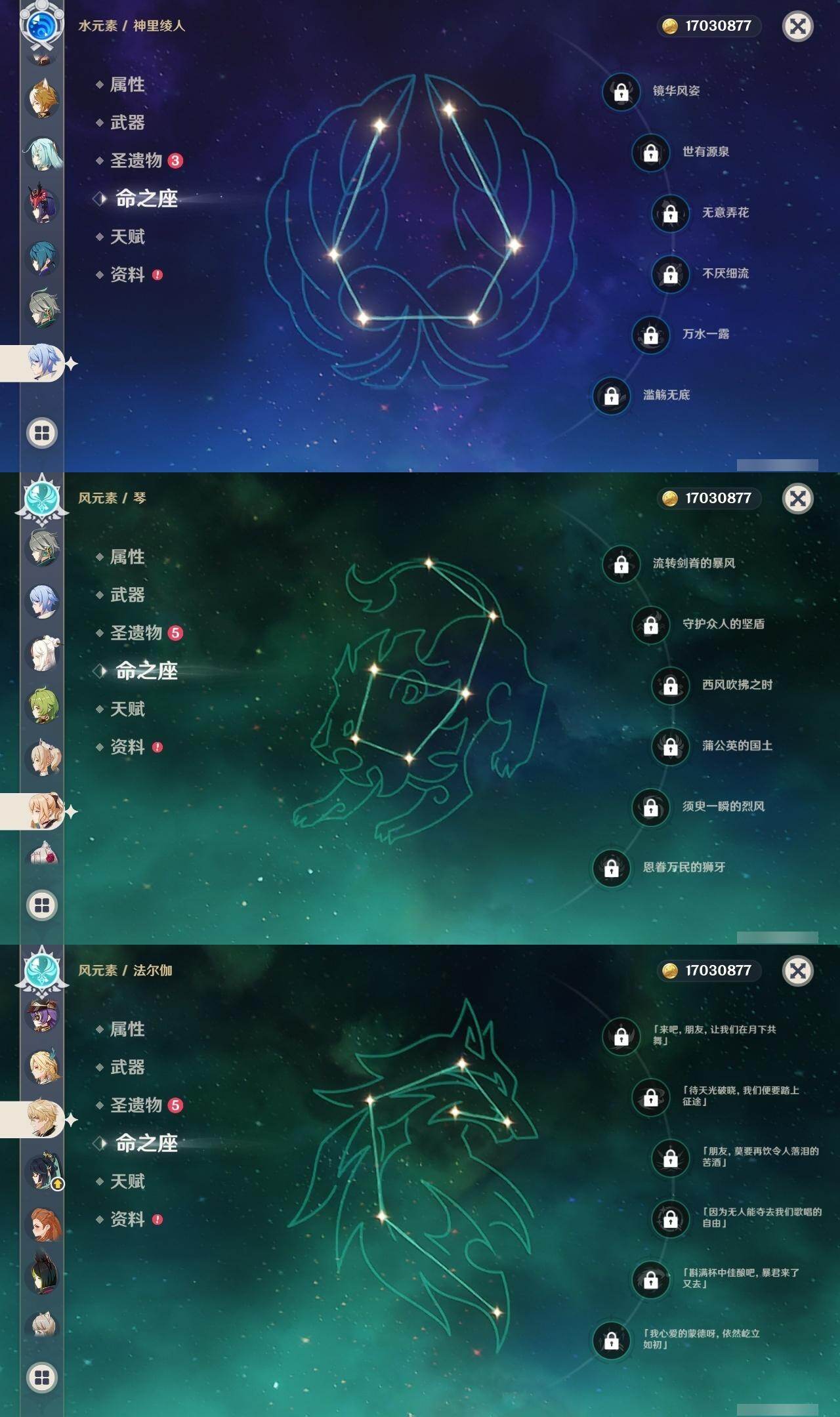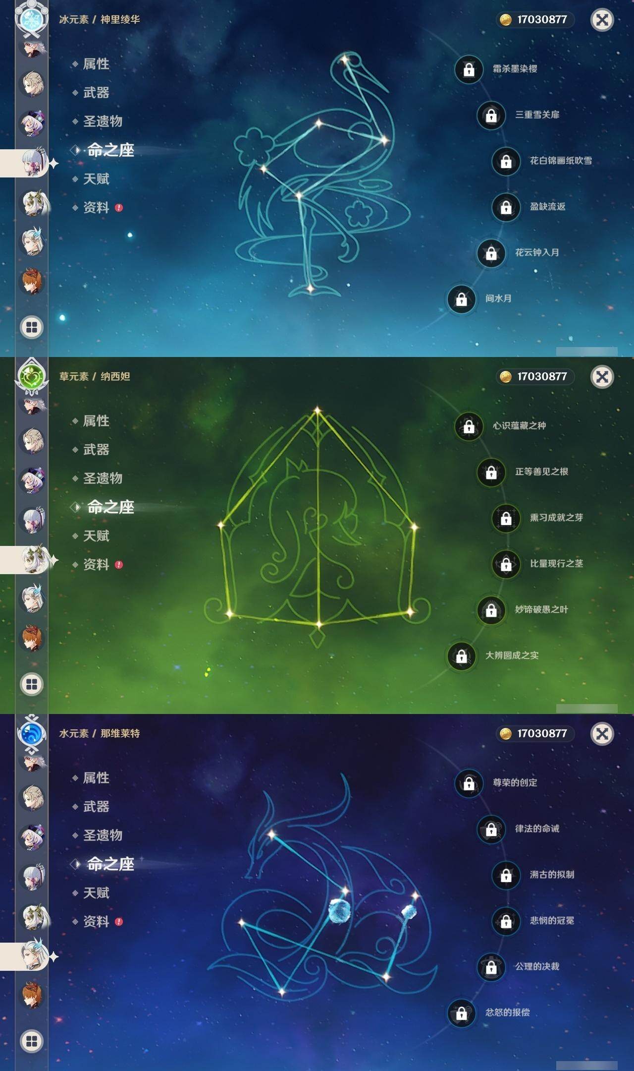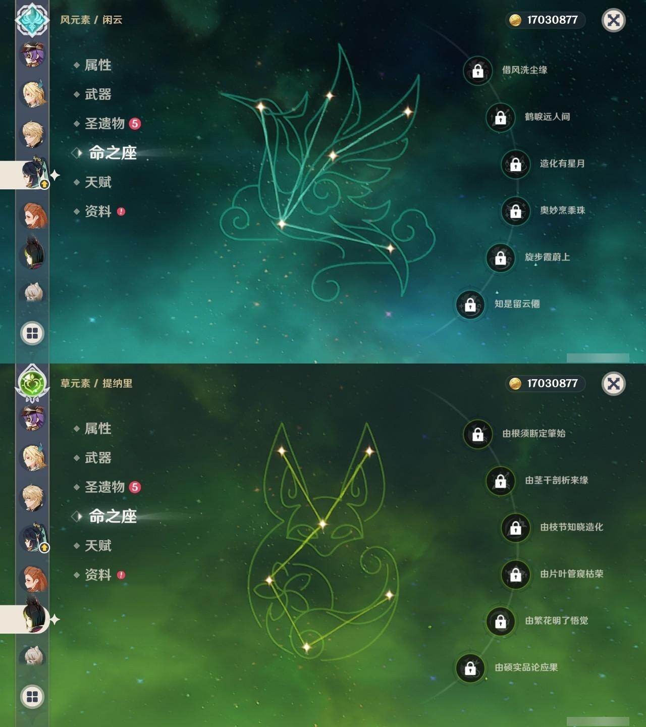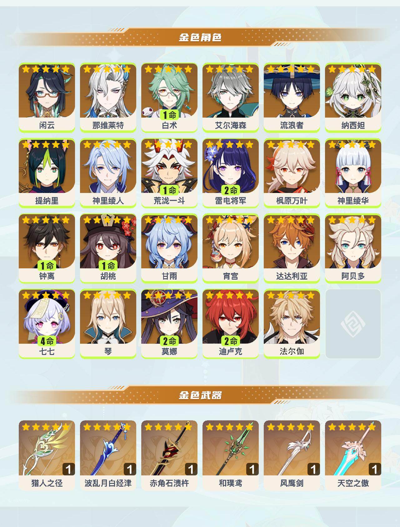 0命闲云,0命那维莱特,1命白术,0命艾尔海森,0命流浪者,0命纳西妲,0命提纳里,0命神里绫人,1命荒泷一斗,2命雷电将军,0命枫原万叶,0命神里绫华,1命钟离,1命胡桃,0命甘雨,0命宵宫,0命达达利亚,0命阿贝多,4命七七,0命琴,2命莫娜,2命迪卢克,0命法尔伽,精1猎人之径,精1波乱月白经津,精1赤角石溃杵,精1和璞鸢,精1风鹰剑,精1天空之傲