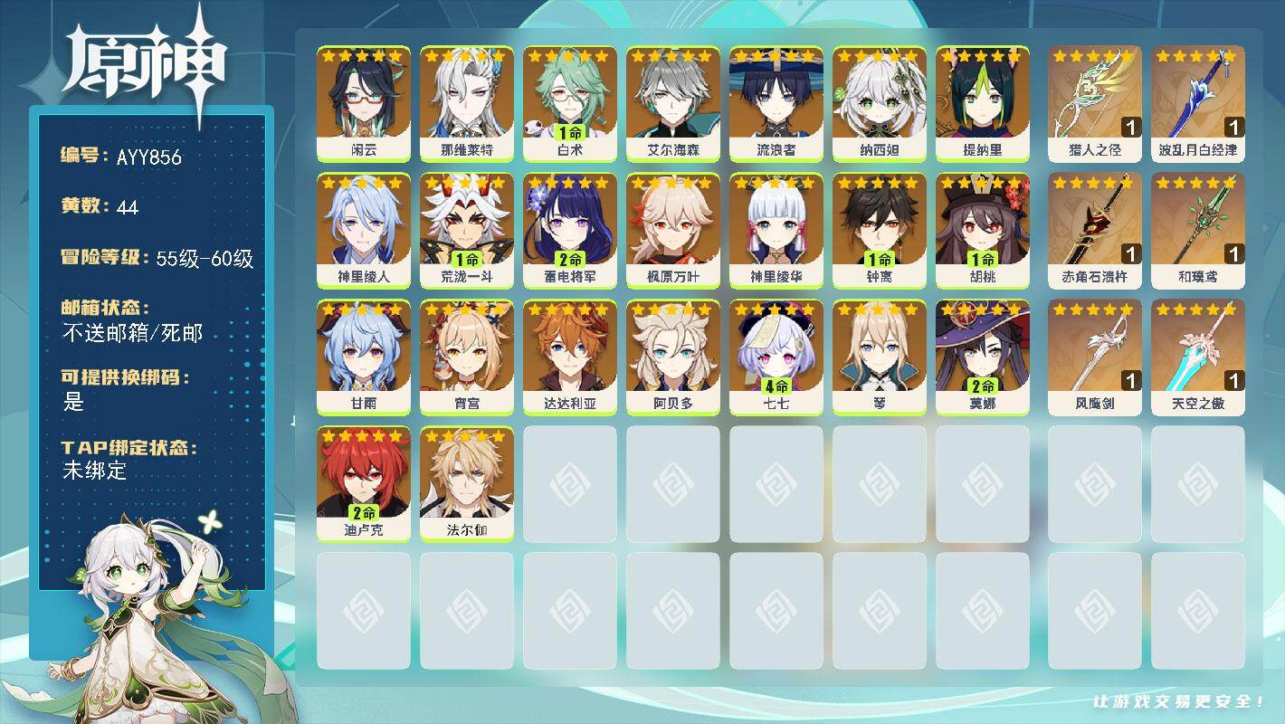 [18005510]58级/44黄/女主/23个五星角色/7个五星武器 0命闲云,0命那维莱特,1命白术,0命艾尔海森,0命流浪者,0命纳西妲,0命提纳里,0命神里绫人,1命荒泷一斗,2命雷电将军,0命枫原万叶,0命神里绫华,1命钟离,1命胡桃,0命甘雨,0命宵宫,0命达达利亚,0命阿贝多,4命七七,0命琴,2命莫娜,2命迪卢克,0命法尔伽,精1猎人之径,精1波乱月白经津,精1赤角石溃杵,精1和璞鸢,精1风鹰剑,精1天空之傲