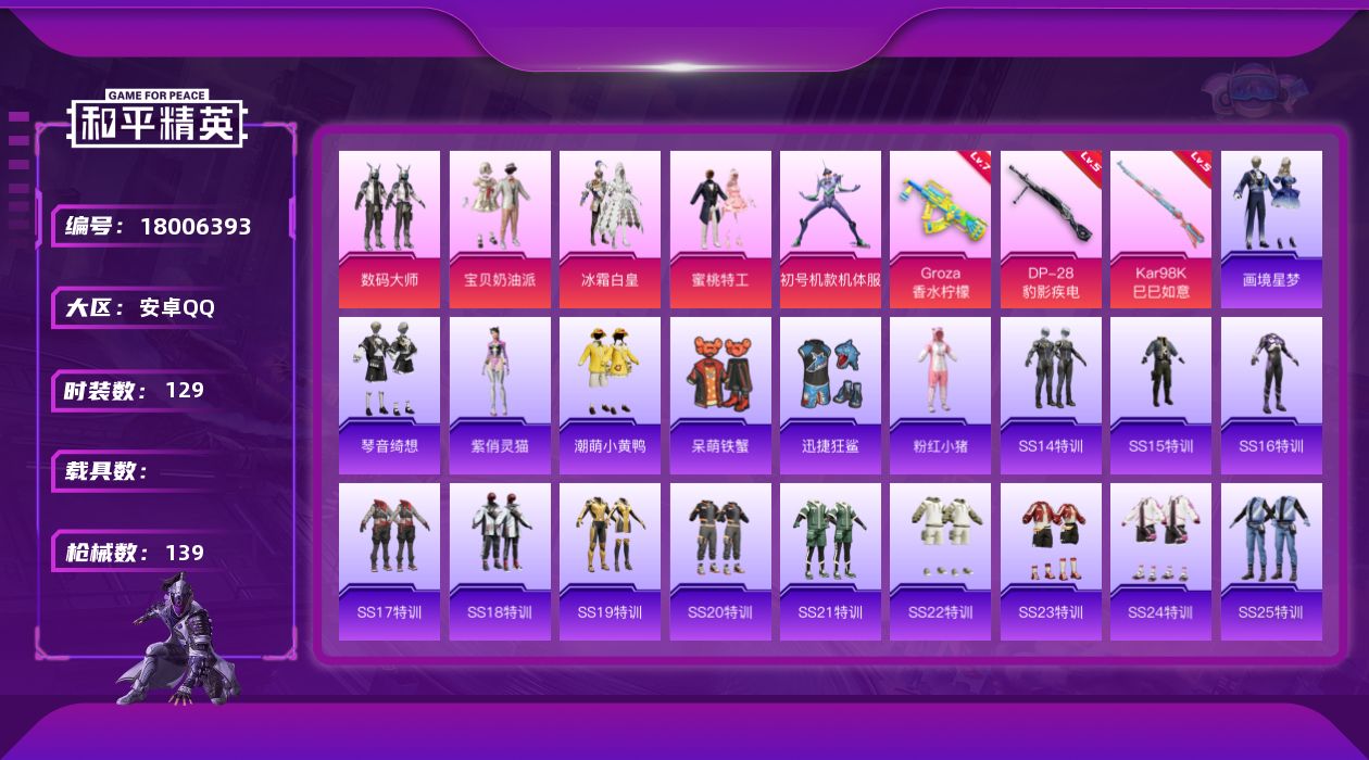 [18006393]安卓 手Q-6粉装-5特效枪-0载具-1粉色飞行器-45653热力值-8王牌印记-129套装-139枪皮 【热门品类】:套装-潮萌小黄鸭,套装-粉红小猪 【粉色套装】:粉装-数码大师,粉装-宝贝奶油派,粉装-冰霜白皇,粉装-蜜桃特工,角色-初号机款机体服,角色-罪夜之冕 【粉色枪皮等级】:GROZA-香水柠檬(七级),Kar98K-巳巳如意(五级),Mk14-福马献瑞(五级),DP-28-豹影疾电(五级),PKM-萌骑夺宝(三级) 【粉色枪皮】:GROZA-香水柠檬,Kar98K-巳巳如意,Mk14-福马献瑞,DP-28-豹影疾电,PKM-萌骑夺宝 【粉色飞行器】:炫彩糖果飞行器 【粉色降落伞】:百万伏特降落伞,甜心宝贝降落伞,梦幻火箭降落伞,香水柠檬降落伞,烈焰拳霸降落伞,洛神天依降落伞,蓝莓炮弹降落伞,垂柳戏鸭降落伞,炫彩糖果降落伞 【稀有套装】:套装-雪国风尚,套装-炫彩糖果,套装-马上有钱,角色-紫俏灵猫,套装-画境星梦,套装-琴音绮想,套装-雨过天青,套装-红釉青花,角色-暖阳柴柴 【稀有枪皮】:AUG-冰晶雪宝,AKM-冰凉西瓜,AKM-夜灯,AKM-破晓战魂,AKM-萌趣颜团子,AKM-虎虎生威,M16A4-幻世战舞者,M16A4-甜心亚梦,M16A4-蓝色火焰,SCAR-L-炫彩节奏,SCAR-L-玉兔迎春,SCAR-L-粉色回忆,M416-糯团青竹,M416-红色方程式,M416-蓝色火焰,GROZA-彩虹符号,GROZA-治愈之星,GROZA-荧海星豚,AUG-青春冒险家,QBZ-彩虹符号,QBZ-洛神天依,M762-天降萌叽,M762-瑞龙福将,M762-甜心宝贝,Mk47-洛神天依,Mk47-青春冒险家,G36C-暗夜玫瑰,AC-VAL-天降萌叽,AC-VAL-甜心亚梦,蜜獾-娇憨猪猪,ACE32-画境星梦,UZI-娇憨猪猪,UZI-炫彩节奏,UZI-红色方程式,UMP45-蓝色火焰,UMP45-诡娃娃,Vector-彩虹符号,Vector-暗夜玫瑰,Vector-治愈之星,Vector-香水柠檬,汤姆逊-耀粉歌者,汤姆逊-银刃赛罗,野牛-王牌四分卫,野牛-电玩视界,野牛-青春冒险家,MP5K-怪笑疯兔,MP5K-蓝莓炮弹,MP5K-画境星梦,Kar98K-彩虹符号,Kar98K-洛神天依,M24-治愈之星,AWM-雷霆特警,SKS-夜灯,