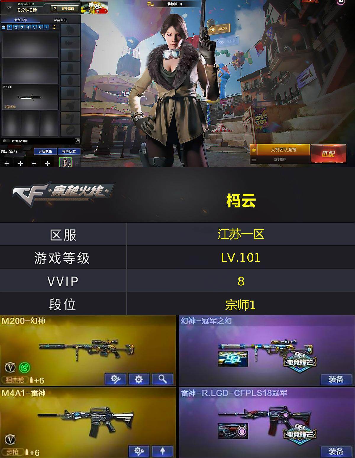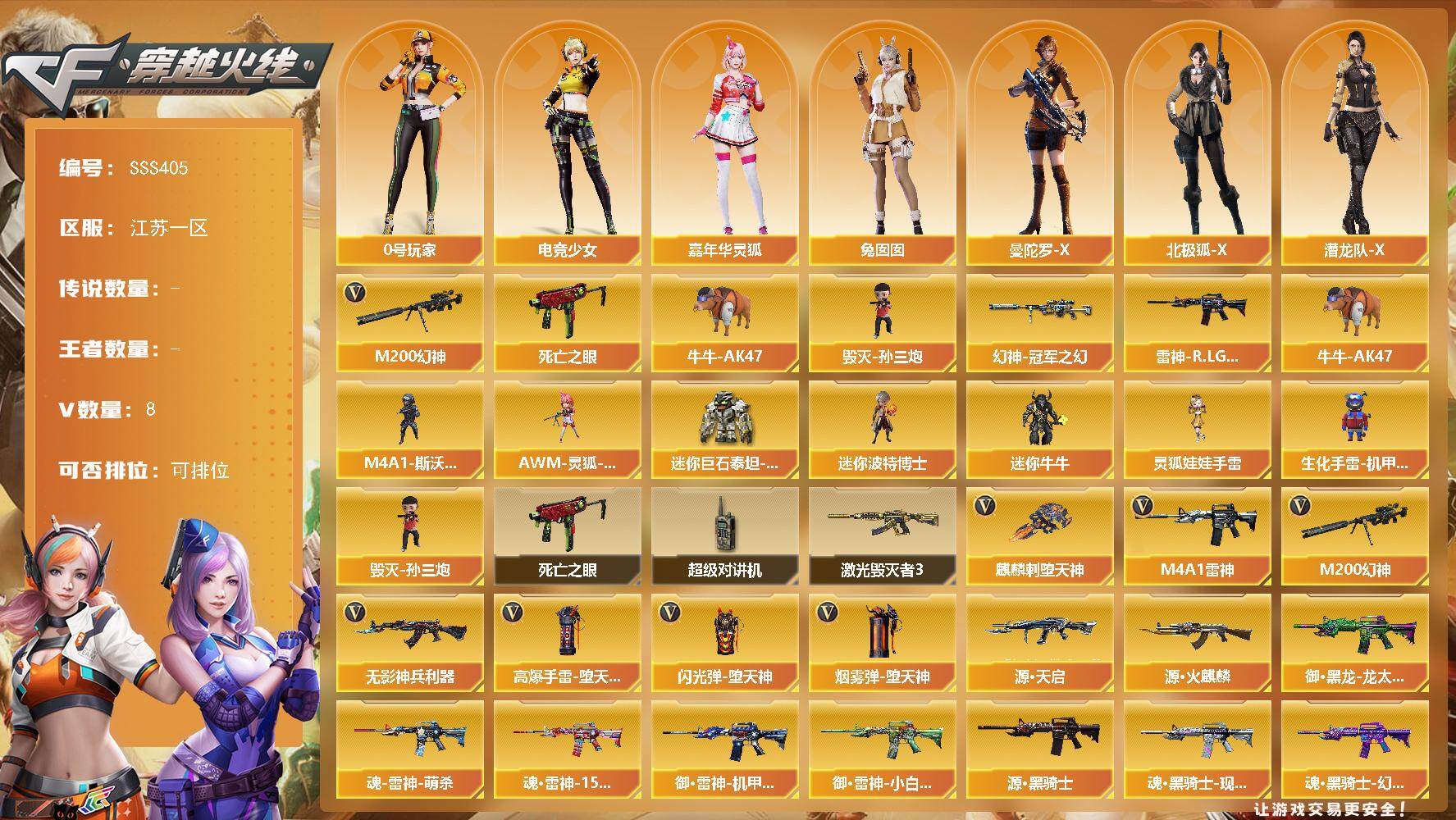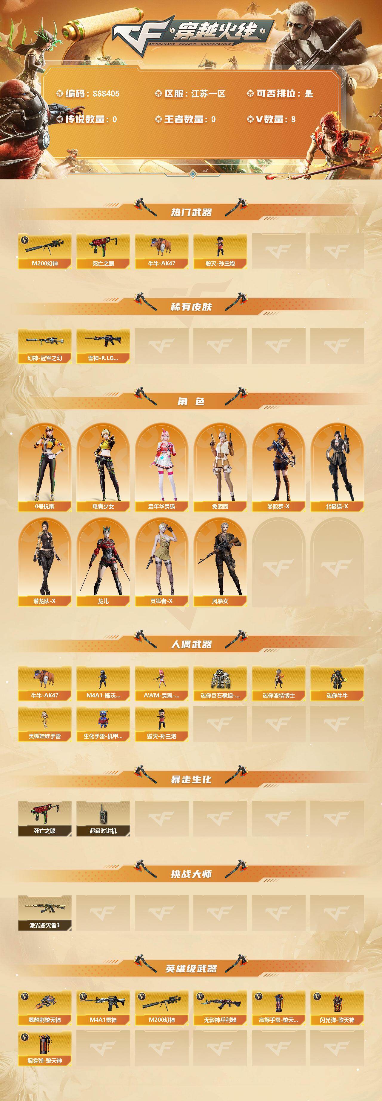 [18006444]江苏一区-8V-0王者武器数-0炫金武器数 【热门武器】:M200-幻神,死亡之眼,牛牛-AK47,毁灭-孙三炮 【皮肤】:幻神-冠军之幻,雷神-R.LGD-CFPLS18冠军 【角色】:北极狐-X,电竞少女,风暴女,嘉年华灵狐,0号玩家,灵狐者-X,龙儿,曼陀罗-X,潜龙队-X,兔囡囡 【人偶武器】:毁灭-孙三炮,AWM-灵狐-15周年嘉年华,牛牛-AK47,迷你波特博士,迷你牛牛,生化手雷-机甲核心*3,M4A1-斯沃特,迷你巨石泰坦-魔花研究所,灵狐娃娃手雷*2 【暴走生化】:死亡之眼,超级对讲机 【挑战大师】:激光毁灭者III 【英雄级武器】:M4A1-雷神,无影-神兵利器,M200-幻神,麒麟刺-堕天神,高爆手雷-堕天神*2,闪光弹-堕天神,烟雾弹-堕天神 【源级武器】:源·火麒麟,御·黑龙-龙太子*2,魂-雷神-萌杀,魂·雷神-15周年嘉年华,御·雷神-机甲刑天,御·雷神-小白龙,源·黑骑士,魂·黑骑士-现代金属,魂·黑骑士-幻能朋克,魂·黑骑士-娜塔莉娅,御·黑骑士·哪吒闹海,源·天启,魂·超新星-春桃,源·武圣,魂·HK417-朱雀-凤灵,源·HK417-朱雀,源·玫瑰精灵,源-极光,魂·裁决-凤灵*3,源·毁灭,魂·毁灭-青帝,魂·毁灭-神秘黑洞,御·毁灭-黑大圣,魂·Barrett-朱雀- 新春神龙*2,源·Barrett-朱雀*3,灵·Barrett-朱雀-炫光,魂·炼狱-蒸汽钟表*2,御·炼狱-女娲,魂·修罗-15周年嘉年华,魂·修罗-神兵利器*2,源·天神,源·武圣glock,魂·屠龙-春桃,魂·屠龙-都是Cfer,魂·擎天-蒸汽钟表,源·擎天-萌杀,源·龙啸*2,魂·麒麟刺-神秘黑洞 【道具】:CFS限定背包,冰冰企鹅背包,战舰背包,超级背包,变异宝贝,迷雾幽灵,夺命之镰,防化服,金色流光-枪王排位*2,星辰流光-枪王排位,枪王排位28赛季金色流光,EP战队名片,EP战队喷图,EP战队击杀图标,C4-沙漠,防弹头盔*4,防弹衣*4,C4工具钳*4,手雷包*4 【特殊枪械】: