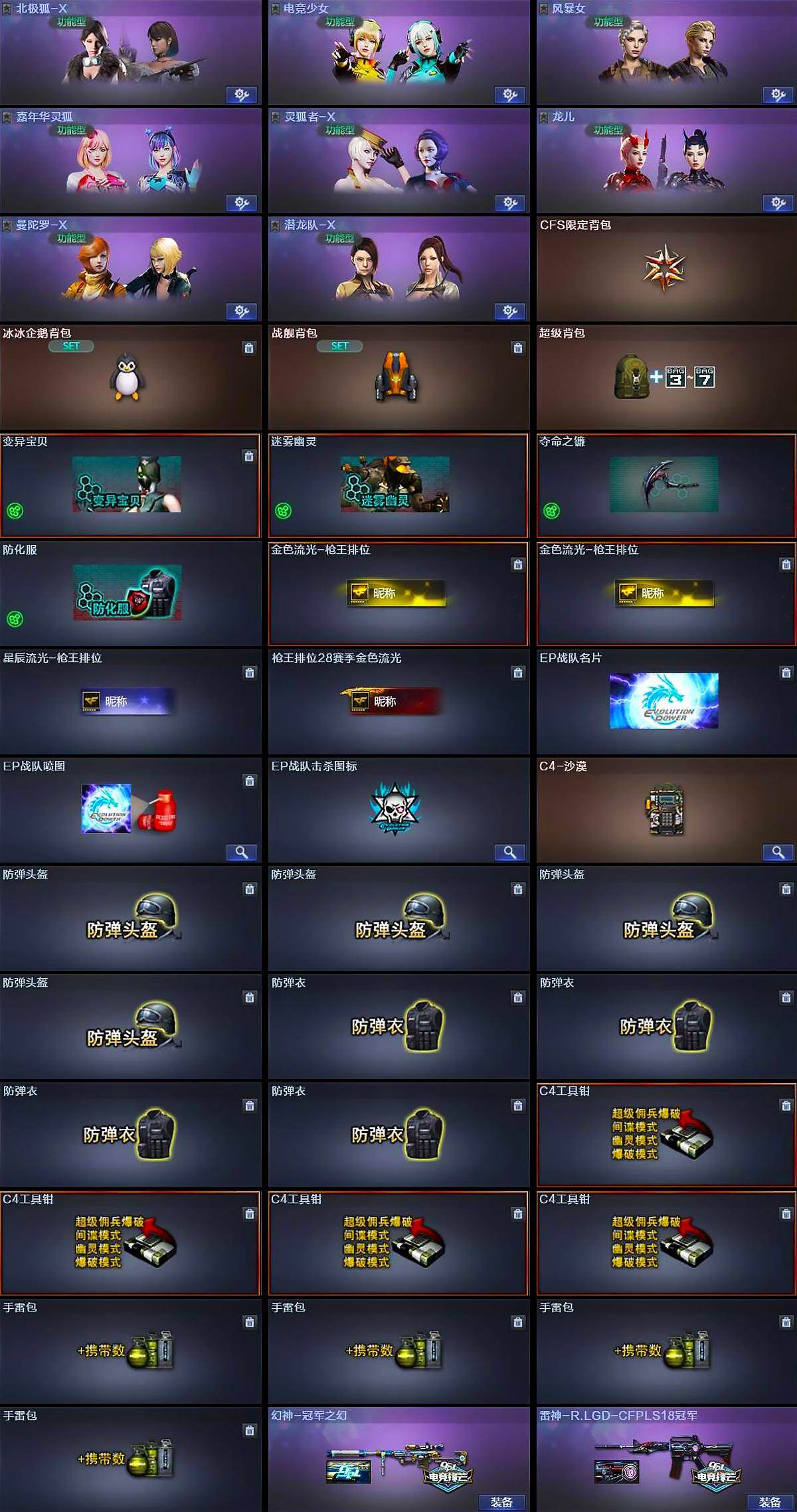 【道具】:CFS限定背包,冰冰企鹅背包,战舰背包,超级背包,变异宝贝,迷雾幽灵,夺命之镰,防化服,金色流光-枪王排位*2,星辰流光-枪王排位,枪王排位28赛季金色流光,EP战队名片,EP战队喷图,EP战队击杀图标,C4-沙漠,防弹头盔*4,防弹衣*4,C4工具钳*4,手雷包*4