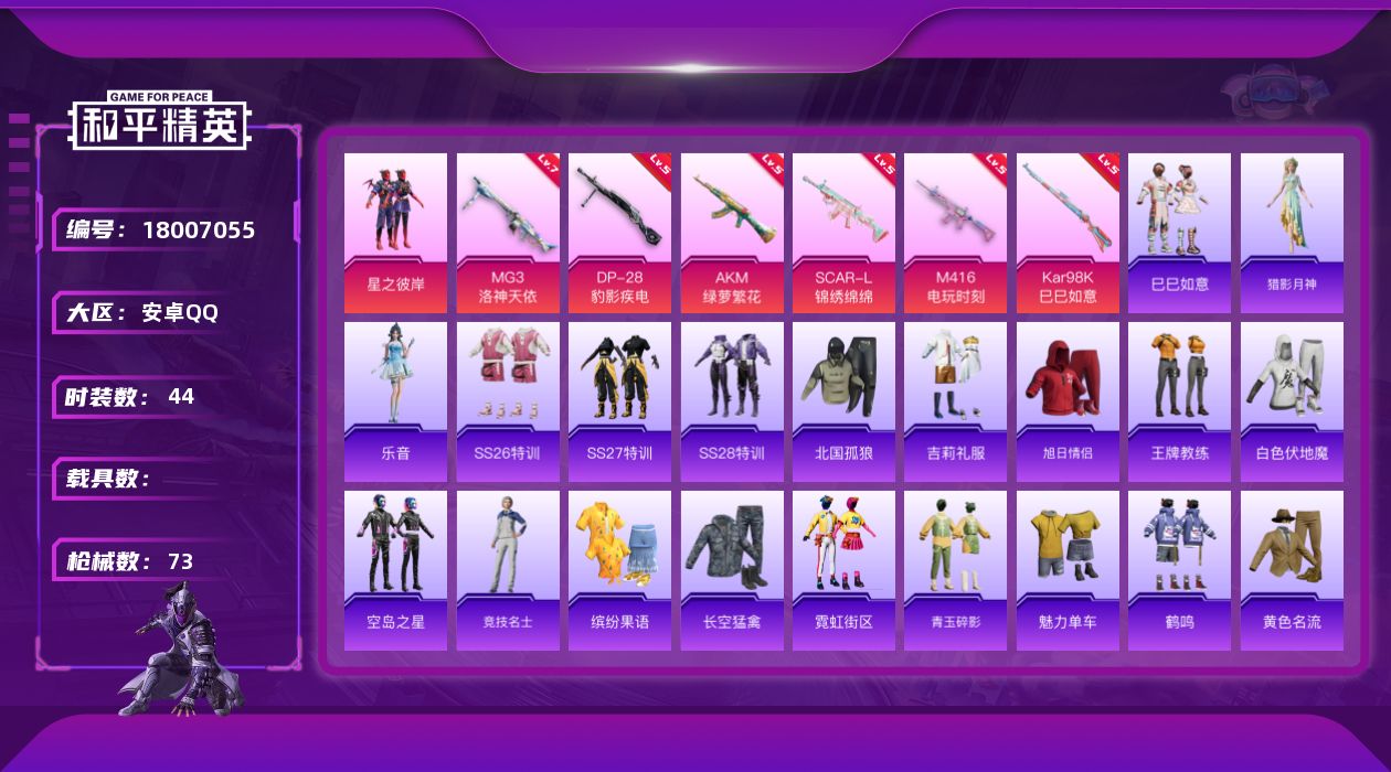 [18007055]安卓 手Q-1粉装-6特效枪-0载具-1粉色飞行器-22268热力值-4王牌印记-44套装-73枪皮 【粉色套装】:粉装-星之彼岸 【粉色枪皮等级】:AKM-绿萝繁花(五级),SCAR-L-锦绣绵绵(五级),M416-电玩时刻(五级),Kar98K-巳巳如意(五级),DP-28-豹影疾电(五级),MG3-洛神天依(七级) 【粉色枪皮】:AKM-绿萝繁花,SCAR-L-锦绣绵绵,M416-电玩时刻,Kar98K-巳巳如意,DP-28-豹影疾电,MG3-洛神天依 【粉色飞行器】:炫彩糖果飞行器 【粉色降落伞】:圣堂之誓降落伞,炫彩糖果降落伞 【稀有套装】:套装-巳巳如意,角色-猎影月神,角色-乐音 【稀有枪皮】:SCAR-L-红色方程式,M416-红色方程式,AUG-耀粉歌者,QBZ-彩虹符号,M762-第五大道,AC-VAL-天降萌叽,AC-VAL-快闪甜心,蜜獾-天降萌叽,UZI-啾咪啾咪,UMP45-生命誓言,Vector-焰鹰斗篷,Vector-生命誓言,P90-快闪甜心,Kar98K-炫彩节奏,AWM-焰鹰斗篷,AWM-圣堂之誓,SKS-糯团青竹,VSS-星之彼岸,MK20-H-快闪甜心,MK20-H-莲影清波,MK20-H-樱桃泡泡,S686-生命誓言,S12K-破晓战魂,DBS-焰鹰斗篷,DBS-圣堂之誓,DBS-幻彩电音,M249-彩虹符号,M249-莲影清波,DP-28-焰鹰斗篷,MG3-幻世战舞者,MG3-第五大道,沙漠之鹰-快闪甜心,战术弩-江南烟雨 【其他套装】:套装-SS26特训,套装-SS27特训,套装-SS28特训,套装-北国孤狼,套装-吉莉礼服,套装-旭日情侣,套装-王牌教练,套装-白色伏地魔,套装-空岛之星,套装-竞技名士,套装-缤纷果语,套装-长空猛禽,套装-霓虹街区,套装-青玉碎影,套装-魅力单车,套装-鹤鸣,套装-黄色名流,套装-快闪甜心,套装-春光漫游,套装-贝斯之夜,套装-无暇誓言,套装-明鸳圣池,套装-焰鹰斗篷,套装-幽夜迷踪,套装-幻羽潜行,角色-蝶吟花词 【营地ID】:968110724