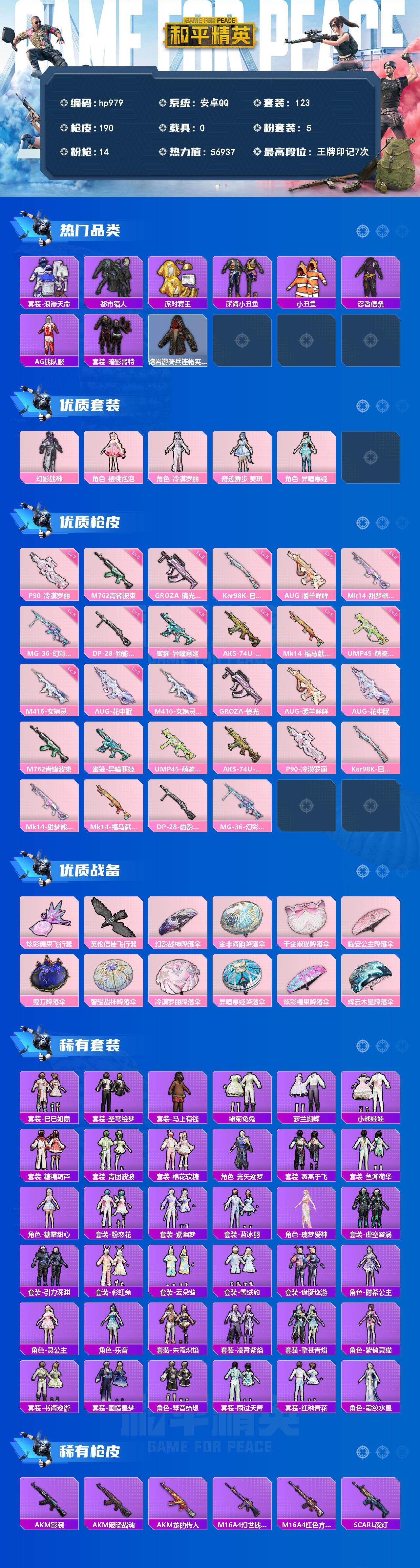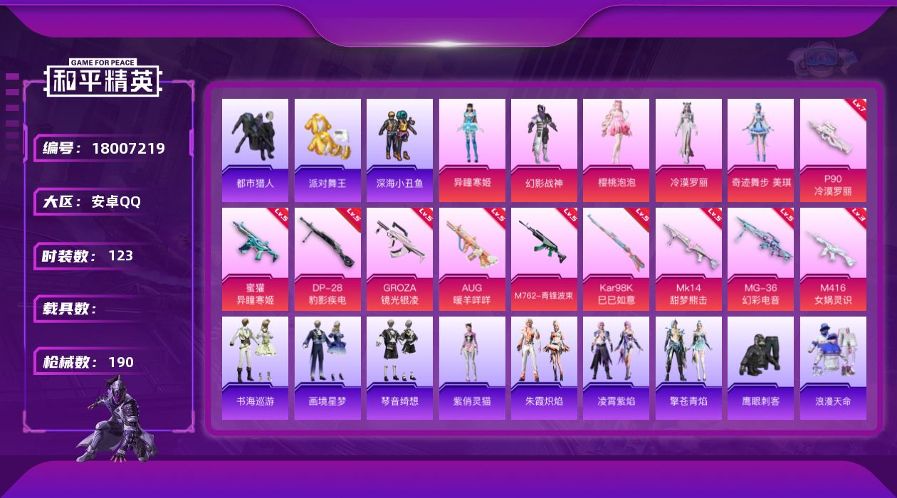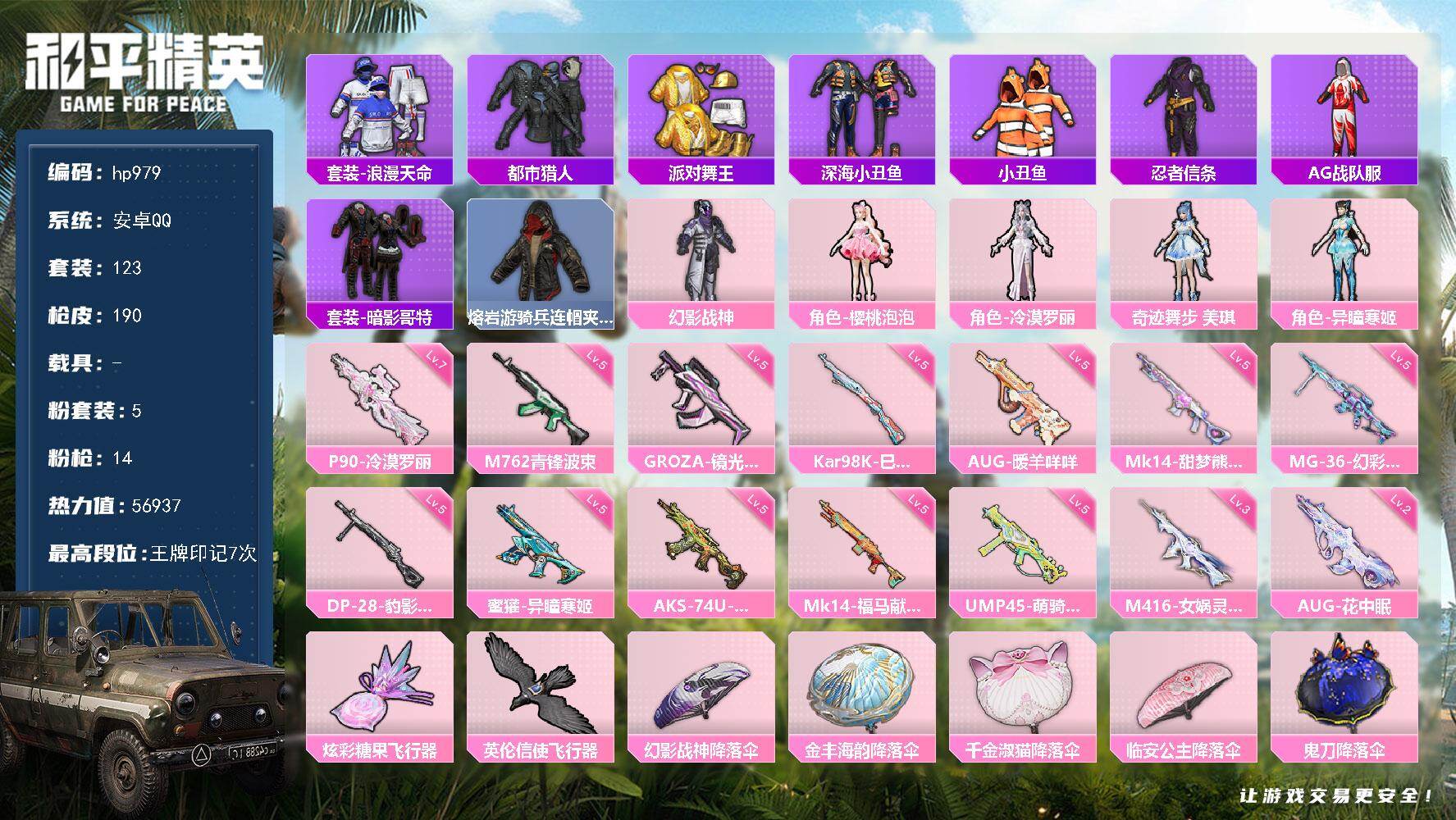 [18007219]安卓 手Q-5粉装-14特效枪-0载具-2粉色飞行器-56937热力值-7王牌印记-123套装-190枪皮
