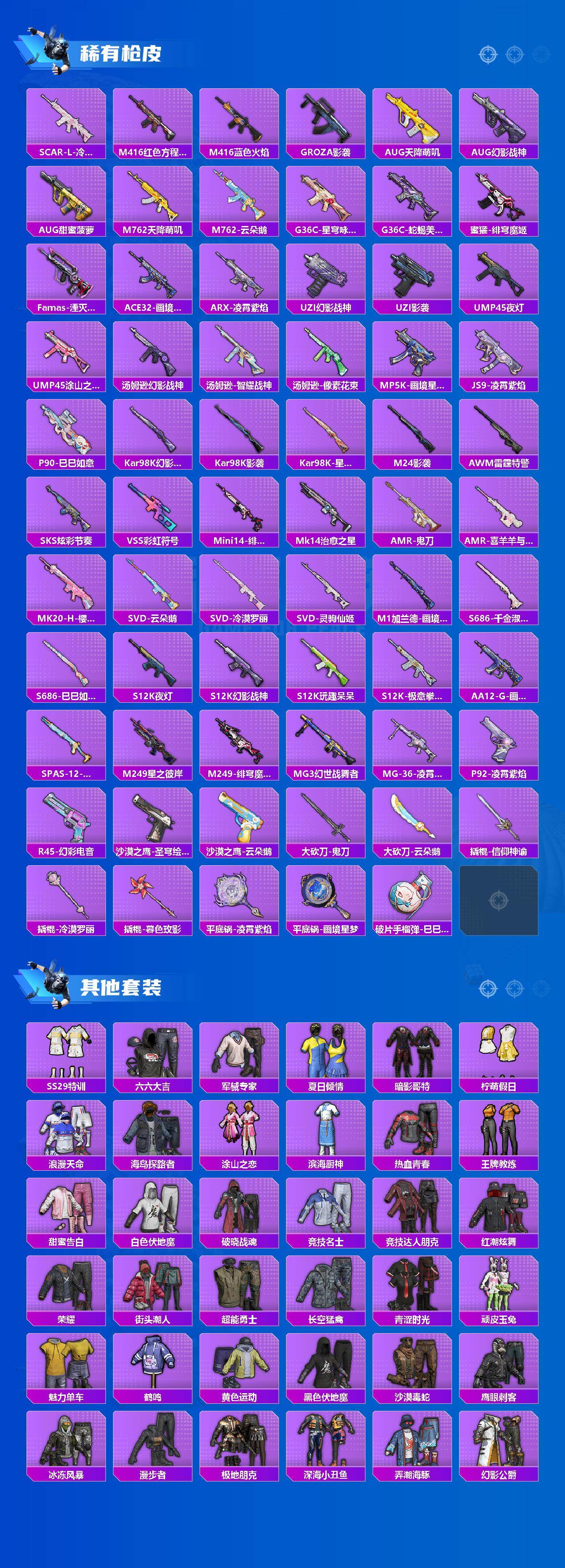 - [17455443]【特价出售/店主推荐】215m总资产-74774k哈伏币-60烽火等级-钻石-1战场等级-无军衔 【干员外观】:威龙-凌霄戍卫 【近战皮肤】:近战-处刑者1级,近战-黑鹰 【传说外观】:QBZ95-1突击步枪-凌霄戍卫,腾龙突击步枪-万金泪冠,勇士冲锋枪-万金泪冠,Mini-14射手步枪-夜莺,AWM狙击步枪-万金泪冠 【史诗外观】:K416突击步枪-阿萨拉特攻,AUG突击步枪-蝮蛇,SG552突击步枪-哈夫克警备,SCAR-H战斗步枪-囚徒,腾龙突击步枪-猎鳄行动,Vector冲锋枪-猎鳄行动,MP7冲锋枪-六套之力,QJB201轻机枪-炽焰,M14射手步枪-工业狂潮,SV-98狙击步枪-猎鳄行动 【稀有外观】:K416突击步枪-一帆风顺,SG552突击步枪-贴花艺术,SCAR-H战斗步枪-荣耀列队,MP5冲锋枪-弄臣,MP5冲锋枪-哈夫克卫队,Vector冲锋枪-先锋,SMG-45冲锋枪-前沿科技,SMG-45冲锋枪-行动开启,SMG-45冲锋枪-幻影结构,勇士冲锋枪-冰天雪地,QCQ171冲锋枪-银鹭,M1014霰弹枪-幻影结构,M249轻机枪-冰天雪地,QJB201轻机枪-哈夫克卫队,SKS射手步枪-弄臣,SV-98狙击步枪-星链科技,SV-98狙击步枪-哈夫克航天,SV-98狙击步枪-精英联盟,QSZ92G-一帆风顺,G18-前沿科技,G18-星链科技,G18-哈夫克航天 【普通外观】:M4A1突击步枪-粉色涂装,M4A1突击步枪-高雅黑,M4A1突击步枪-海色,QBZ95-1突击步枪-高雅黑,QBZ95-1突击步枪-海浪,QBZ95-1突击步枪-三角洲力量,QBZ95-1突击步枪-2026,K416突击步枪-几何迷彩,K416突击步枪-高雅黑,M16A4突击步枪-高雅黑,AUG突击步枪-浅蓝涂装,M7战斗步枪-红色涂装,M7战斗步枪-黑巧甜心,SG552突击步枪-浅蓝涂装,SG552突击步枪-海浪,SG552突击步枪-狂欢,SCAR-H战斗步枪-数码迷彩,G3战斗步枪-高雅黑,PTR-32突击步枪-黄蜂,AS Val突击步枪-黑巧甜心,P90冲锋枪-黑巧甜心,UZI冲锋枪-海色,UZI冲锋枪-狂欢,野牛冲锋枪-高雅黑,勇士冲锋枪-磐石,M1014霰弹枪-高雅黑,M1014霰弹枪-海浪,PKM通用机枪-变色龙,M249轻机枪-黄蜂,QJB201轻机枪-典