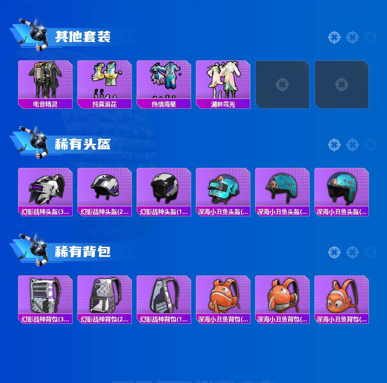 套装-都市猎人,套装-派对舞王,套装-深海小丑鱼,套装-幻影战神,角色-樱桃泡泡,套装-鹰眼刺客