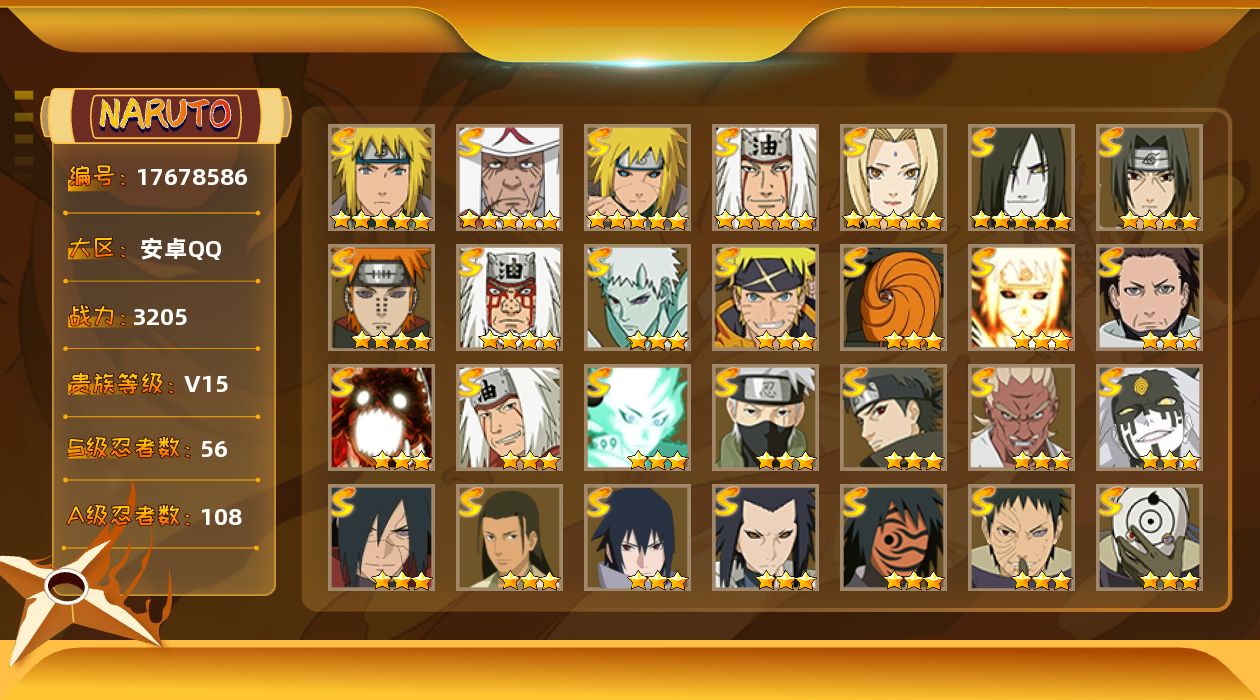 [17678586]56S级忍者数-108A级忍者数 V15,3200万战力,全忍者全装扮,本服18,战区2组,13.8万金币