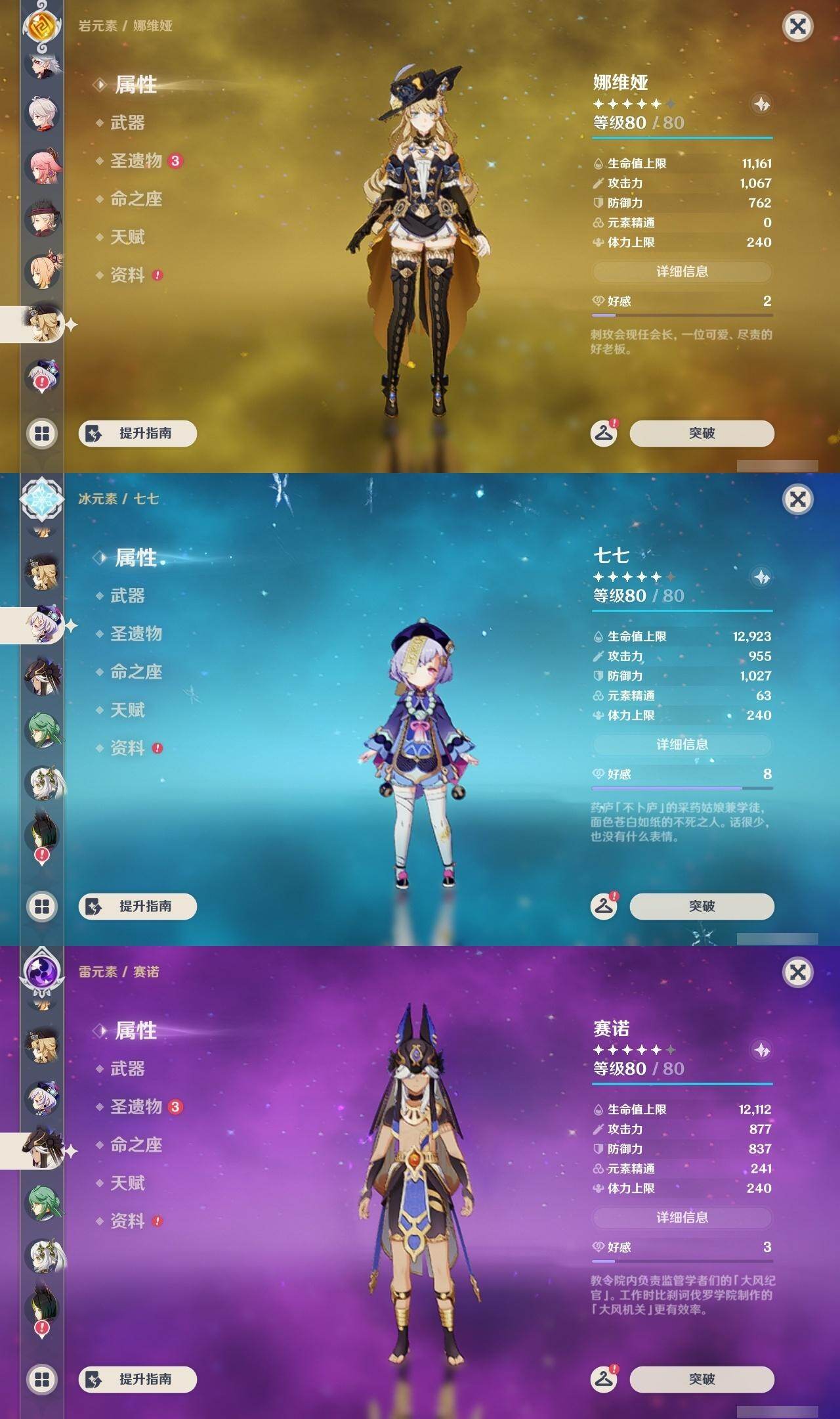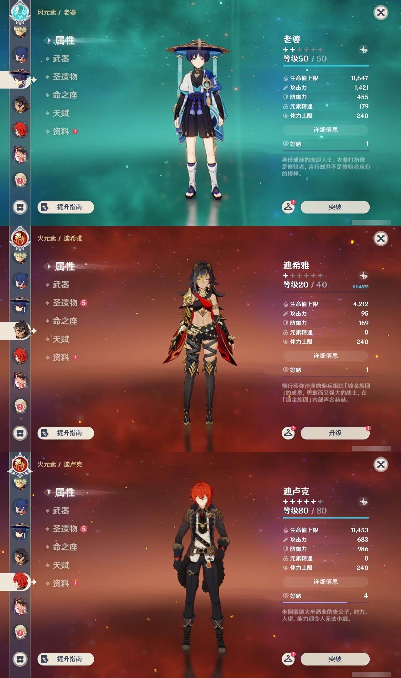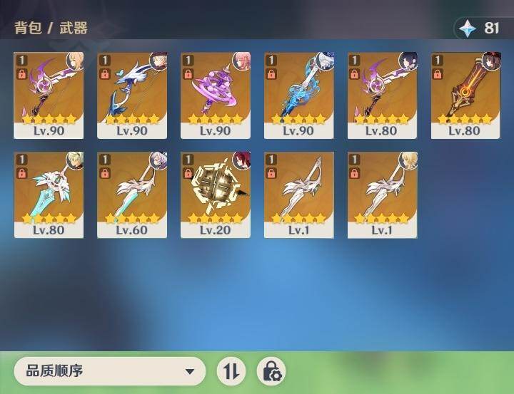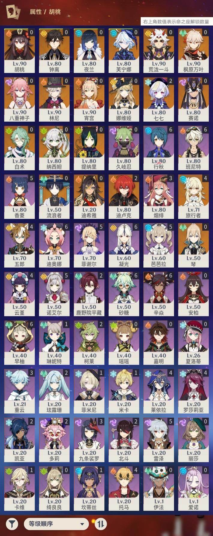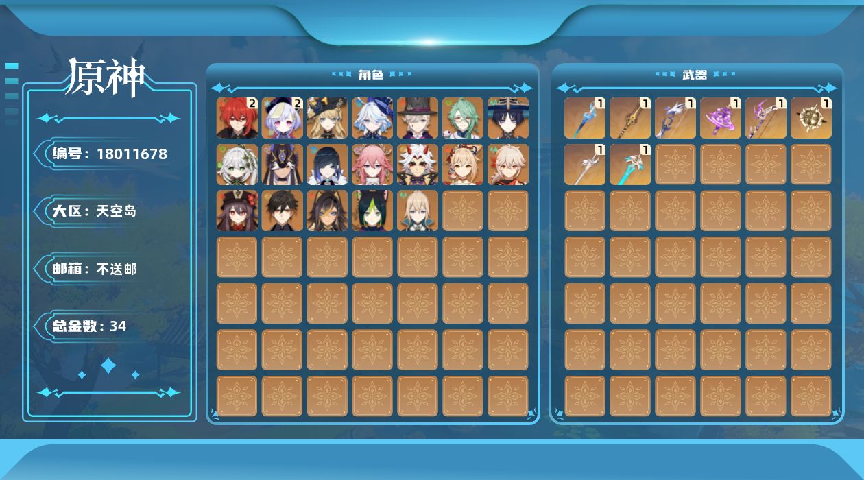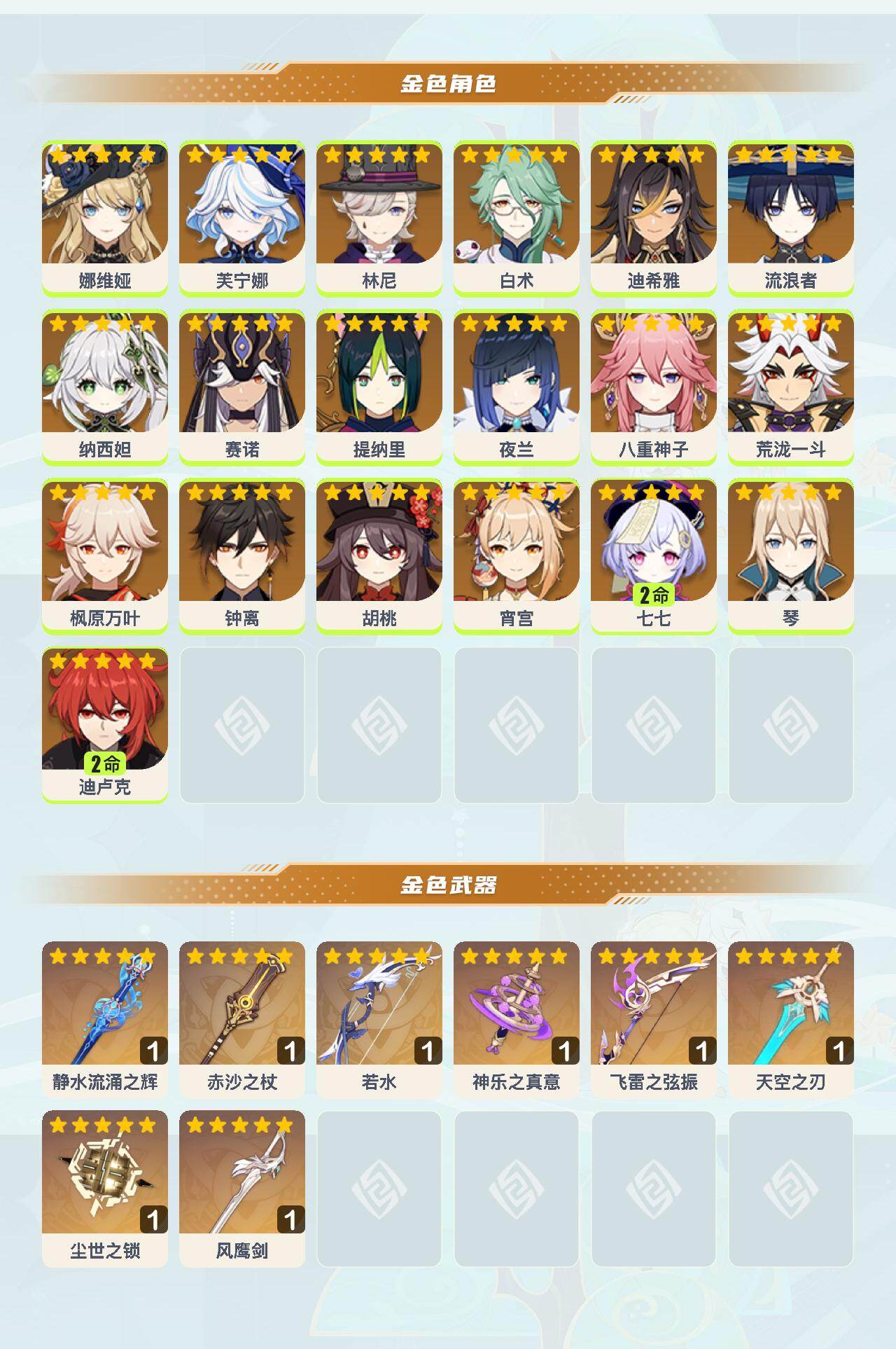0命娜维娅,0命芙宁娜,0命林尼,0命白术,0命迪希雅,0命流浪者,0命纳西妲,0命赛诺,0命提纳里,0命夜兰,0命八重神子,0命荒泷一斗,0命枫原万叶,0命钟离,0命胡桃,0命宵宫,2命七七,0命琴,2命迪卢克,精1静水流涌之辉,精1赤沙之杖,精1若水,精1神乐之真意,精1飞雷之弦振,精1天空之刃,精1尘世之锁,精1风鹰剑
