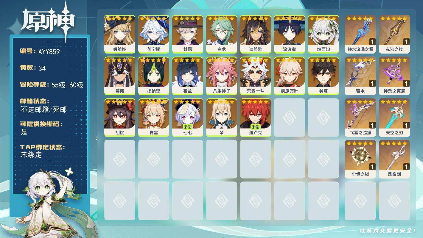 [18011678]57级/34黄/女主/19个五星角色/11个五星武器 0命娜维娅,0命芙宁娜,0命林尼,0命白术,0命迪希雅,0命流浪者,0命纳西妲,0命赛诺,0命提纳里,0命夜兰,0命八重神子,0命荒泷一斗,0命枫原万叶,0命钟离,0命胡桃,0命宵宫,2命七七,0命琴,2命迪卢克,精1静水流涌之辉,精1赤沙之杖,精1若水,精1神乐之真意,精1飞雷之弦振,精1天空之刃,精1尘世之锁,精1风鹰剑