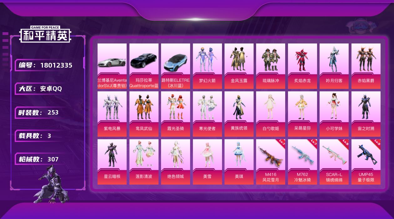 [18012335]安卓 手Q-20粉装-4特效枪-3载具-12粉色飞行器-102520热力值-12王牌印记-253套装-307枪皮