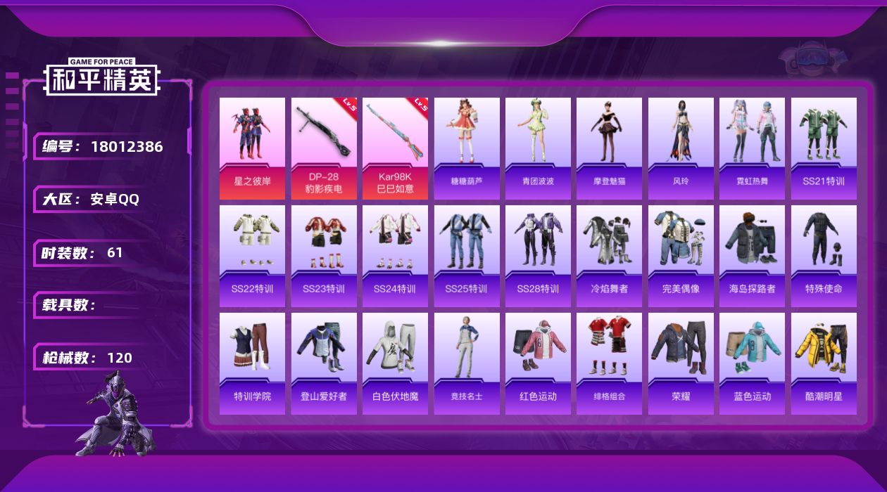 [18012386]安卓 手Q-1粉装-4特效枪-0载具-1粉色飞行器-29617热力值-1王牌印记-61套装-120枪皮 【粉色套装】:粉装-星之彼岸 【粉色枪皮等级】:ACE32-萌骑漫游(四级),Kar98K-巳巳如意(五级),Mk14-福马献瑞(五级),DP-28-豹影疾电(五级) 【粉色枪皮】:ACE32-萌骑漫游,Kar98K-巳巳如意,Mk14-福马献瑞,DP-28-豹影疾电 【粉色飞行器】:炫彩糖果飞行器 【粉色降落伞】:星之彼岸降落伞,忍者神龟降落伞,炫彩糖果降落伞 【稀有套装】:套装-雪国风尚,套装-马上有钱,套装-糖糖葫芦,套装-青团波波,角色-摩登魅猫,角色-风玲,套装-霓虹热舞 【稀有枪皮】:AKM-彩虹符号,AKM-破晓战魂,AKM-龙的传人,M16A4-蓝色火焰,SCAR-L-夜灯,SCAR-L-玉兔迎春,M416-糯团青竹,M416-红色方程式,M416-绯红前夜,M416-蓝色火焰,AUG-天降萌叽,AUG-耀粉歌者,M762-天降萌叽,M762-彩虹符号,AC-VAL-天降萌叽,蜜獾-垂柳戏鸭,蜜獾-天降萌叽,蜜獾-娇憨猪猪,UZI-天降萌叽,UZI-娇憨猪猪,UMP45-夜灯,UMP45-蓝色火焰,Vector-生命誓言,汤姆逊-天降萌叽,P90-甜蜜旋律,Kar98K-红色方程式,SKS-糯团青竹,Mini14-梦幻火箭,Mini14-耀粉歌者,Mk14-治愈之星,SLR-娇憨猪猪,AMR-妙红点点,M417-惊鸿侠骨,M200-惊鸿侠骨,S686-彩虹符号,S1897-炫彩节奏,S12K-玩趣呆呆,S12K-破晓战魂,S12K-夜灯,S12K-娇憨猪猪,M249-彩虹符号,M249-糯团青竹,MG3-幻世战舞者,MG3-惊鸿侠骨,蝎式手枪-千金淑猫,爆炸猎弓-惊鸿侠骨,破片手榴弹-巳巳如意 【其他套装】:套装-SS21特训,套装-SS22特训,套装-SS23特训,套装-SS24特训,套装-SS25特训,套装-SS28特训,套装-冷焰舞者,套装-完美偶像,套装-海岛探路者,套装-特殊使命,套装-特训学院,套装-登山爱好者,套装-白色伏地魔,套装-竞技名士,套装-红色运动,套装-绯格组合,套装-荣耀,套装-蓝色运动,套装-酷潮明星,套装-长空猛禽,套装-魅力单车,套装-麻辣教官,套装-黄色伏地魔,套装-黄色运动,套装-黑色伏地魔,套装-龙的传人,
