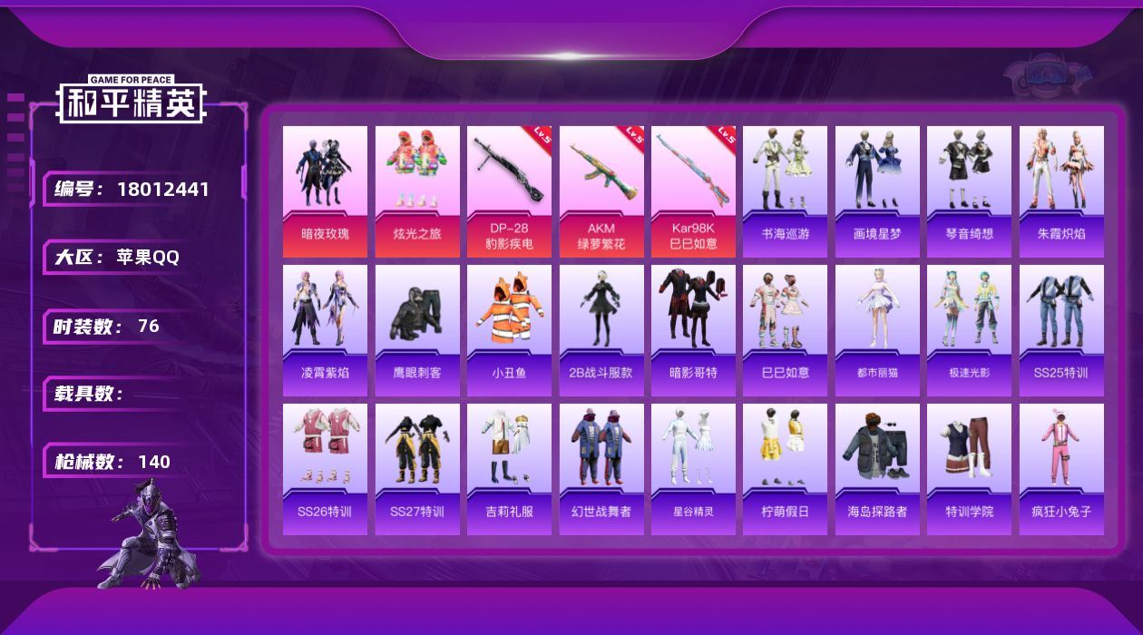 [18012441]苹果 手Q-2粉装-6特效枪-0载具-1粉色飞行器-35632热力值-3王牌印记-76套装-140枪皮 【热门品类】:套装-小丑鱼,角色-2B战斗服款,套装-暗影哥特 【粉色套装】:粉装-暗夜玫瑰,粉装-炫光之旅 【粉色枪皮等级】:AKM-绿萝繁花(五级),AKM-暮色玫影(三级),UMP45-萌骑冒险(三级),Kar98K-巳巳如意(五级),Mk14-福马献瑞(五级),DP-28-豹影疾电(五级) 【粉色枪皮】:AKM-绿萝繁花,AKM-暮色玫影,UMP45-萌骑冒险,Kar98K-巳巳如意,Mk14-福马献瑞,DP-28-豹影疾电 【粉色飞行器】:云梦轻舟飞行器 【粉色降落伞】:环太平洋降落伞,暗夜鎏金降落伞,精灵梦叶罗丽降落伞,魔童闹海 敖丙降落伞,暮色玫影降落伞 【稀有套装】:套装-巳巳如意,套装-雪国风尚,套装-马上来财,角色-都市丽猫,套装-极速光影,套装-朱霞炽焰,套装-凌霄紫焰,套装-书海巡游,套装-画境星梦,套装-琴音绮想,角色-馥郁金蕊,套装-雨过天青,套装-红釉青花 【稀有枪皮】:AKM-影袭,AKM-灼热熔岩,AKM-破晓战魂,AKM-龙的传人,M16A4-幻世战舞者,M16A4-红色方程式,M16A4-蓝色火焰,SCAR-L-夜灯,SCAR-L-炫彩节奏,SCAR-L-红色方程式,M416-糯团青竹,M416-红色方程式,M416-蓝色火焰,GROZA-2B战斗服款,GROZA-影袭,GROZA-紫翼圣骑,AUG-耀粉歌者,QBZ-彩虹符号,QBZ-飞驰魅影,M762-天降萌叽,M762-第五大道,AC-VAL-天降萌叽,蜜獾-天降萌叽,蜜獾-绯穹魔姬,ACE32-画境星梦,ARX-凌霄紫焰,UZI-啾咪啾咪,UZI-天降萌叽,UZI-影袭,UZI-红色方程式,UMP45-夜灯,UMP45-生命誓言,UMP45-蓝色火焰,Vector-彩虹符号,汤姆逊-天降萌叽,汤姆逊-耀粉歌者,汤姆逊-像素花束,MP5K-画境星梦,JS9-凌霄紫焰,P90-飞驰魅影,P90-巳巳如意,Kar98K-2B战斗服款,Kar98K-影袭,Kar98K-洛神天依,Kar98K-红色方程式,Kar98K-飞驰魅影,M24-影袭,M24-炫彩节奏,AWM-暮色玫影,SKS-炫彩节奏,SKS-糯团青竹,VSS-星之彼岸,Mini14-梦幻火箭,Mini14-炫彩节奏