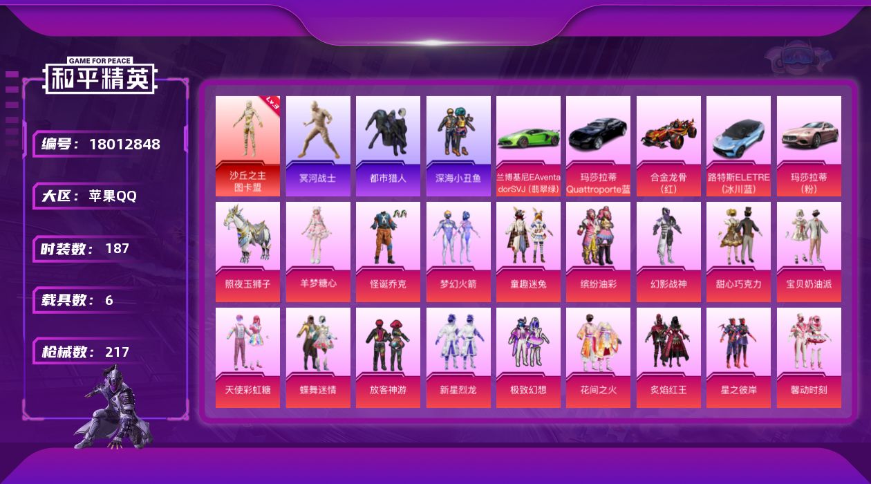 - [17507725]苹果 手Q-7粉装-2特效枪-2载具-1粉色飞行器-40016热力值-4王牌印记-80套装-112枪皮 【热门品类】:角色-军刀雅典娜,套装-龟仙人,角色-Mark.06 【粉色套装】:粉装-绚金战神,角色-洛天依,粉装-寒光使者,粉装-傲傲奶龙,角色-美雪,角色-引力星,角色-守护天翼 【粉色枪皮等级】:M416-五爪金龙(七级),MG3-洛神天依(七级) 【粉色载具】:路特斯EVIJA(星际黄),海龙奔腾 【粉色枪皮】:M416-五爪金龙,MG3-洛神天依 【粉色飞行器】:星夜魔法师飞行翼 【粉色降落伞】:洛神天依降落伞,青春物语降落伞,筑梦精灵降落伞,炙焰牛王降落伞,圣光天使降落伞,闪光银龙降落伞,垂柳戏鸭降落伞,暗夜鎏金降落伞,第五大道降落伞,龙行天下降落伞,圣堂之誓降落伞,千金淑猫降落伞,樱桃泡泡降落伞 【稀有套装】:套装-龟仙人 【稀有枪皮】:AKM-江南烟雨,AKM-王牌投手,AKM-环太平洋,AKM-筑梦精灵,AKM-龙的传人,M16A4-幻世战舞者,M16A4-甜心亚梦,SCAR-L-炫彩节奏,SCAR-L-玉兔迎春,M416-糯团青竹,GROZA-田园牧歌,AUG-天降萌叽,AUG-青春冒险家,QBZ-彩虹符号,QBZ-洛神天依,M762-天降萌叽,M762-彩虹符号,Mk47-洛神天依,G36C-青丘仙客,AC-VAL-天降萌叽,AC-VAL-快闪甜心,AC-VAL-甜心亚梦,AC-VAL-闲梦青缨,蜜獾-天降萌叽,蜜獾-娇憨猪猪,UZI-天降萌叽,UZI-娇憨猪猪,UMP45-诡娃娃,UMP45-绒宝小鹅,Vector-焰鹰斗篷,Vector-彩虹符号,Vector-田园牧歌,Vector-音爆索尼克,汤姆逊-天降萌叽,汤姆逊-炫彩节奏,P90-快闪甜心,P90-筑梦精灵,Kar98K-洛神天依,Kar98K-王子的夏天,M24-炫彩节奏,AWM-焰鹰斗篷,SKS-炫彩节奏,SKS-糯团青竹,VSS-田园牧歌,Mini14-海渊国主,Mini14-炫彩节奏,Mini14-筑梦精灵,Mini14-金玉无双,Mk14-治愈之星,SLR-娇憨猪猪,SLR-彩虹符号,M417-惊鸿侠骨,MK20-H-快闪甜心,M200-惊鸿侠骨,S686-王牌投手,S686-生命誓言,S1897-炫彩节奏,S12K-玩趣呆呆,S12K-娇憨猪猪,S12K-幻世战舞