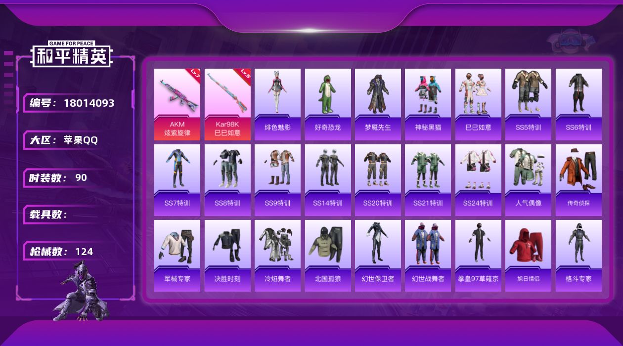 [18014093]苹果 手Q-0粉装-4特效枪-0载具-0粉色飞行器-34849热力值-1王牌印记-90套装-124枪皮 【粉色枪皮等级】:AKM-炫紫旋律(七级),ACE32-萌骑漫游(三级),Kar98K-巳巳如意(五级),Mk14-福马献瑞(五级) 【粉色枪皮】:AKM-炫紫旋律,ACE32-萌骑漫游,Kar98K-巳巳如意,Mk14-福马献瑞 【粉色降落伞】:第五大道降落伞,异瞳寒姬降落伞 【稀有套装】:套装-巳巳如意,套装-马上有钱,角色-绯色魅影,套装-雨过天青,套装-红釉青花 【稀有枪皮】:AKM-夜灯,AKM-灼热熔岩,AKM-玉龙,AKM-生命誓言,AKM-锦绣火鲤,M16A4-红色方程式,SCAR-L-夜灯,SCAR-L-炫彩节奏,SCAR-L-玉兔迎春,M416-糯团青竹,M416-红色方程式,M416-蓝色火焰,GROZA-生命誓言,AUG-幻影战神,AUG-耀粉歌者,QBZ-彩虹符号,QBZ-神秘黑猫,QBZ-诡娃娃,M762-拳皇97,M762-诡娃娃,G36C-荒野猎神,G36C-星穹咏叹调,AC-VAL-天降萌叽,UZI-众神之王,UZI-啾咪啾咪,UMP45-夜灯,UMP45-荒野猎神,UMP45-诡娃娃,UMP45-极意拳锋,Vector-彩虹符号,汤姆逊-天降萌叽,汤姆逊-奇异狩猎者,MP5K-众神之王,P90-巳巳如意,Kar98K-彩虹符号,Kar98K-红色方程式,M24-众神之王,M24-冰封烈焰,SKS-夜灯,SKS-炫彩节奏,SKS-诡娃娃,VSS-荒野猎神,Mini14-炫彩节奏,Mini14-生命誓言,SLR-众神之王,S686-冰封烈焰,S686-生命誓言,S1897-炫彩节奏,S12K-破晓战魂,S12K-夜灯,S12K-幻世战舞者,S12K-极意拳锋,DBS-彩虹符号,DBS-第五大道,M249-拳皇97,M249-星之彼岸,M249-糯团青竹,MG3-幻世战舞者,P92-拳皇97,P1911-冰封烈焰 【其他套装】:套装-SS5特训,套装-SS6特训,套装-SS7特训,套装-SS8特训,套装-SS9特训,套装-SS14特训,套装-SS20特训,套装-SS21特训,套装-SS24特训,套装-人气偶像,套装-传奇侦探,套装-军械专家,套装-决胜时刻,套装-冷焰舞者,套装-北国孤狼,套装-好奇恐龙,套装-幻世保卫者,套装-幻世