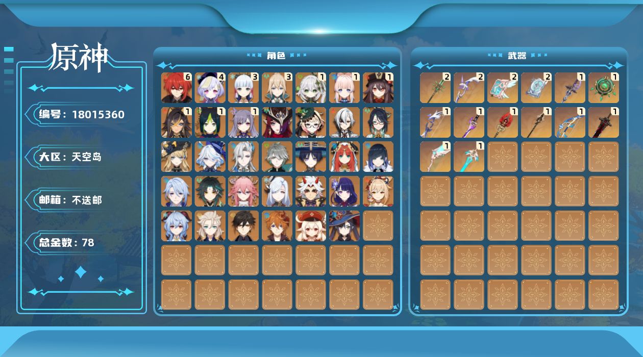 0命阿蕾奇诺,0命闲云,0命娜维娅,0命芙宁娜,0命那维莱特,1命迪希雅,0命艾尔海森,0命流浪者,1命纳西妲,0命妮露,1命提纳里,0命夜兰,0命神里绫人,0命八重神子,0命申鹤,0命荒泷一斗,0命雷电将军,3命神里绫华,0命钟离,1命胡桃,0命甘雨,0命魈,0命宵宫,0命可莉,0命达达利亚,0命阿贝多,1命珊瑚宫心海,1命刻晴,4命七七,3命琴,0命莫娜,满命迪卢克,0命艾梅莉埃,0命恰斯卡,精1赦罪,精1碧落之珑,精1若水,精1终末嗟叹之诗,精1雾切之回光,精1护摩之杖,精2四风原典,精2和璞鸢,精1贯虹之槊,精1天空之翼,精2阿莫斯之弓,精1天空之刃,精2天空之卷,精1狼的末路