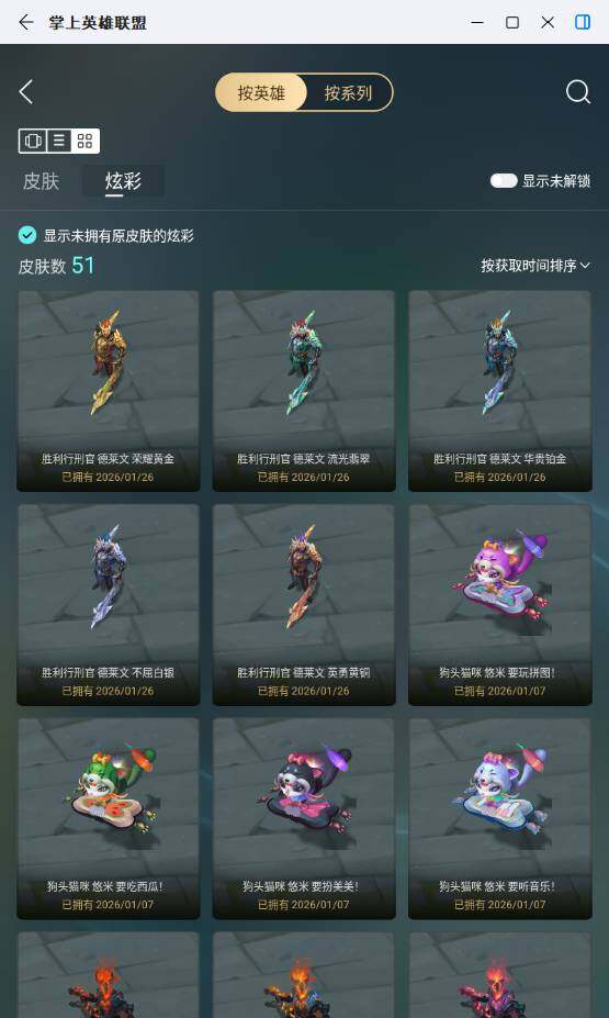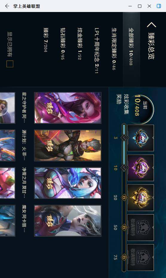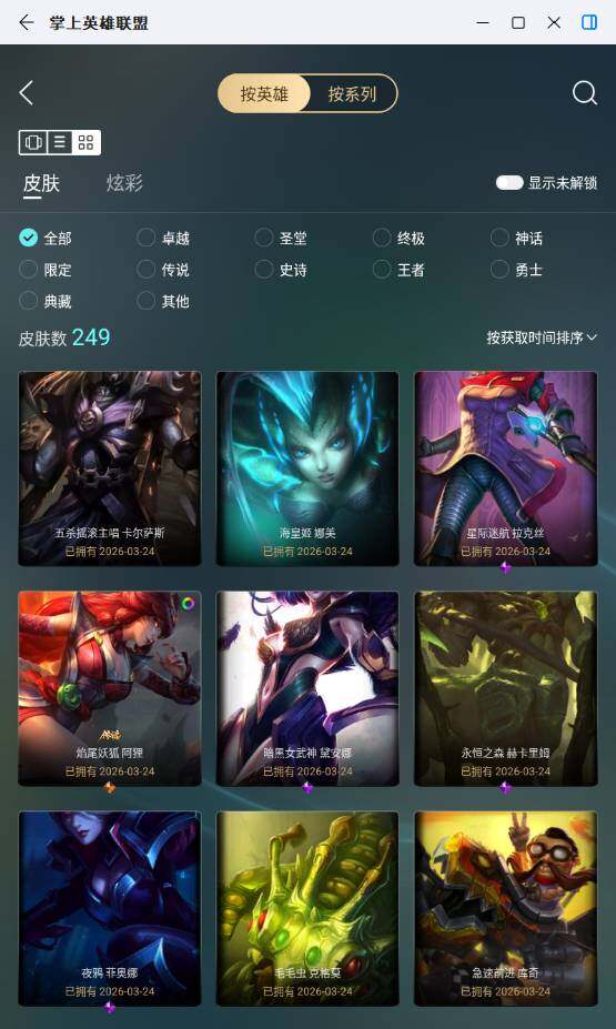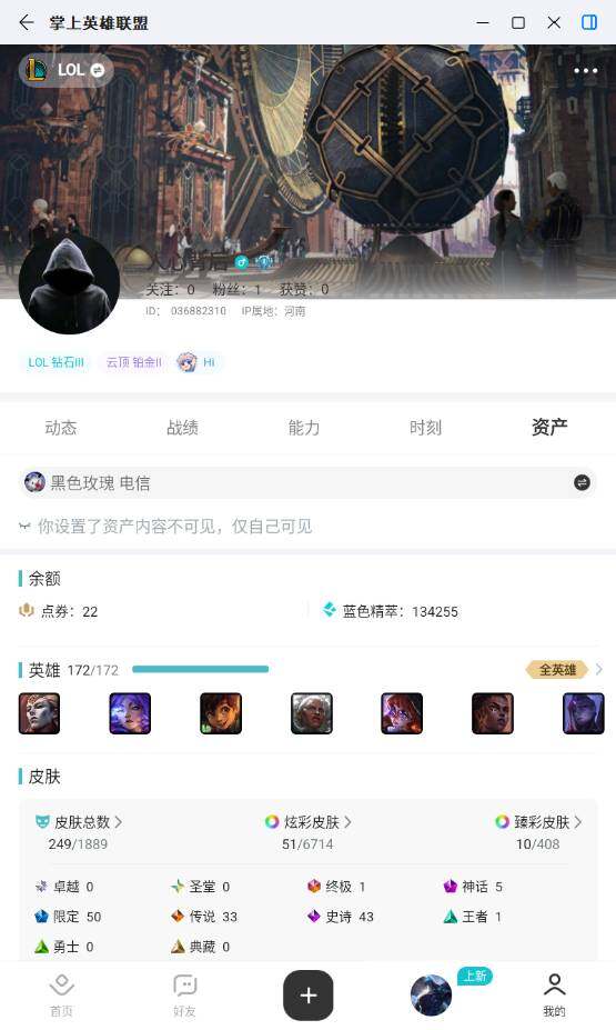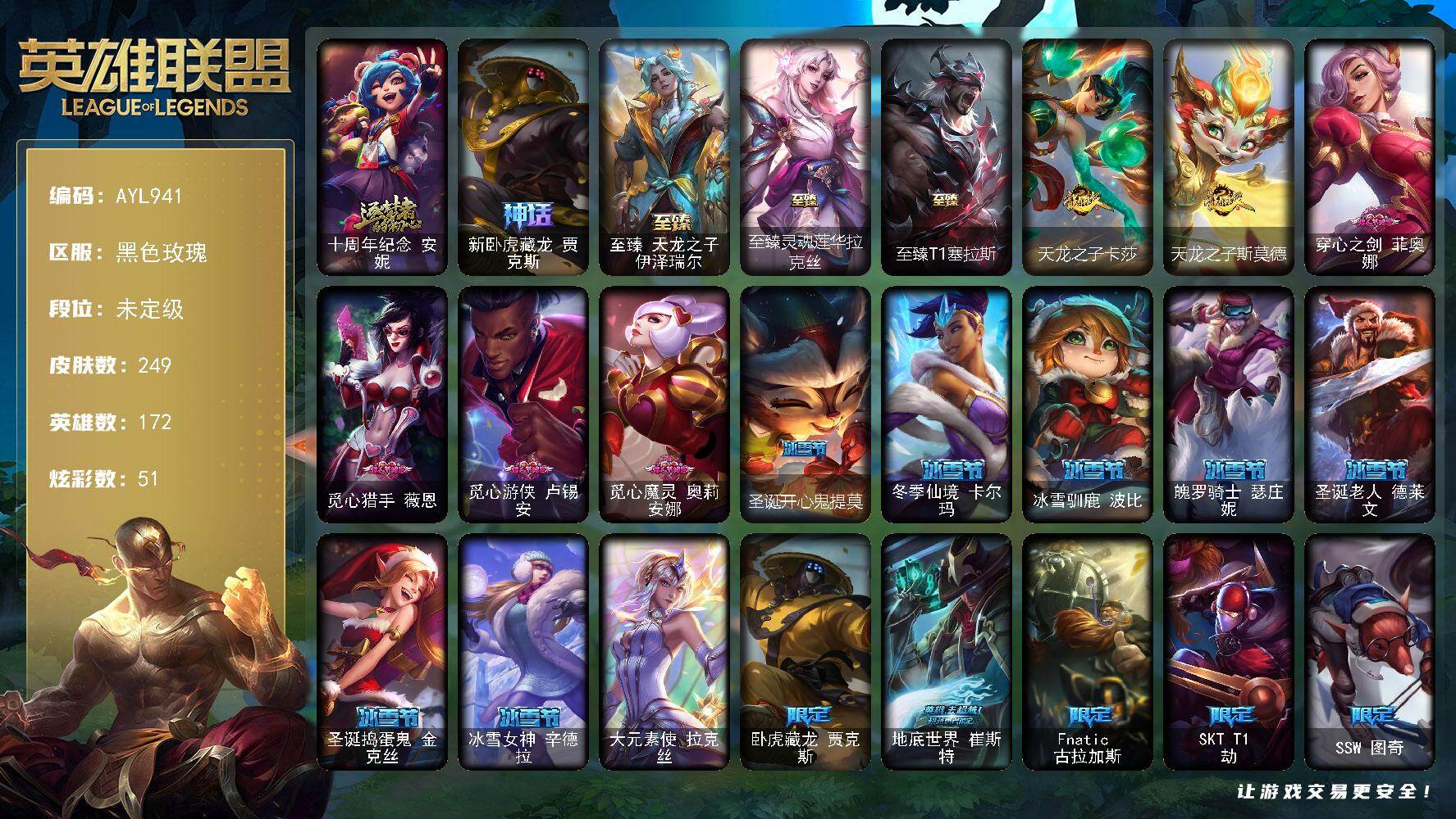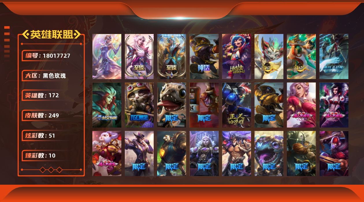 未定级段位-172英雄-249皮肤-51炫彩-1终极-5神话-50限定-33传说-43史诗